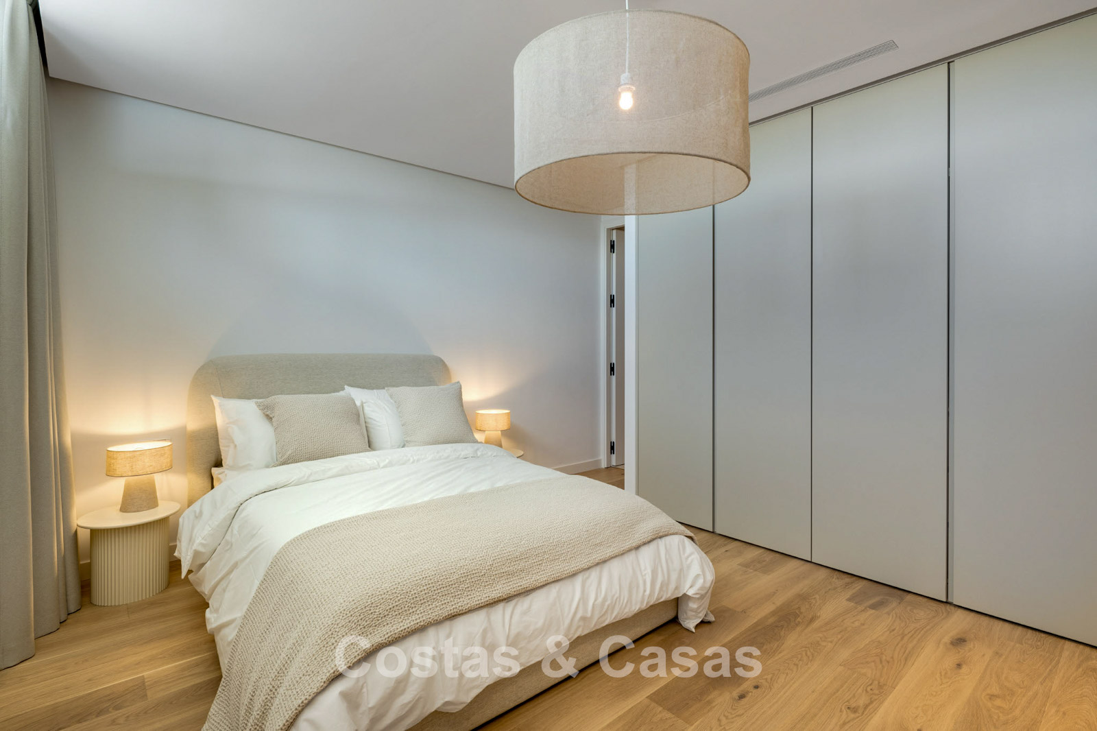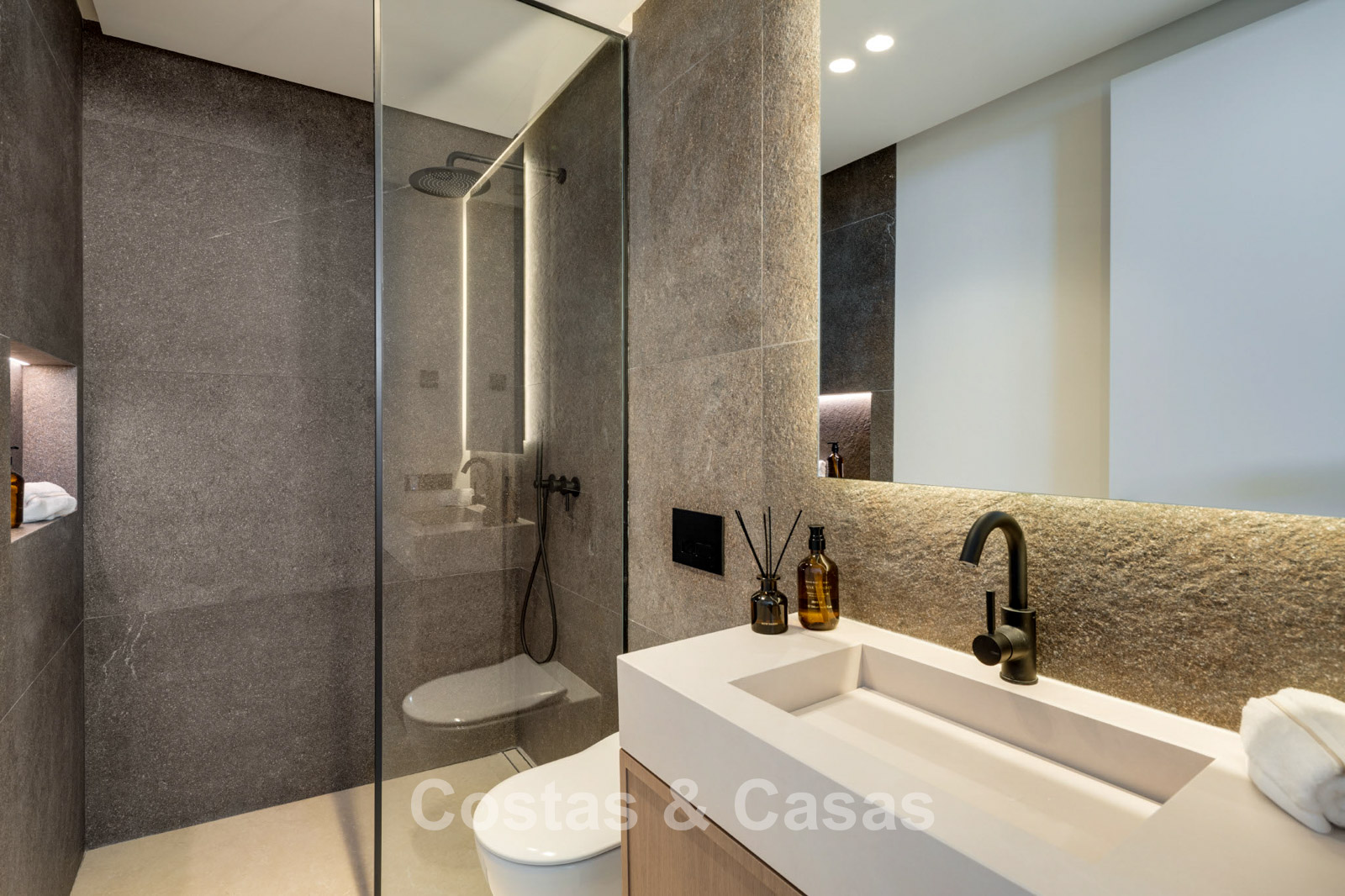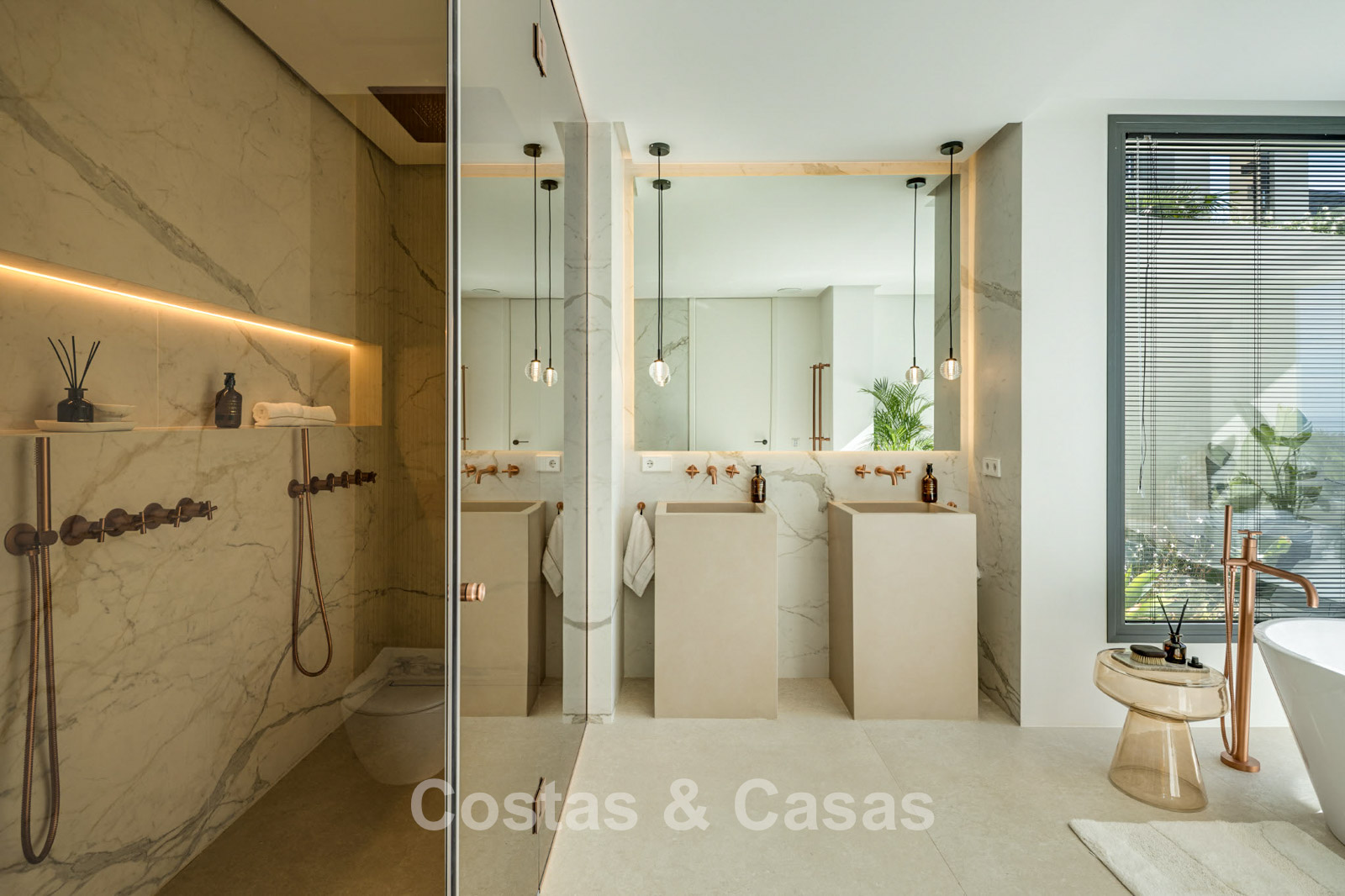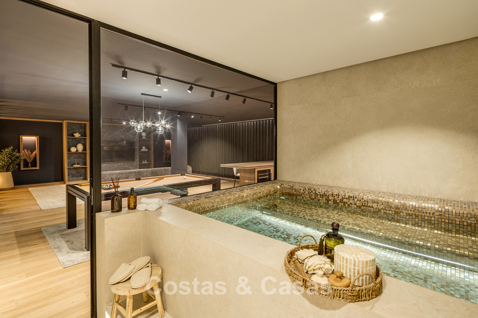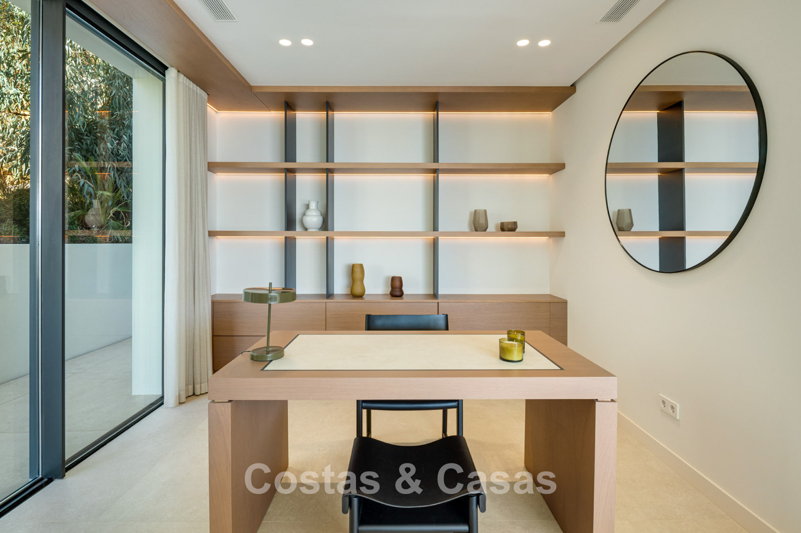 Detached villa with high-end luxury architecture. Using high-quality materials and high-quality brands including Siemens and Gaggenau. The open plan layout and large windows enhance the sense of space and seamlessly connect the interior with the surrounding terraces. Bright, central living room with a living area and integrated dining area. Practically designed kitchen/diner with a minimalist design and fully equipped with top-of-the-line appliances and a seating island. A second "dirty kitchen" with an adjoining fully equipped laundry room. A private home office. 5 bedrooms, 6 bathrooms, and a guest toilet. On the lower floor, you'll find an exclusive entertainment area with a chic home cinema, a statement wine wall, a stylish pool table, and an elegant bar perfect for cozy evenings. Adjacent is a spa area with a jacuzzi, hammam, and private bathroom. Utility room/storage room. Oak floors and large, high-quality porcelain floors. Private parking for 2 cars.