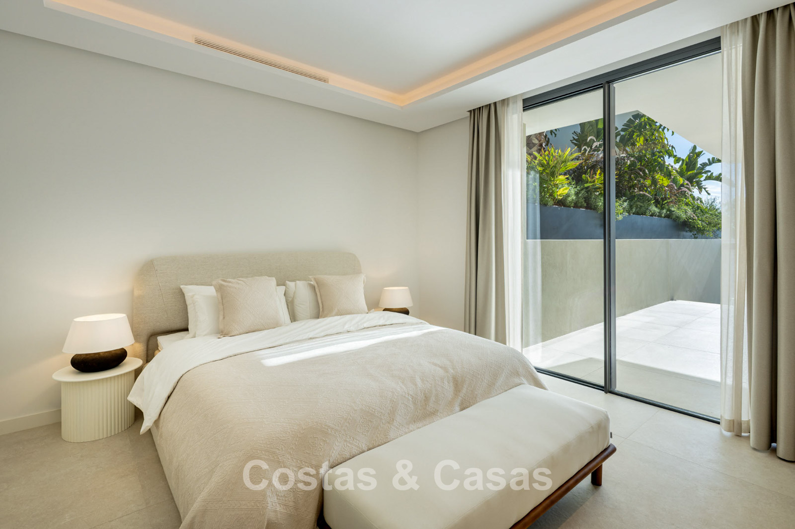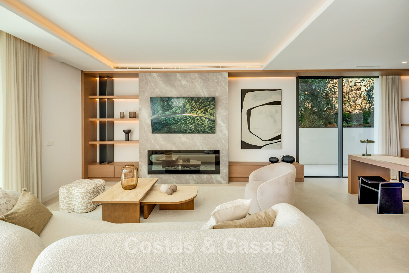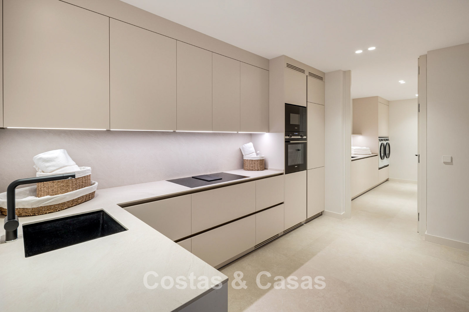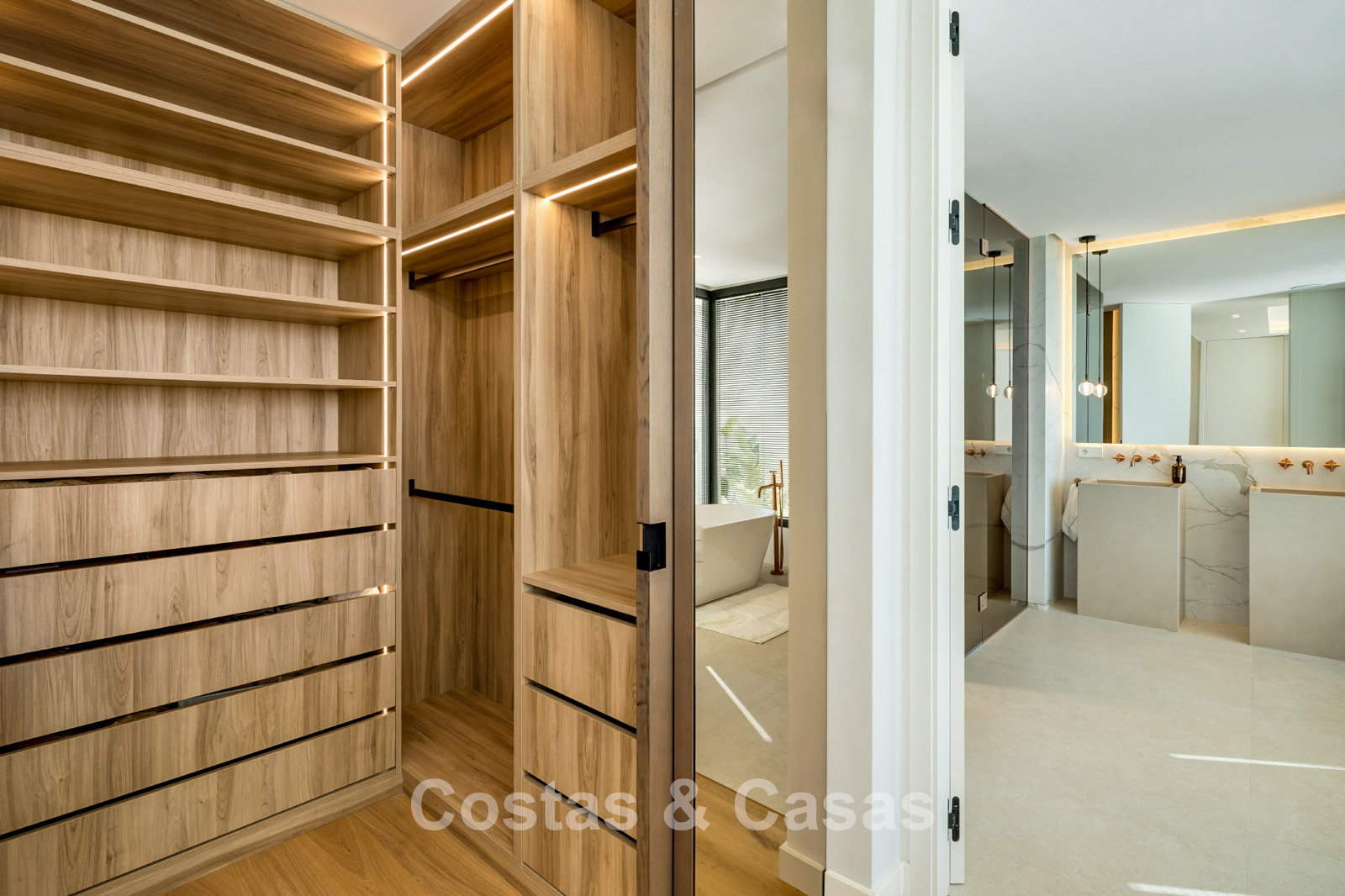 Detached villa with high-end luxury architecture. Using high-quality materials and high-quality brands including Siemens and Gaggenau. The open plan layout and large windows enhance the sense of space and seamlessly connect the interior with the surrounding terraces. Bright, central living room with a living area and integrated dining area. Practically designed kitchen/diner with a minimalist design and fully equipped with top-of-the-line appliances and a seating island. A second "dirty kitchen" with an adjoining fully equipped laundry room. A private home office. 5 bedrooms, 6 bathrooms, and a guest toilet. On the lower floor, you'll find an exclusive entertainment area with a chic home cinema, a statement wine wall, a stylish pool table, and an elegant bar perfect for cozy evenings. Adjacent is a spa area with a jacuzzi, hammam, and private bathroom. Utility room/storage room. Oak floors and large, high-quality porcelain floors. Private parking for 2 cars.