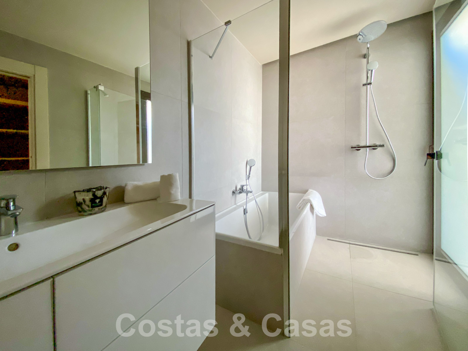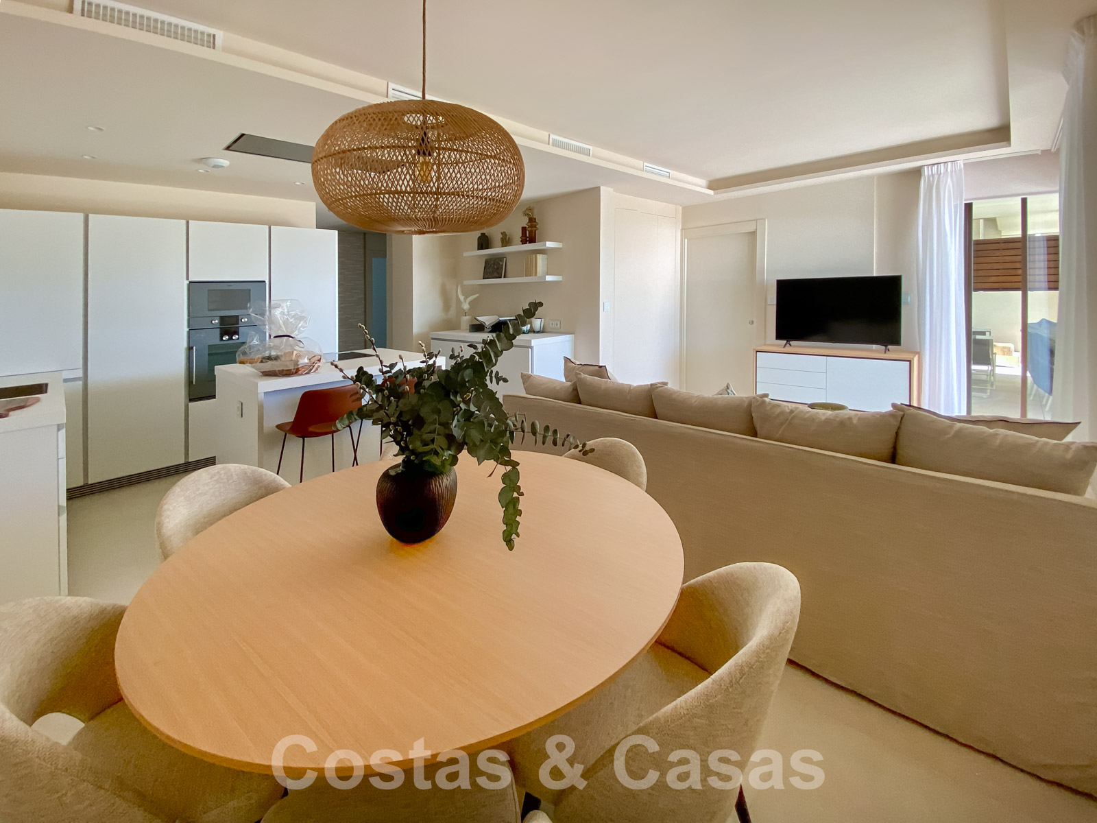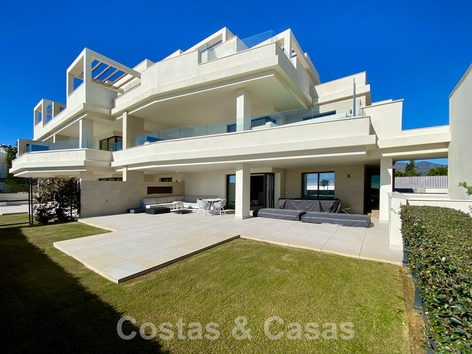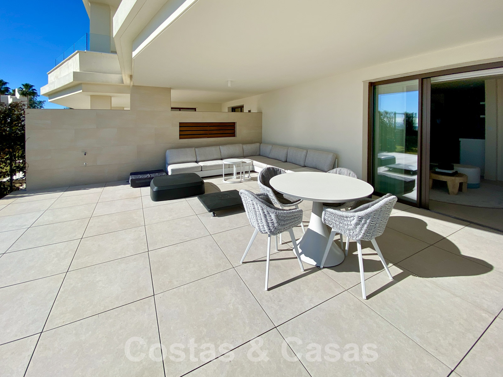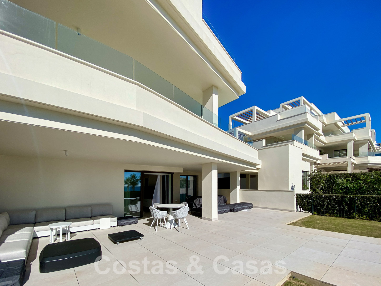 Ground floor apartment with private garden in a recently built complex. The private garden is fully fenced. Spacious, semi-covered terrace equipped with a lounge and dining table. Living area with open plan layout. Fully fitted kitchen with top appliances and a cooking island where you can have breakfast. TV lounge and integrated dining area. Large windows provide plenty of light. A total of 3 bedrooms and 3 bathrooms. The master bedroom provides an en-suite bathroom and enjoys views of the terrace and the Mediterranean Sea. Large, cream-coloured quality floors. Includes storage room and 2 underground garage spaces.