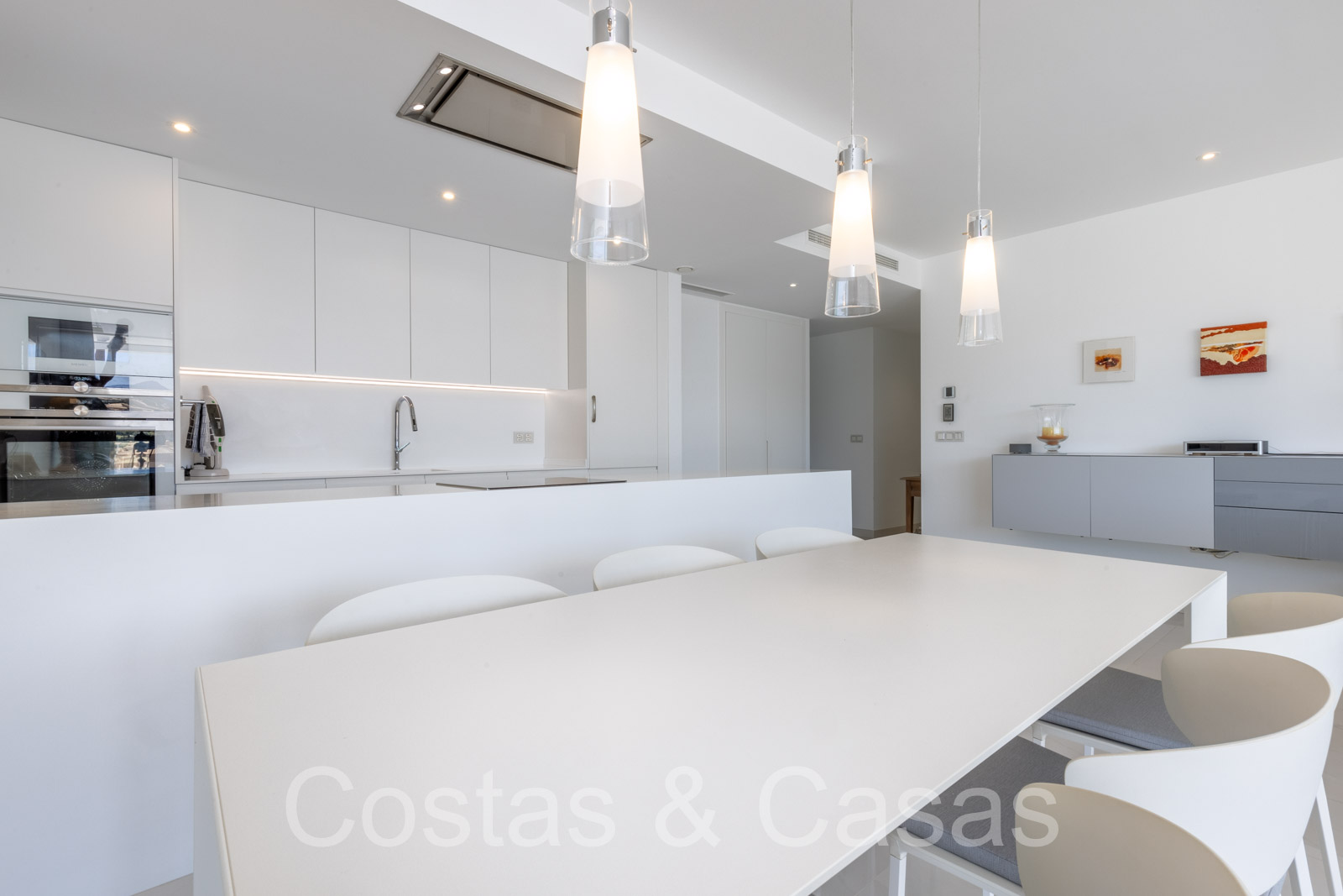 Light aluminium sliding windows from floor to ceiling and a spacious semi-open corner terrace. Recessed window profiles for an almost seamless transition between inside and outside. In the corner apartment, the sliding windows can be opened to create a completely open corner and the indoor and outdoor space merge into one whole. Overhanging floating terrace. Porcelain tile floors. Frameless glass balustrades. Indirect LED lighting on the terrace. Open plan kitchen from Porcelanosa. Kitchen island with KRION worktop. Ceiling extractor. Utility room with shelves and a Siemens washing machine and dryer.