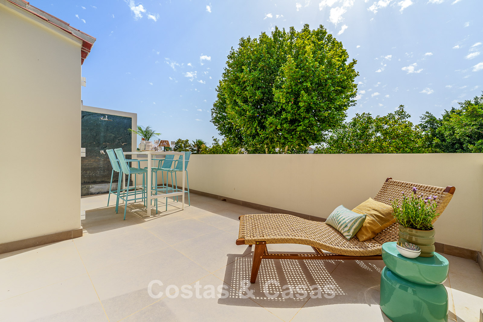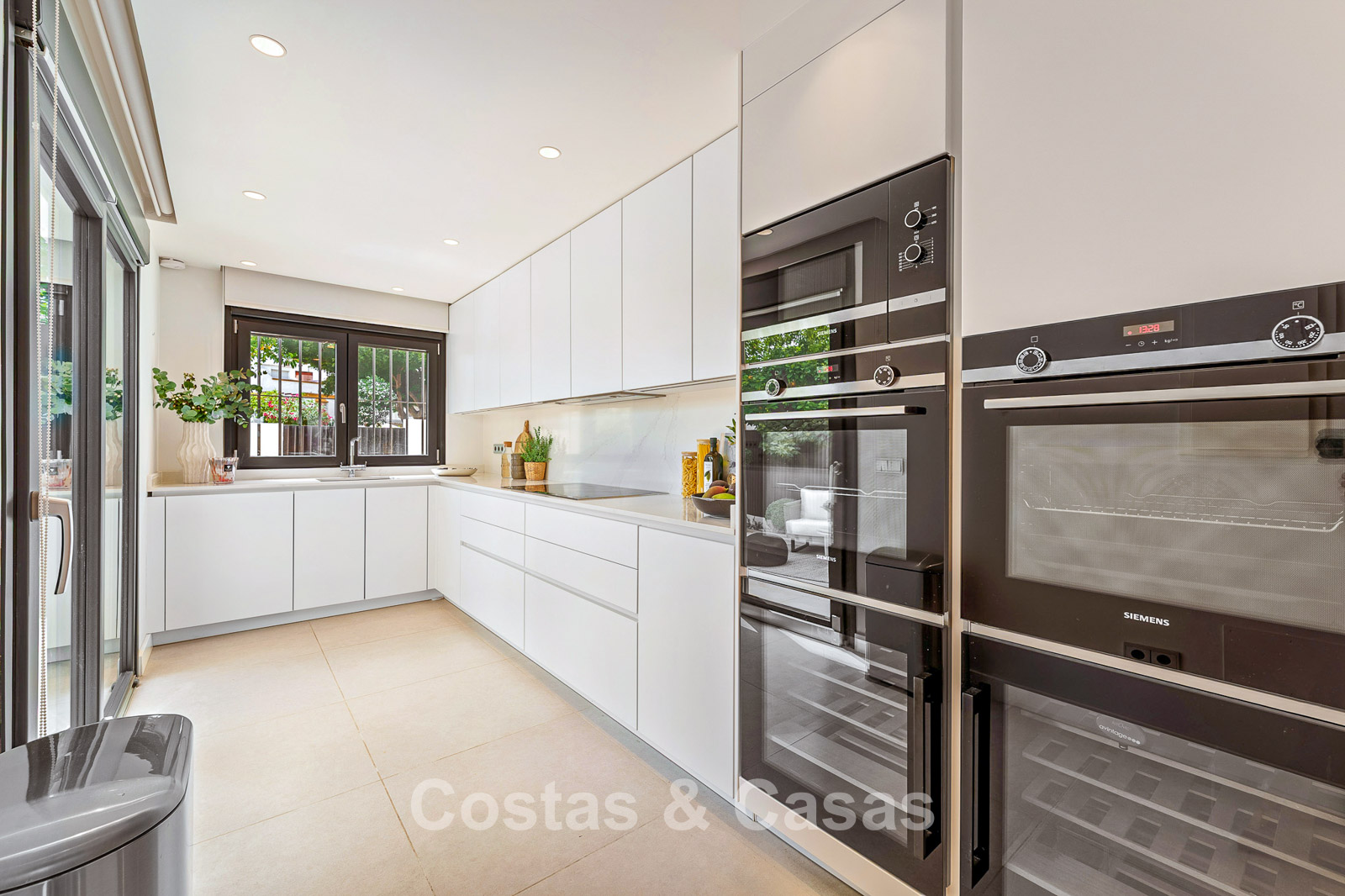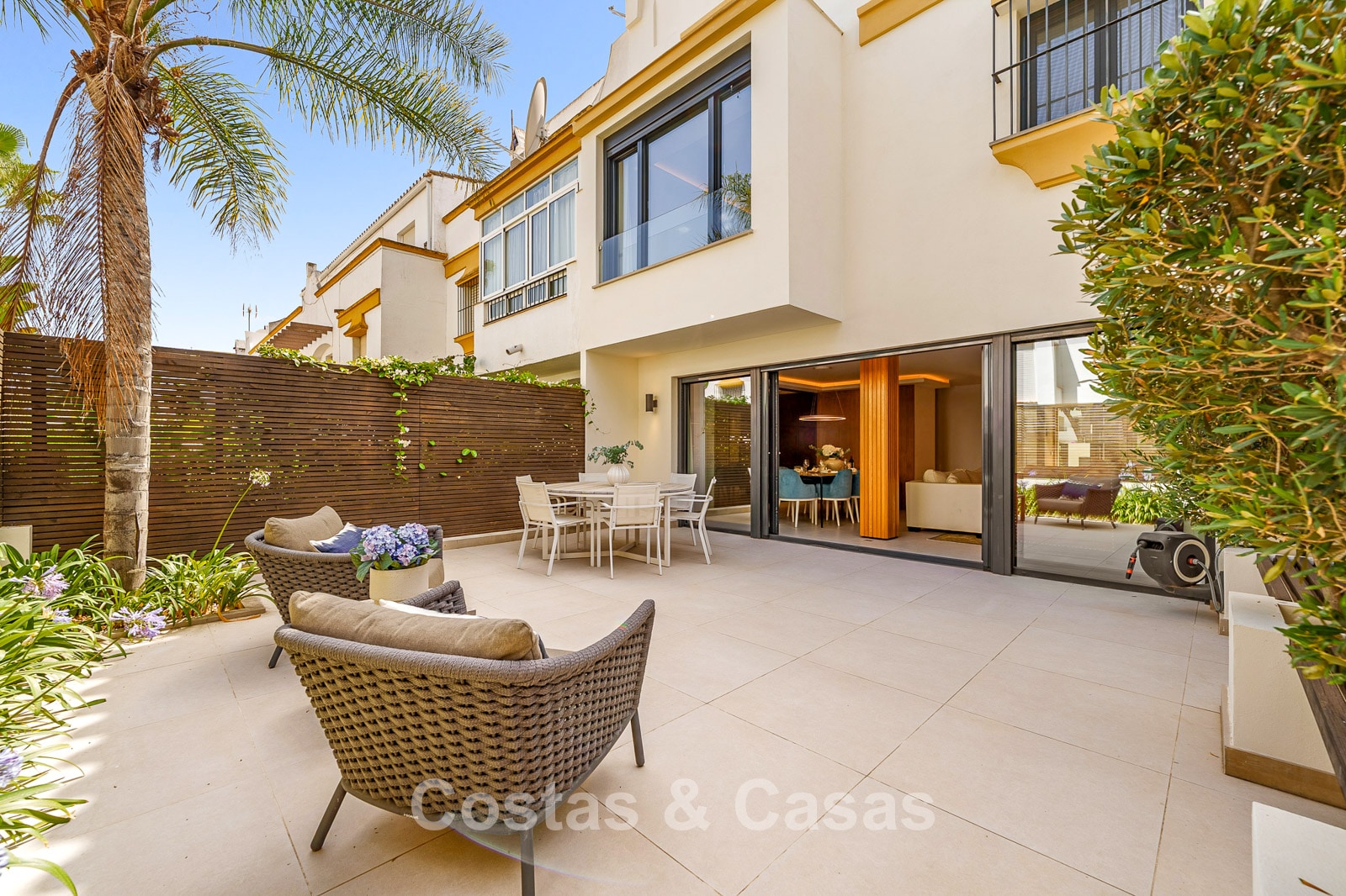 Spacious townhouse in excellent condition. Carefully renovated and tastefully decorated. The sunny terraces at the front and rear are furnished with a lounge set. High sliding windows create a seamless transition between the indoor and outdoor spaces and generate abundant natural light. Practically equipped kitchen with high-quality Siemens appliances and a breakfast bar. Open-plan living area with living and dining area. Study or office space. 4 bedrooms, 4 bathrooms. The spacious top-floor bedroom features a private sitting area and direct access to a spacious terrace, from which you can enjoy beautiful sea views. High-quality, large-format tiled floors. Garage space.
