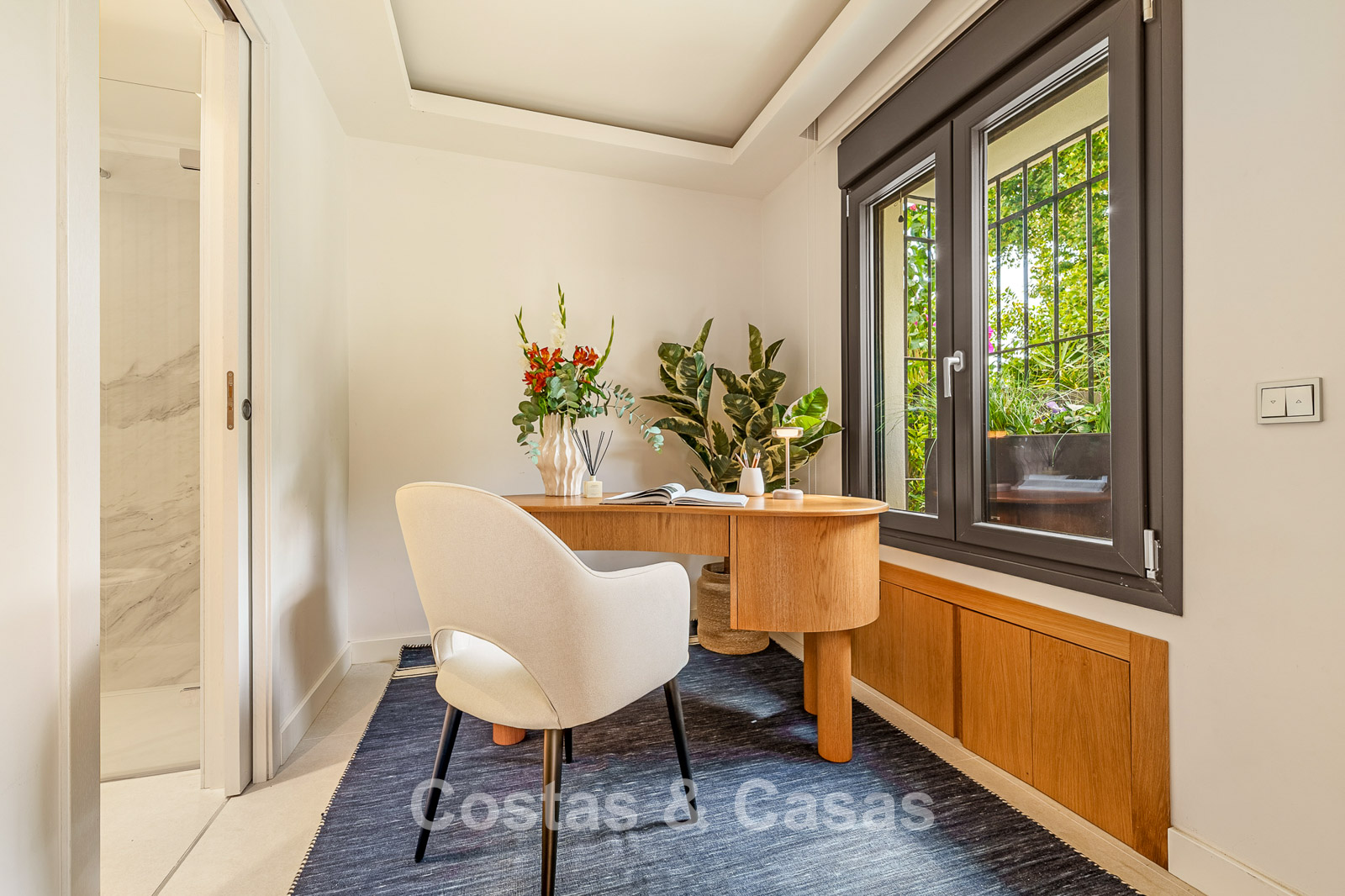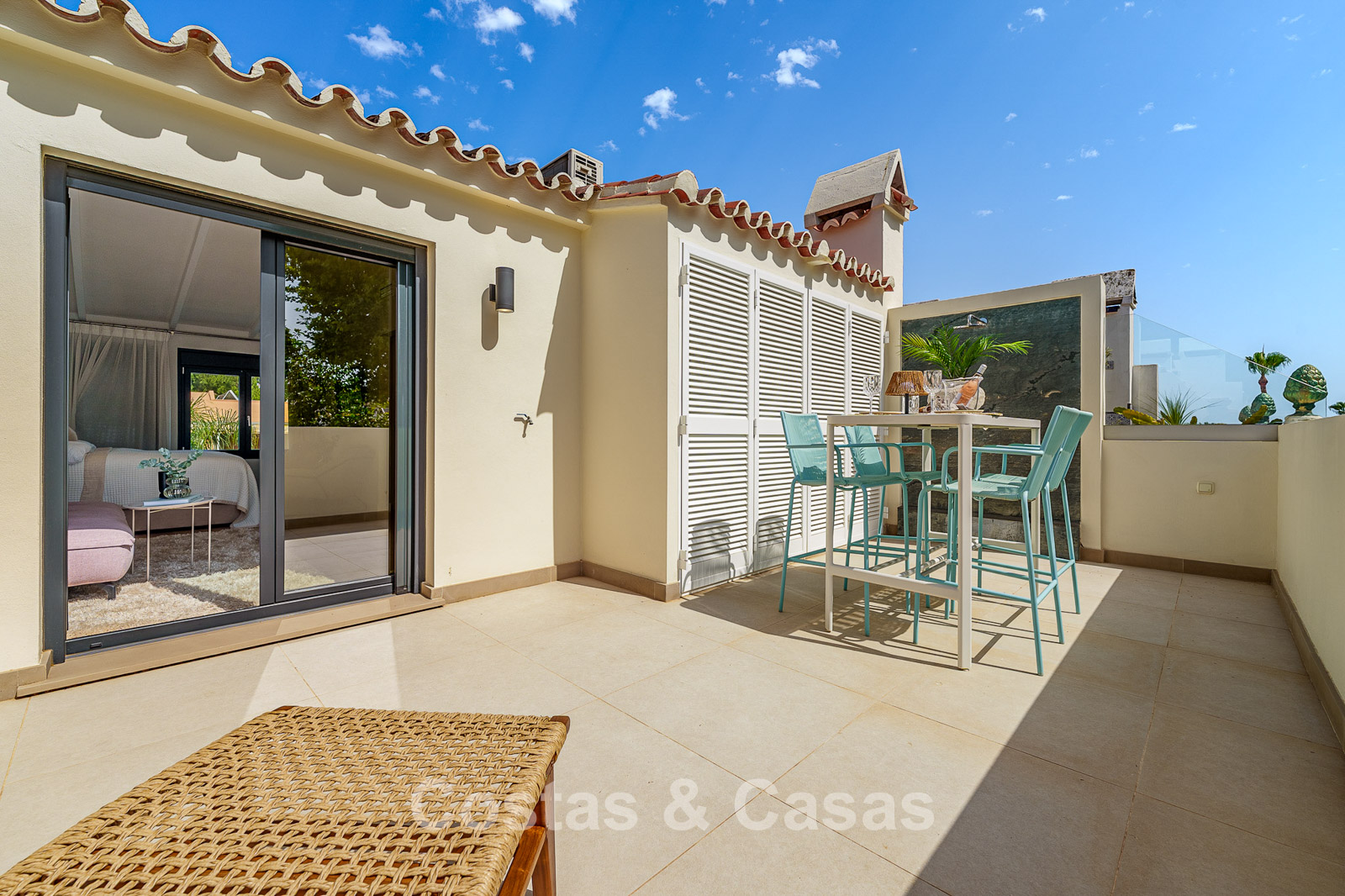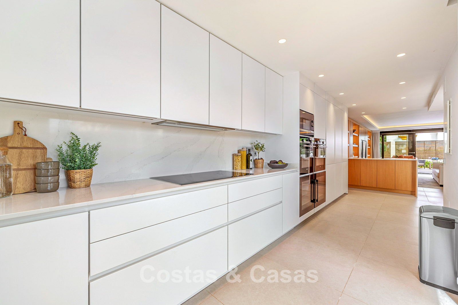 Spacious townhouse in excellent condition. Carefully renovated and tastefully decorated. The sunny terraces at the front and rear are furnished with a lounge set. High sliding windows create a seamless transition between the indoor and outdoor spaces and generate abundant natural light. Practically equipped kitchen with high-quality Siemens appliances and a breakfast bar. Open-plan living area with living and dining area. Study or office space. 4 bedrooms, 4 bathrooms. The spacious top-floor bedroom features a private sitting area and direct access to a spacious terrace, from which you can enjoy beautiful sea views. High-quality, large-format tiled floors. Garage space.