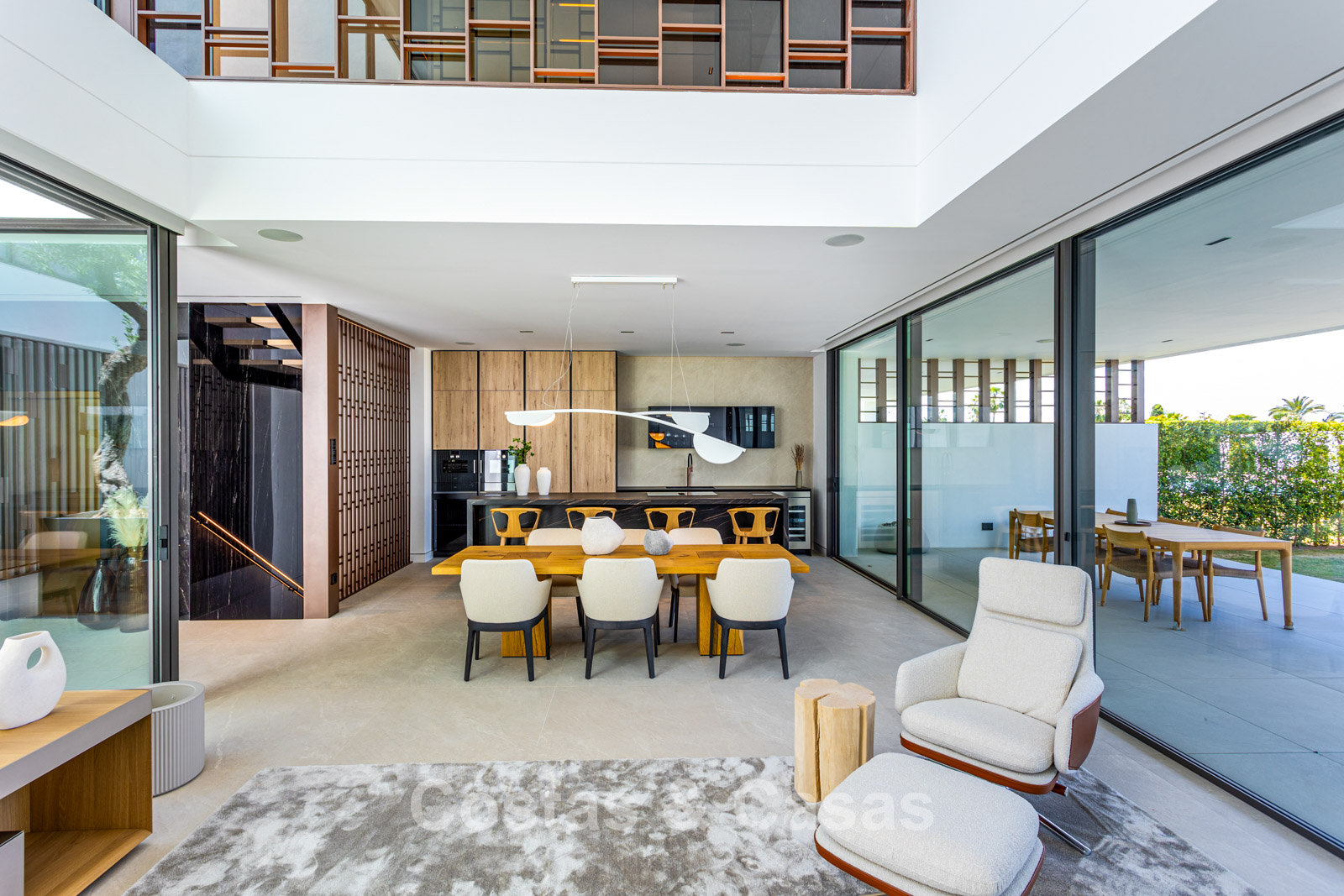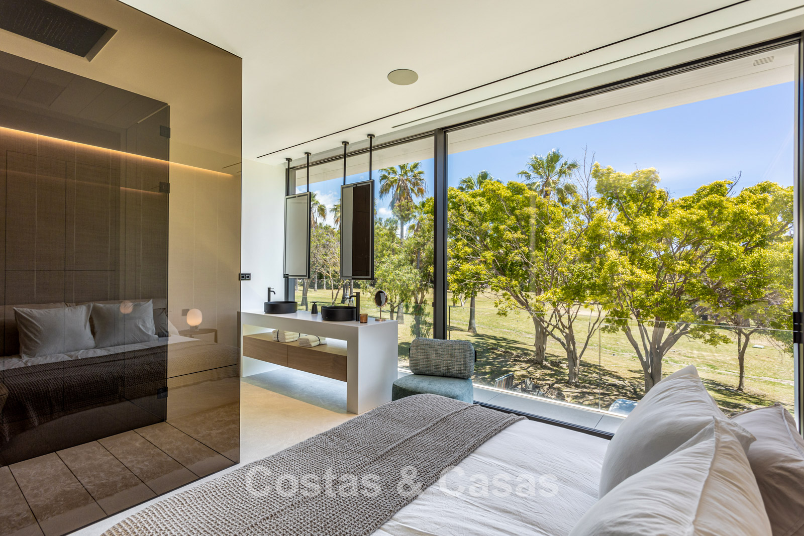 Sophisticated villa with a high-end architectural style. Built to the highest quality standards, with unparalleled attention to detail. Floor-to-ceiling sliding windows throughout the villa create exceptionally bright spaces. The airy living area features a partially double-height ceiling. A high-quality kitchen with premium Gaggenau appliances and a breakfast island is the focal point of the villas. A glass patio forms the focal point of the villas, designed to create additional light and air circulation, with the option of being completely enclosed with sliding glass walls. 3 bedrooms, 4 bathrooms, and a separate toilet. Beautiful master suite with an open-plan bathroom and private walk-in closet. Extensive porcelain floors. The lower floor provides natural light and could be transformed into a gym, spa, or studio. Utility room. Integrated garage for 4 cars with an electric vehicle charging station.