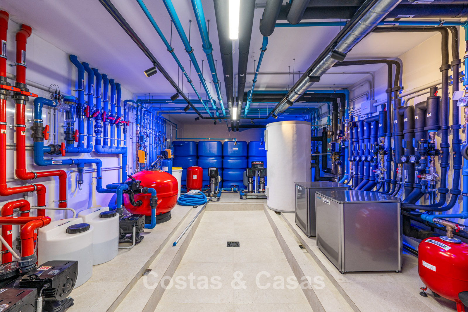 Situated on a generous, fully fenced plot of over 3,500m². The exterior offers a tropical ambiance, surrounded by lush plants and a beautiful lawn, with a garden that extends over several levels, adding depth and character to the outdoor living experience. Southwest-facing. Infinity pool with an adjacent sun terrace. The expansive terraces invite you to enjoy the soft Mediterranean sun and fresh air all day long. A spacious roof terrace offers additional space for relaxing, sunbathing, and enjoying the panoramic views. You can enjoy panoramic views across the valley towards the Mediterranean Sea.