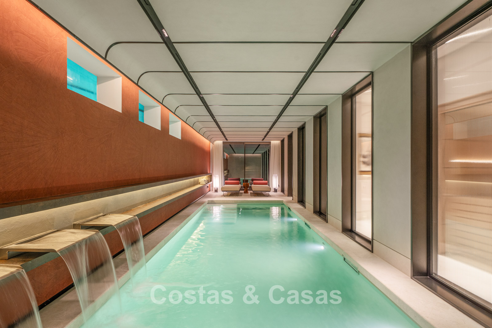 Modern, minimalist architecture with natural elements such as stone and glass creates a sleek yet warm feel. The open structure and large windows enhance the sense of space and seamlessly connect the interior with the surrounding nature. Minimalist custom kitchen, equipped with top-of-the-line appliances and a large cooking island. Adjacent is a "dirty kitchen." Furthermore, a dining area. A total of 5 bedrooms, 6 bathrooms, and 2 separate toilets. Formal office space. The lower floor is entirely focused on relaxation and recreation, featuring a heated indoor pool, a fully equipped gym, and a luxurious sauna. In addition, there is a fully furnished guest room and a relaxation lounge with a custom-built bar. Laundry room. Utility room. High-quality cream-colored tiled floors. Integrated garage for 2 cars.