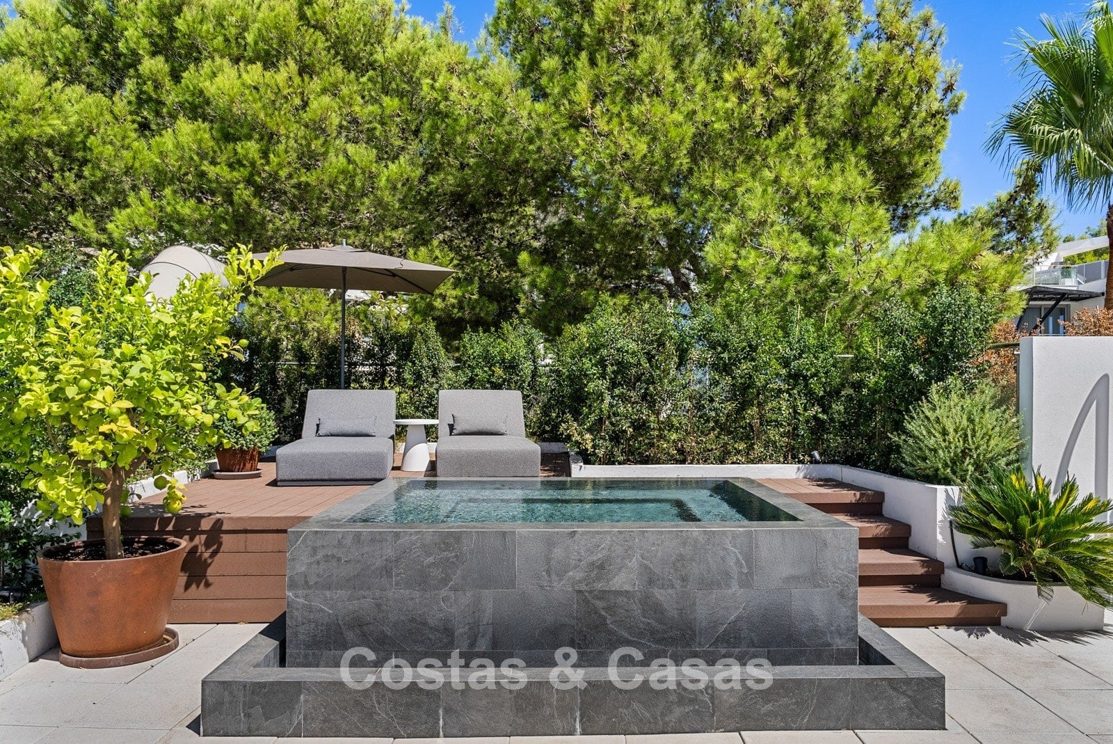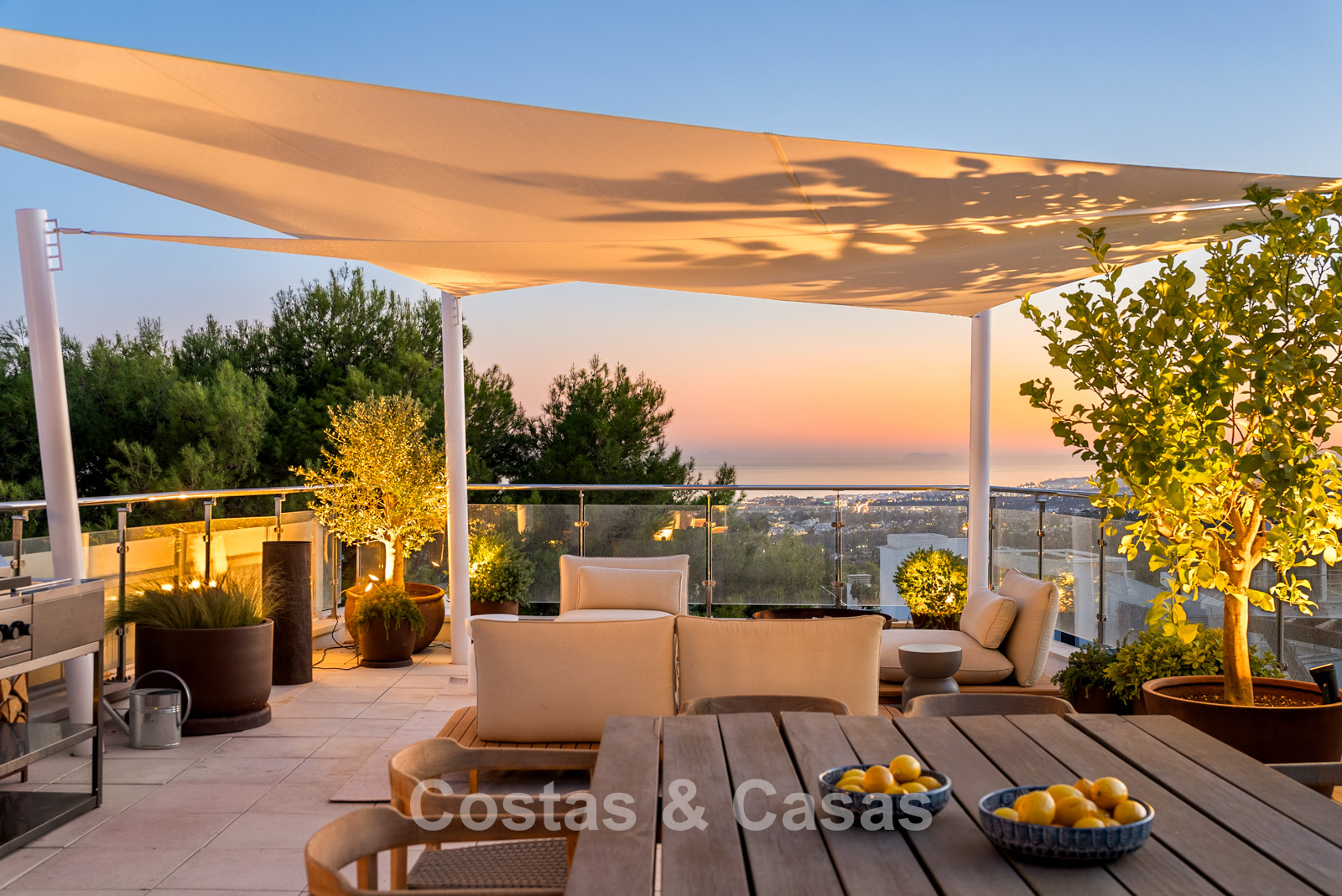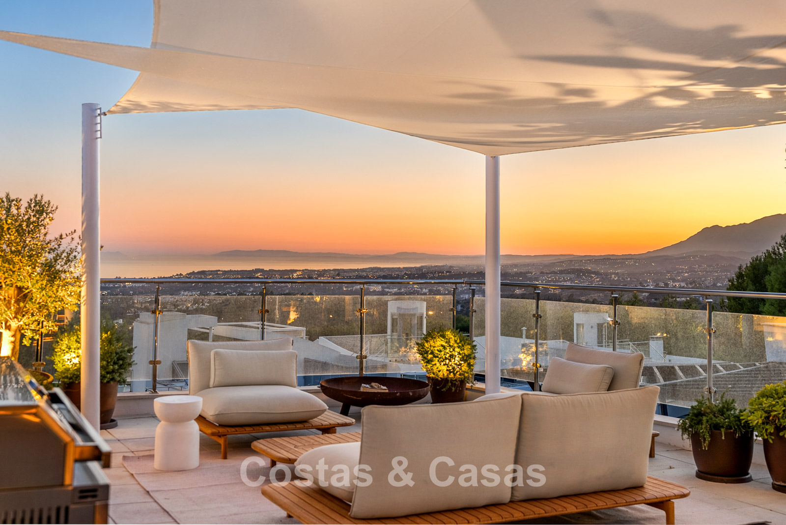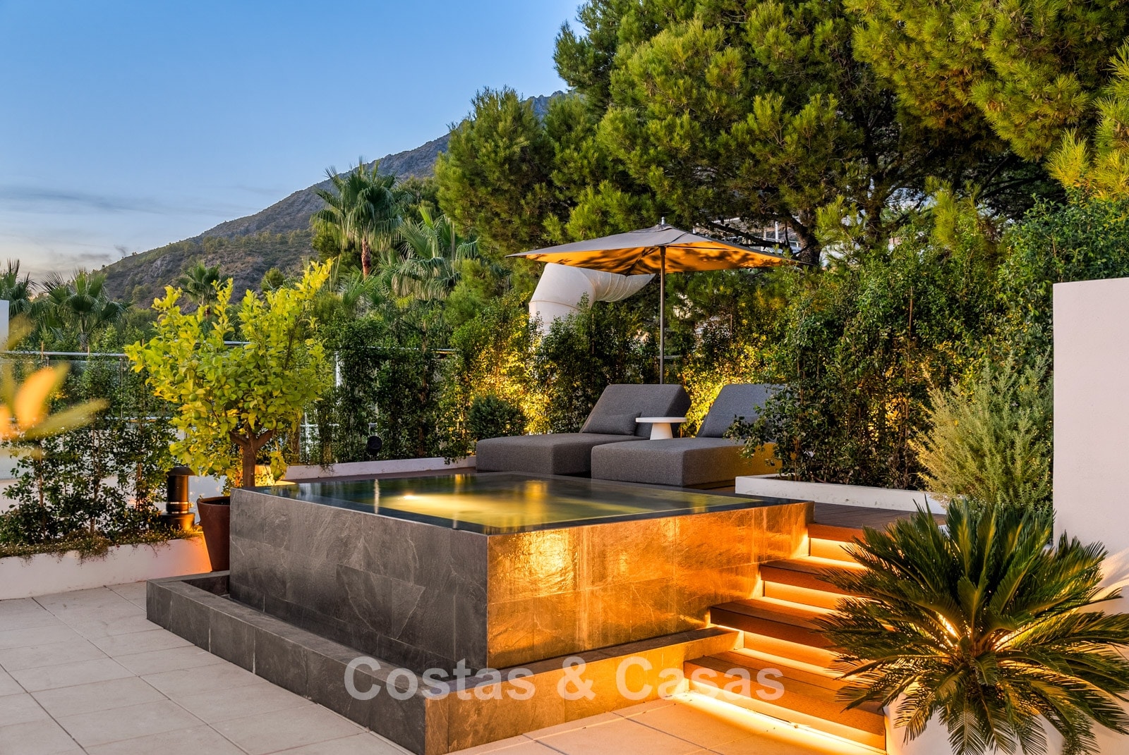 Located on a corner, surrounded by lush greenery. Private garden with a built-in heated infinity pool. Sunny terraces offer the perfect place to relax and enjoy the Mediterranean climate. A spacious roof terrace features a barbecue area with a dining table, lounge, and a built-in jacuzzi with an adjacent chill-out area. South-facing. Panoramic views over Marbella and the coastline towards the Mediterranean Sea and the Strait of Gibraltar.