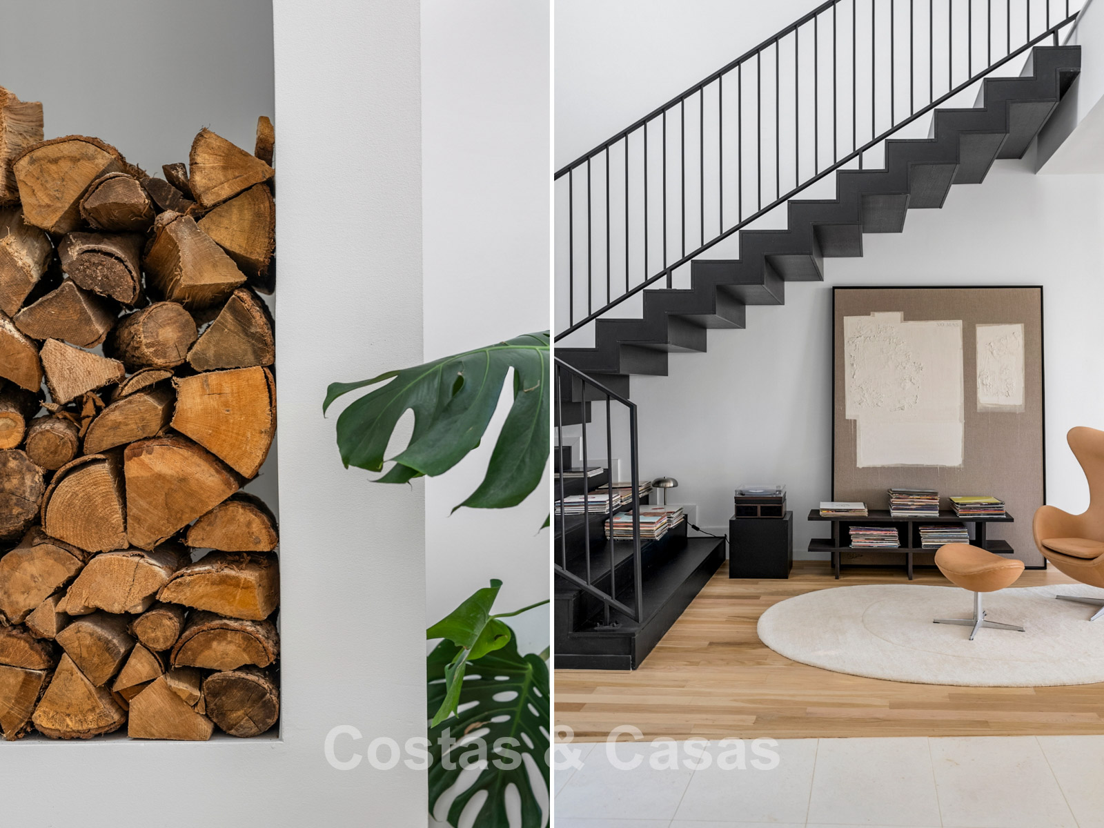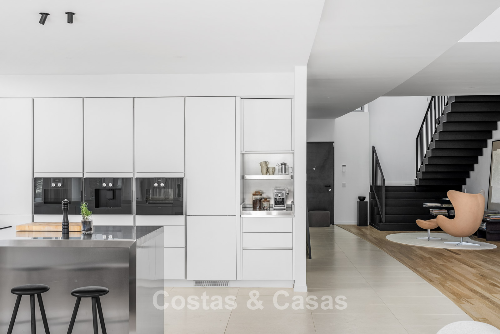 Semi-detached villa with a contemporary architectural style. Carefully designed with attention to superior finishes. Floor-to-ceiling sliding windows with recessed frames seamlessly blend the indoor and outdoor spaces and generate abundant natural light. A stylish living space with a partially double-height ceiling, where the living room, dining area, and kitchen flow seamlessly into one. The fully equipped kitchen features high-quality Gaggenau appliances and a cooking island with seating. Integrated dining area. 3 bedrooms, 3 bathrooms, and a separate toilet. Upstairs, an office space. High-quality natural stone tiled floors. Private golf simulator, which can easily be transformed into a home cinema or games room. Private wine cellar. Laundry room. Integrated garage for 3 cars with additional storage.