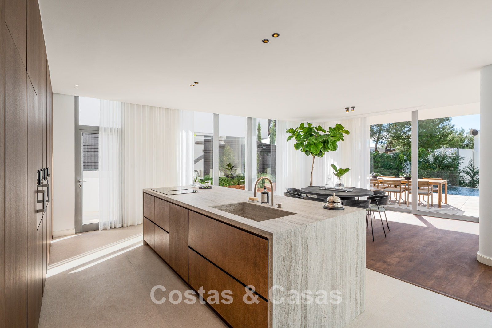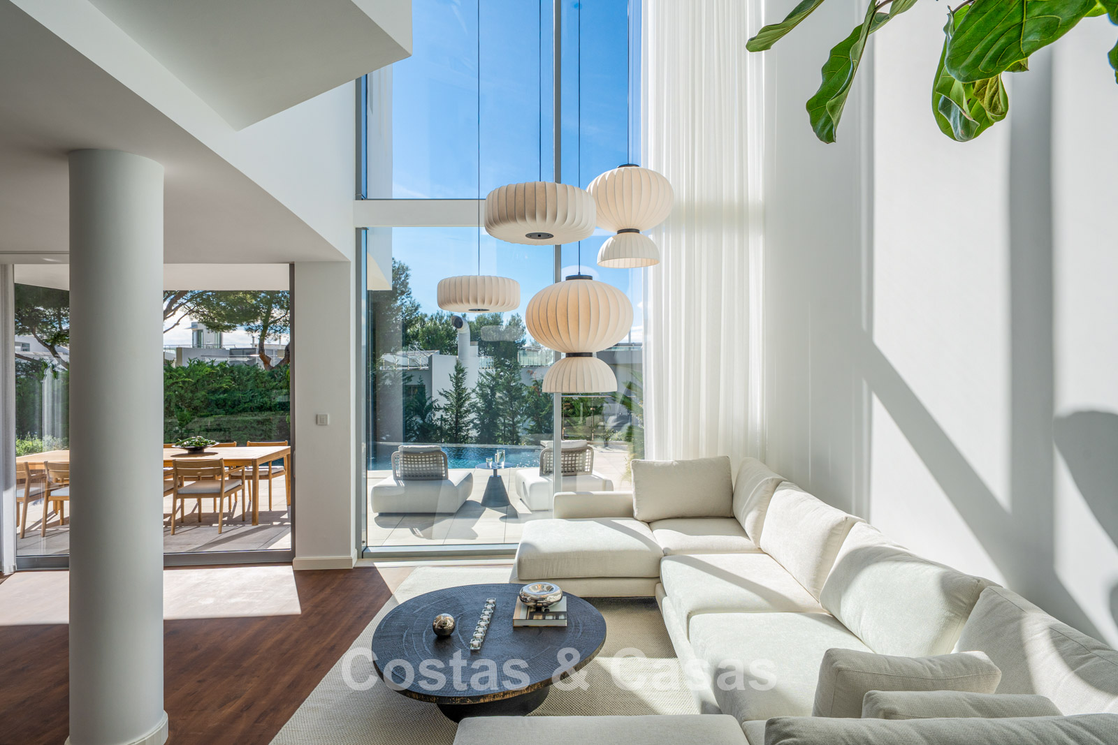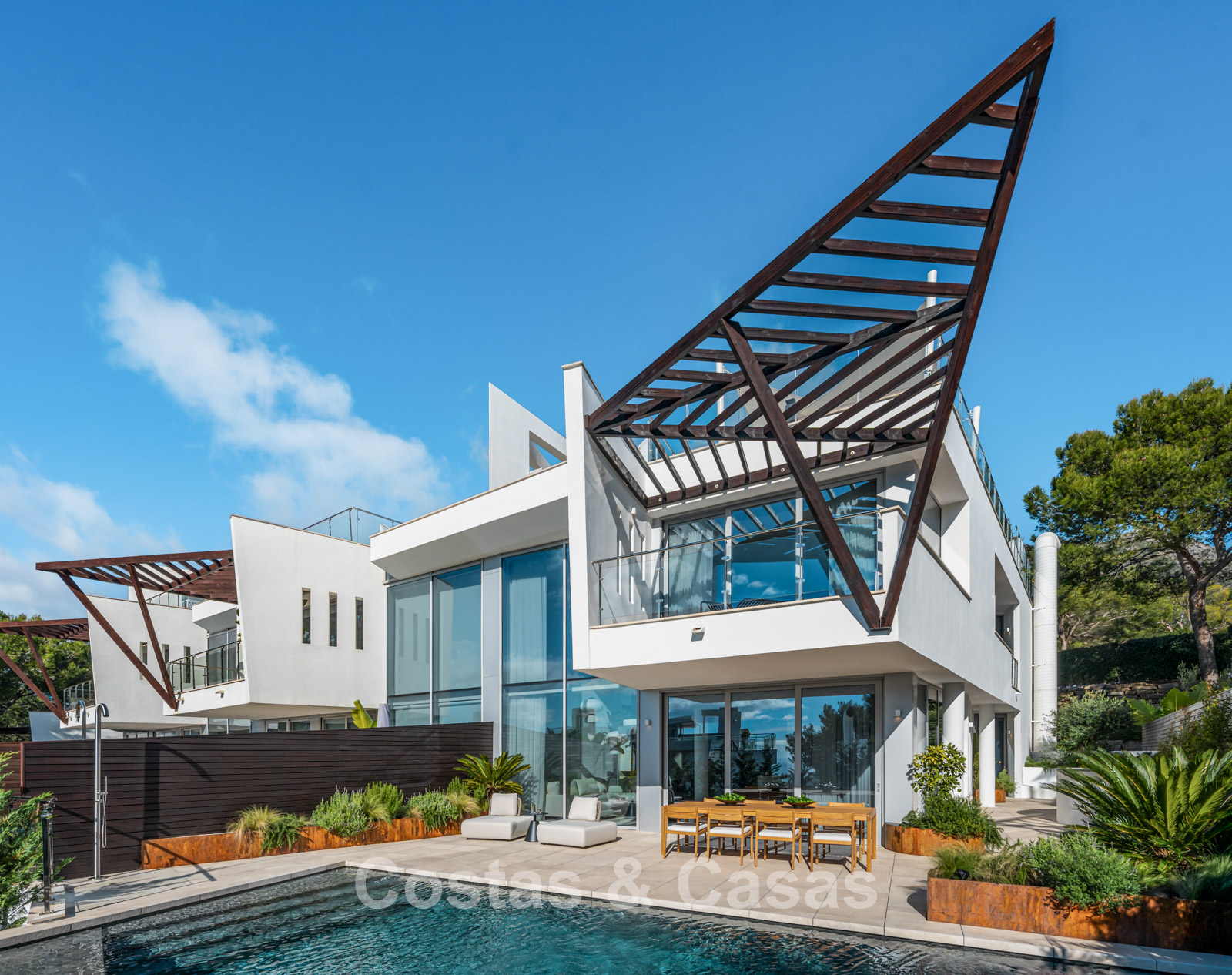 This recently renovated semi-detached villa is presented in outstanding condition and exudes contemporary luxury. The architecture is defined by clean lines and the use of high-quality materials. Well-maintained exterior with an integrated swimming pool surrounded by sun terraces. An impressive rooftop terrace features a built-in jacuzzi, an outdoor kitchen complete with BBQ, and lounge areas. Enjoy panoramic sea views from the solarium and upper floors. The interior is filled with natural light thanks to the open-plan design, large windows and neutral colour palettes. The generous double-height living room enhances the modern character of the villa and creates a breathtaking sense of space. The modern kitchen is fully equipped with top-of-the-range Siemens and Gaggenau appliances. There are 4 spacious bedrooms, each with its own en-suite bathroom. The lower level offers additional functional spaces, including a fully climate-controlled wine cellar. Floors are finished with large-format ivory porcelain tiles (120x120 cm) indoors and white tiles on the terraces. A practical laundry room. Private garage with space for 3 cars.