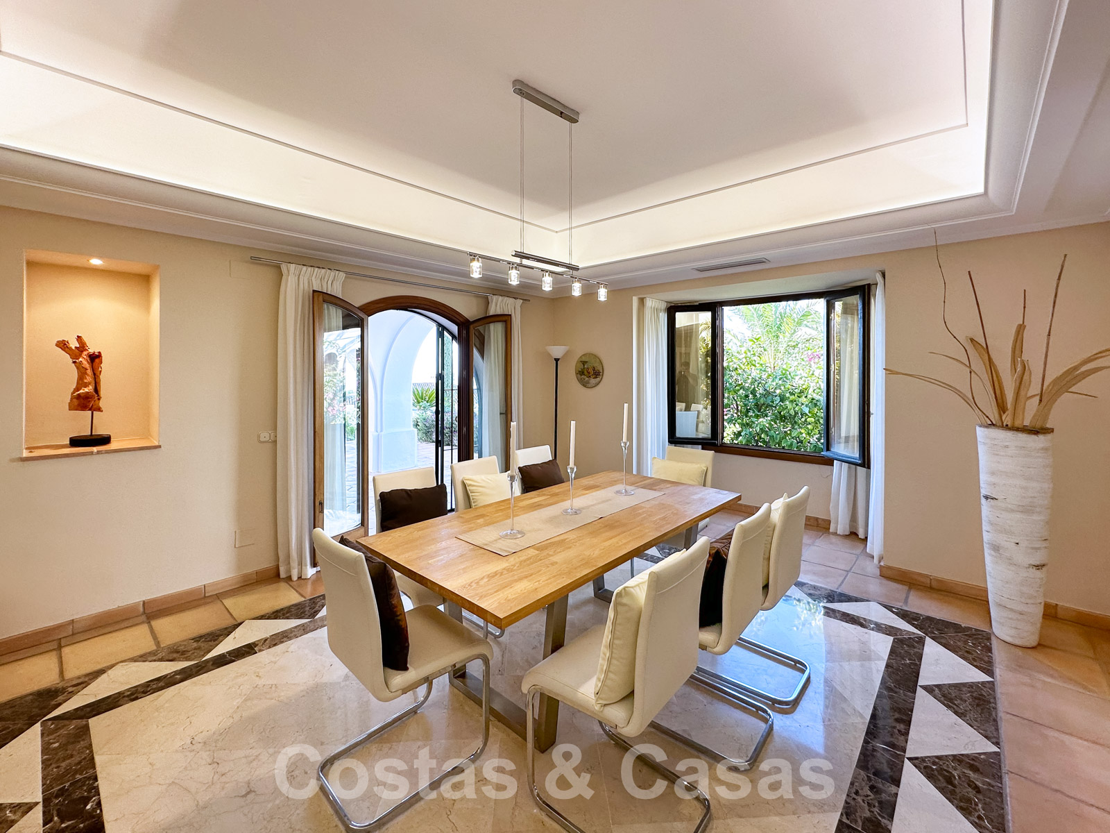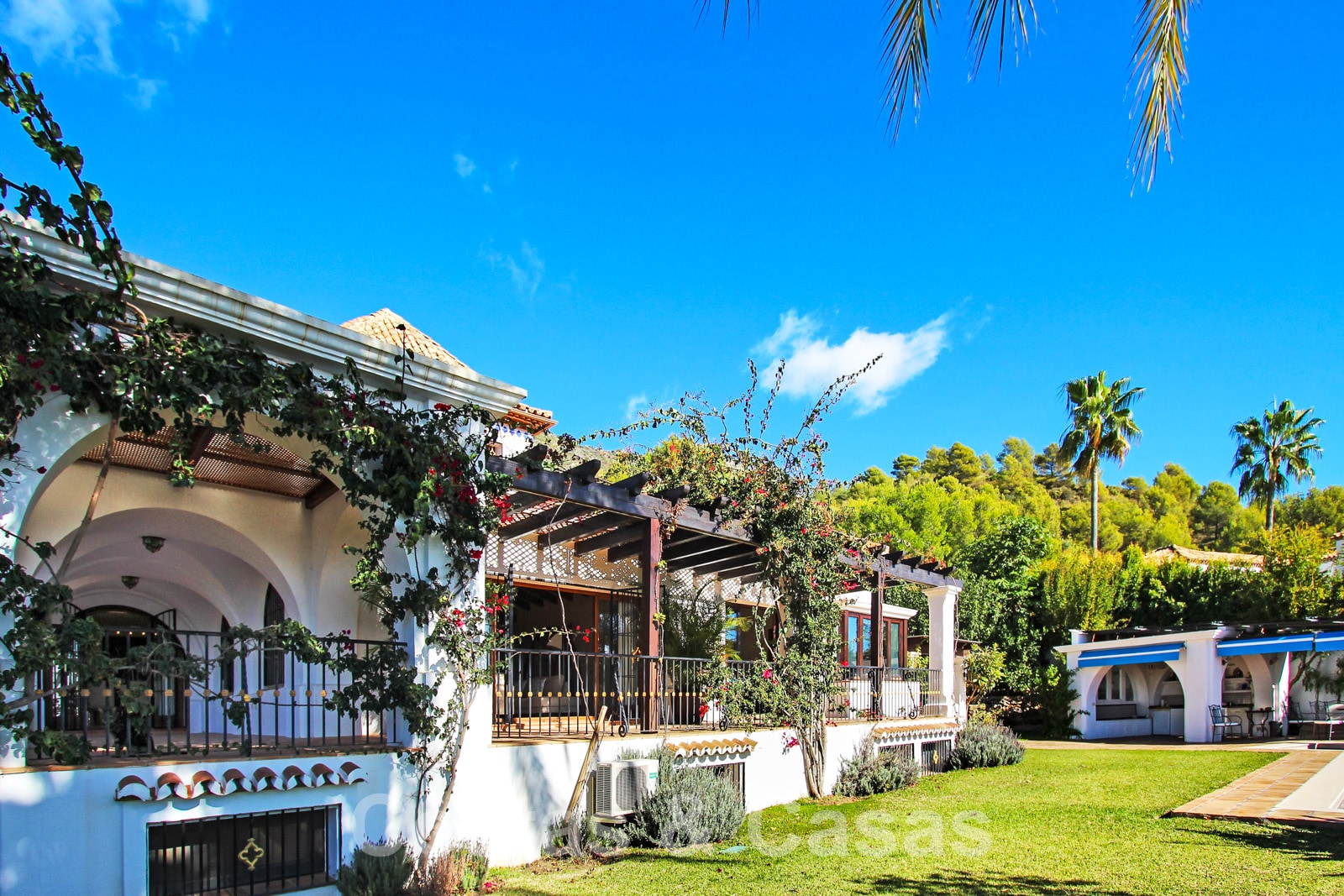 Detached villa in rustic Spanish architectural style. Using high-quality materials. A driveway takes you up to the covered entrance of the house. Warm and charming interior with terracotta floors and vaulted beamed ceilings. Airy living room with lounge and classic fireplace. Adjacent a 2nd sitting area. A dining area opens onto the terrace and garden. Large, fully equipped kitchen with separate laundry room. 6 bedrooms, 5 bathrooms. The master bedroom on the first floor a private terrace where you enjoy formidable sea views. The lower floor provides a living room with open kitchen, an en-suite bedroom and a separate entrance, ideal for use as a guest house. Large storage room. Indoor garage for 4 cars. Covered parking for 2 cars.
