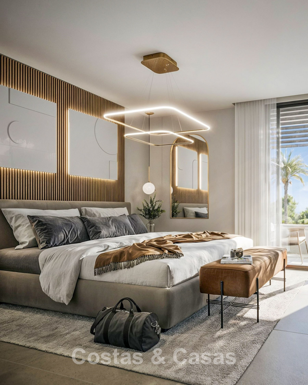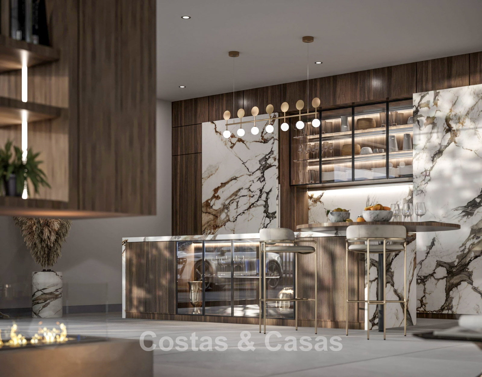 A brand-new contemporary villa defined by sleek modern architecture and minimalist design. Built using high-quality materials and refined craftsmanship throughout. The interior has been meticulously designed, offering a seamless flow between indoor and outdoor living spaces. The generous living area is flooded with natural light thanks to floor-to-ceiling glass windows, providing direct access to the expansive terraces and garden. A brand-new, high-end kitchen fitted with quality Miele appliances and a breakfast bar. Adjacent utility room and laundry area. Five bedrooms, five en-suite bathrooms and a separate guest toilet. Storage room.