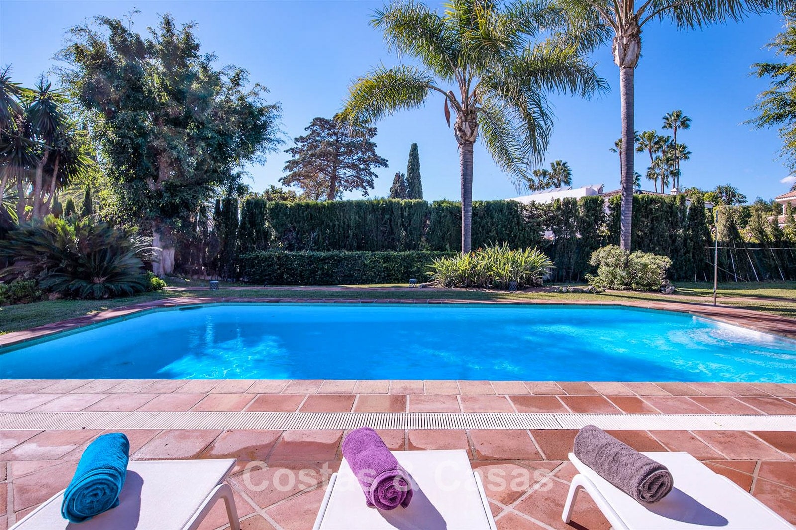 Spacious plot, fully enclosed by tall plantings. Beautiful mature garden with abundant tropical greenery. Inground pool with adjacent sun terrace with comfortable loungers. Southwest-facing. Peaceful views of the garden and pool.