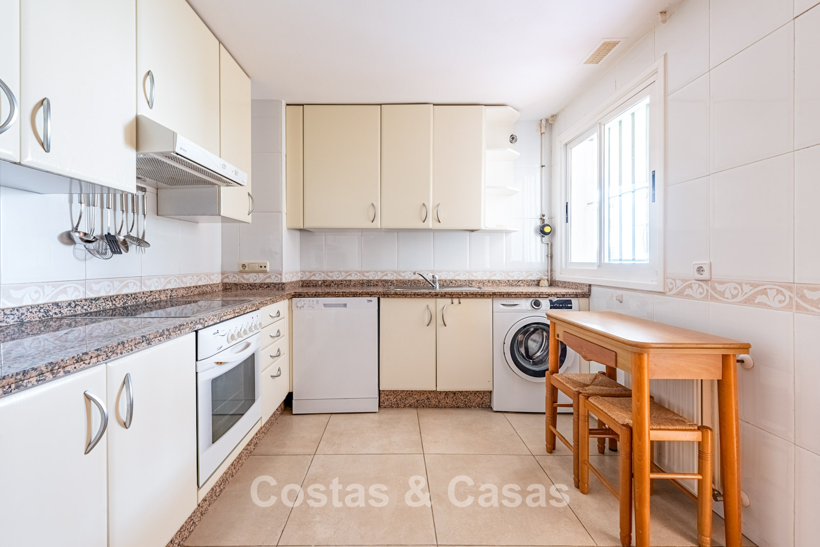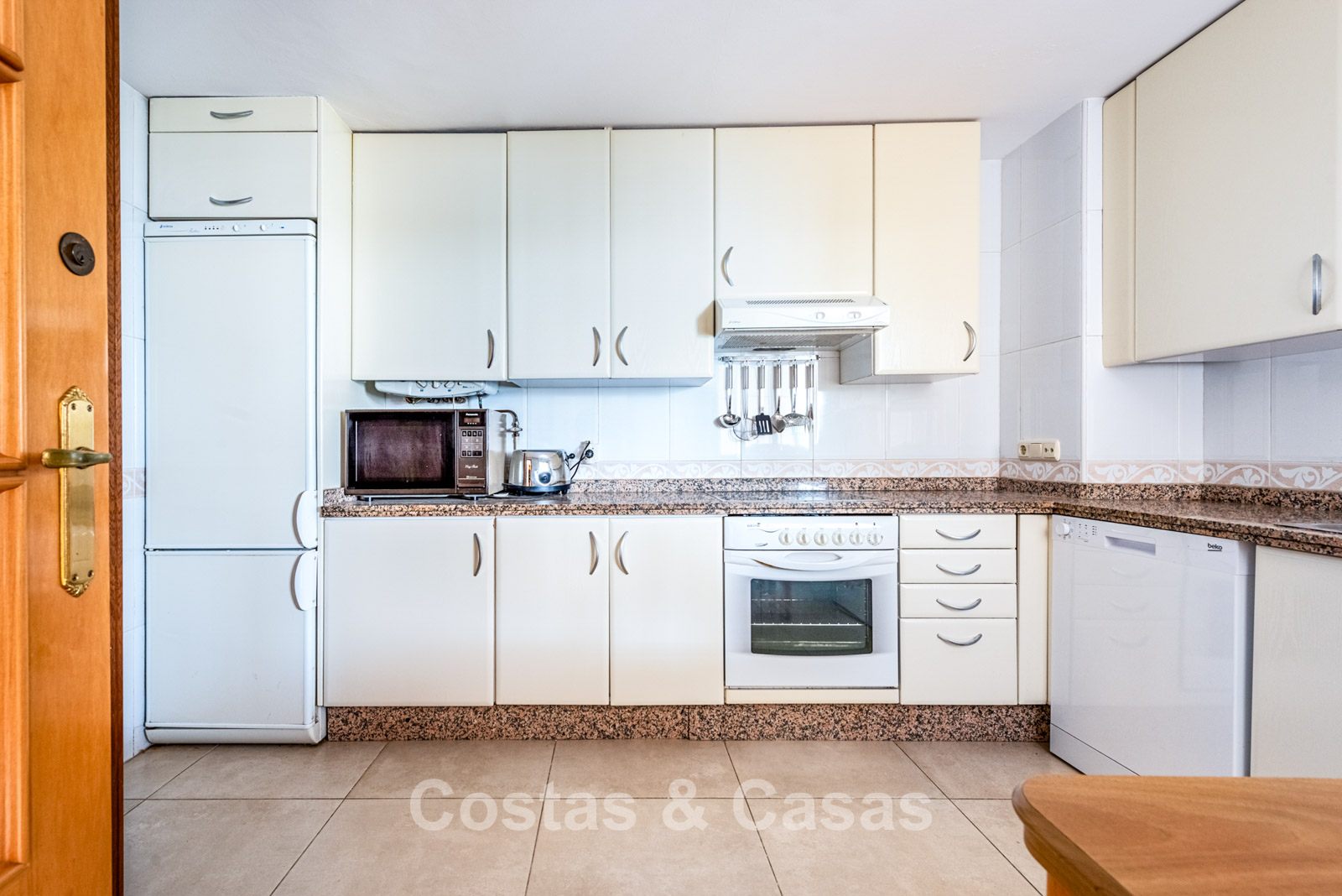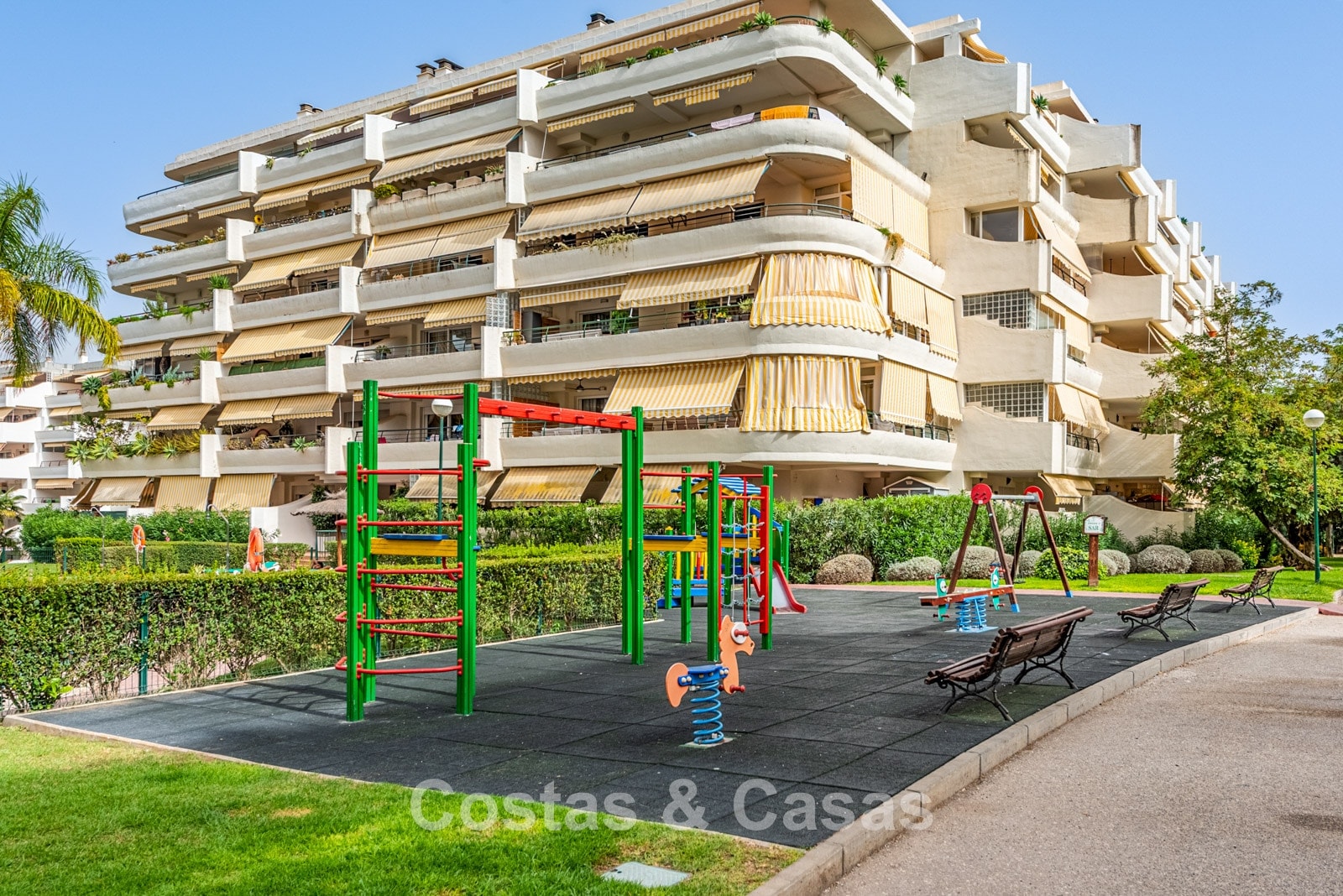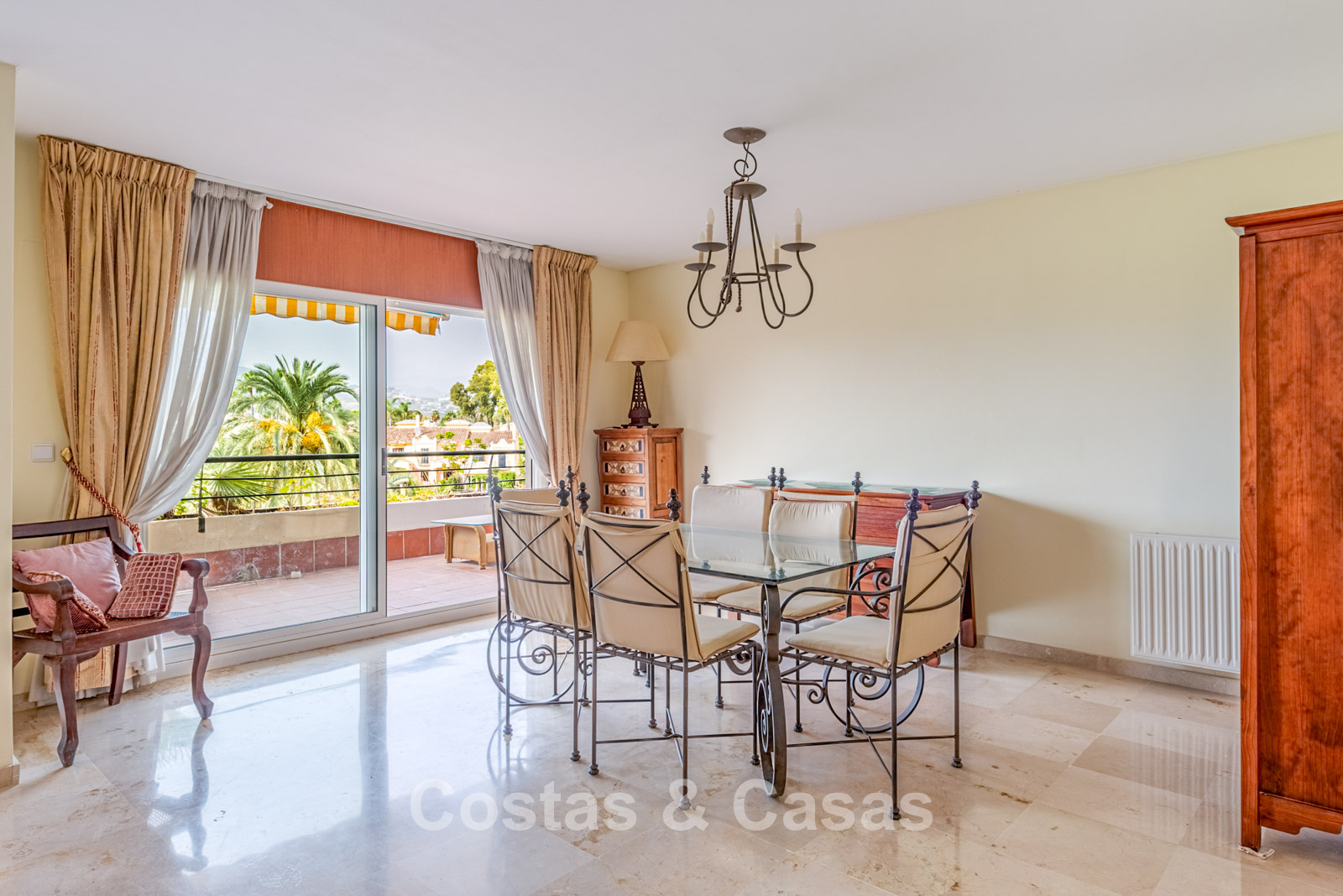 Spacious duplex penthouse on the 4th floor. This generous penthouse offers significant renovation potential and forms an excellent base for a high-quality update. West-facing. Beautiful views over the Guadalmina golf courses and the surrounding mountains. The bright and spacious living room opens onto a covered terrace, with the option to create an open-plan kitchen for a modern living experience. The separate kitchen can be converted into a 5th bedroom or an additional bathroom. Thanks to the two covered terraces, you can enjoy sheltered and atmospheric outdoor spaces throughout the year. 4 bedrooms, 4 bathrooms. Marble floors. Underground parking space included.