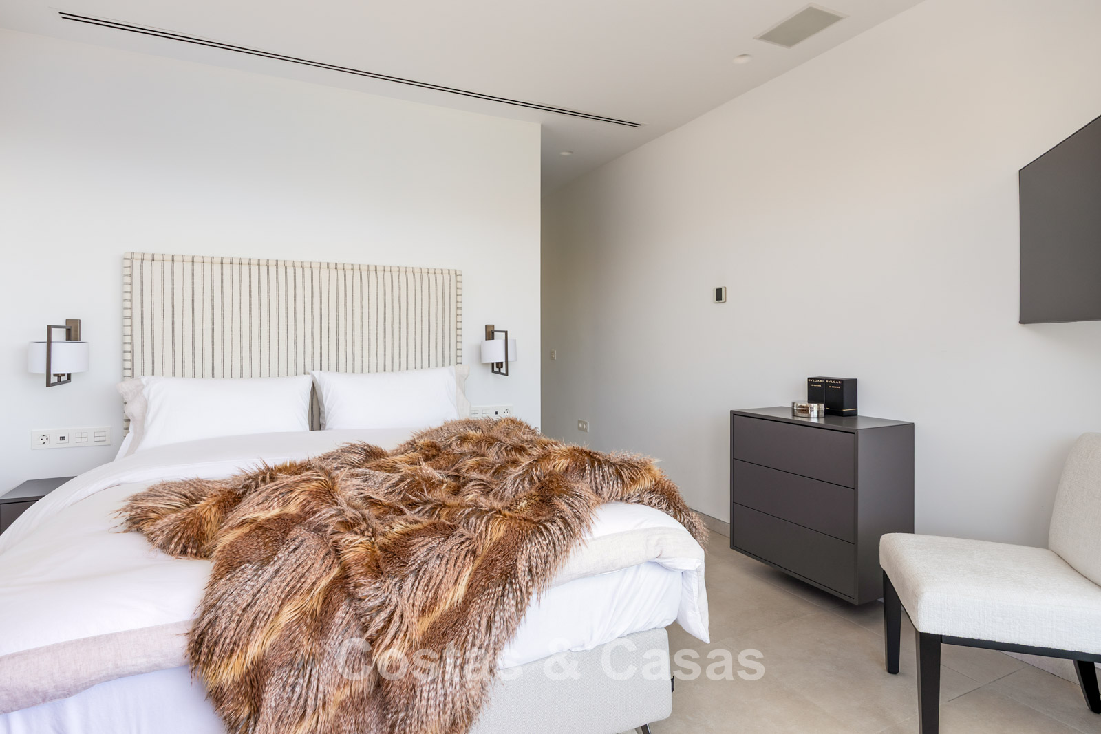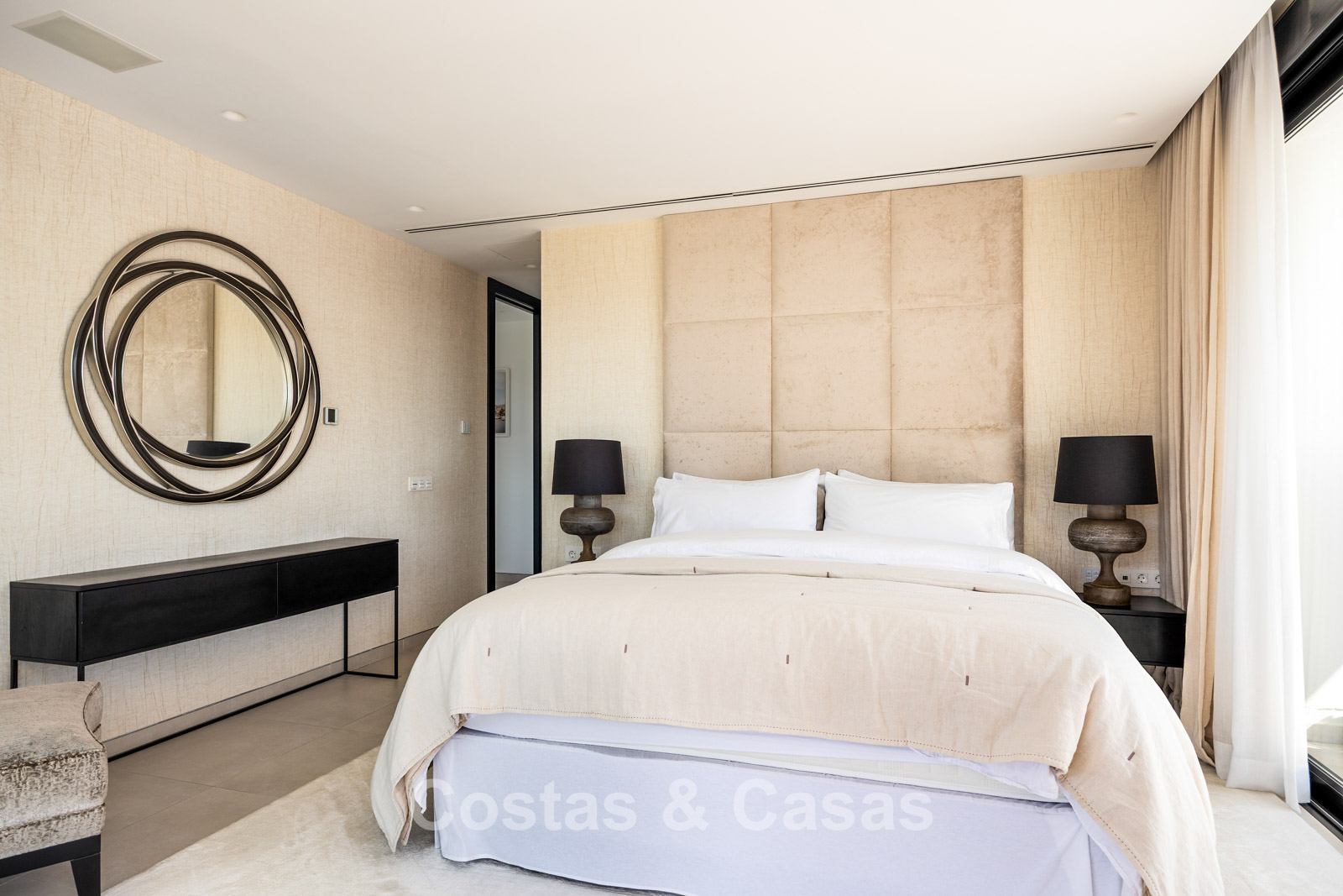 This villa is designed in a refined contemporary architectural style. The property is distributed over three impressive levels connected by an elegant staircase. Only high-quality materials and top-level finishes have been used throughout. The interior exudes calm and luxury through natural tones and abundant light. Floor-to-ceiling windows seamlessly blend indoor and outdoor living. The spacious living area features an open-plan layout with direct access to terraces and the pool. Custom-designed kitchen equipped with high-end Miele appliances and a central island. There are four spacious bedrooms, each with its own luxurious en-suite bathroom. The master suite offers direct access to the terrace with stunning views. Additional features include a guest toilet, two recreational areas on the lower floor (games room and TV lounge), storage room and separate laundry room. Private garage for 2 cars.