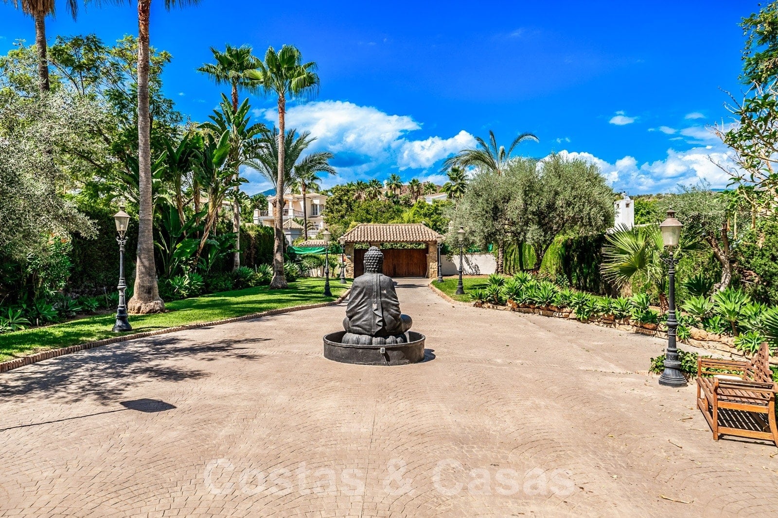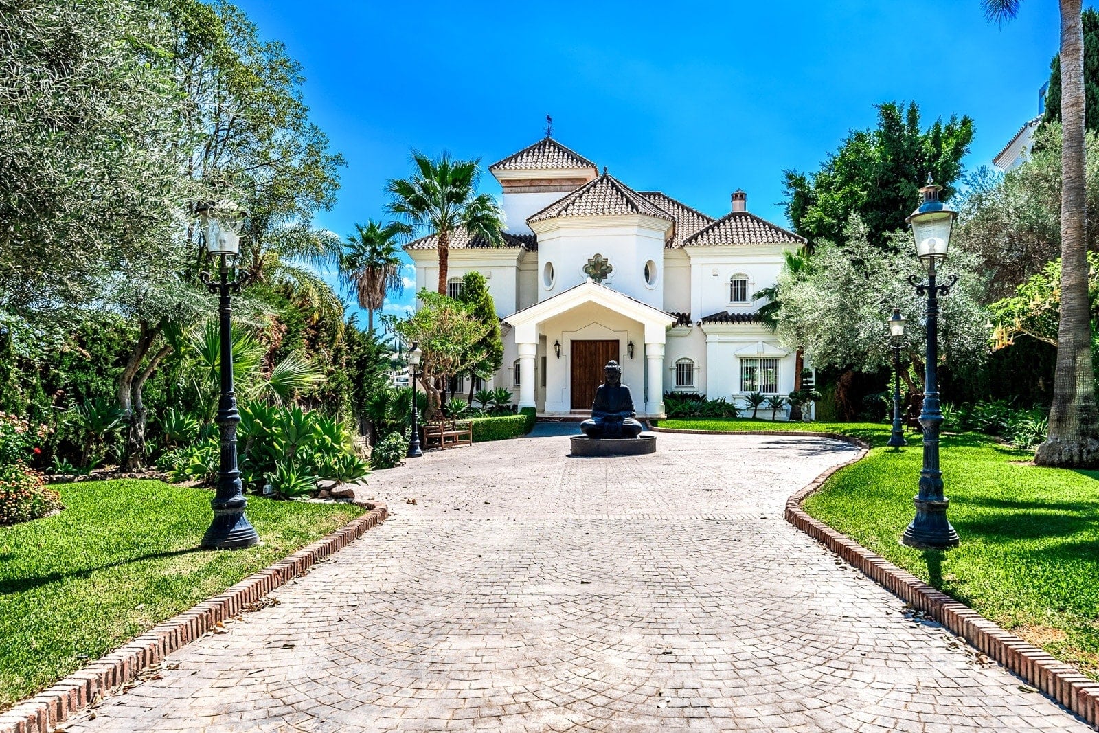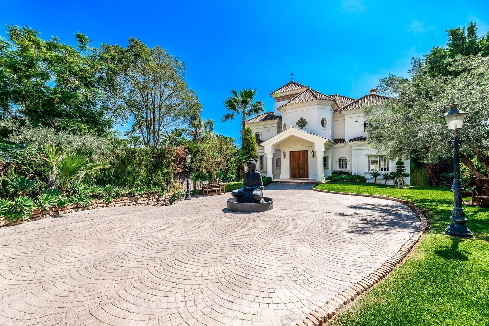 Detached villa with a traditional, Spanish architectural style. A motorised gate provides access to a driveway leading to the covered entrance. Spacious and airy interior. You walk into the double-height entrance hall with an ornate staircase leading to the upper floor. Walking further, you arrive in the living room, also with a double-height ceiling. Adjacent is a 2nd lounge area equipped with a traditional fireplace. A practical, fully equipped kitchen with a breakfast bar and a dining area. An indoor guest house with a living room, dining area and kitchen. A total of 7 bedrooms and 7 bathrooms. On the ground floor a multi-purpose room that can be freely arranged as a gym or relaxation area. Games room with TV lounge. Marble floors. Indoor garage for several cars.