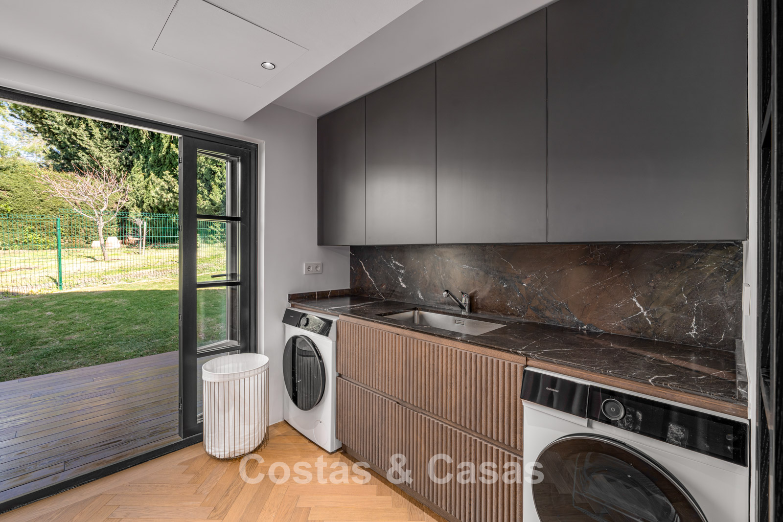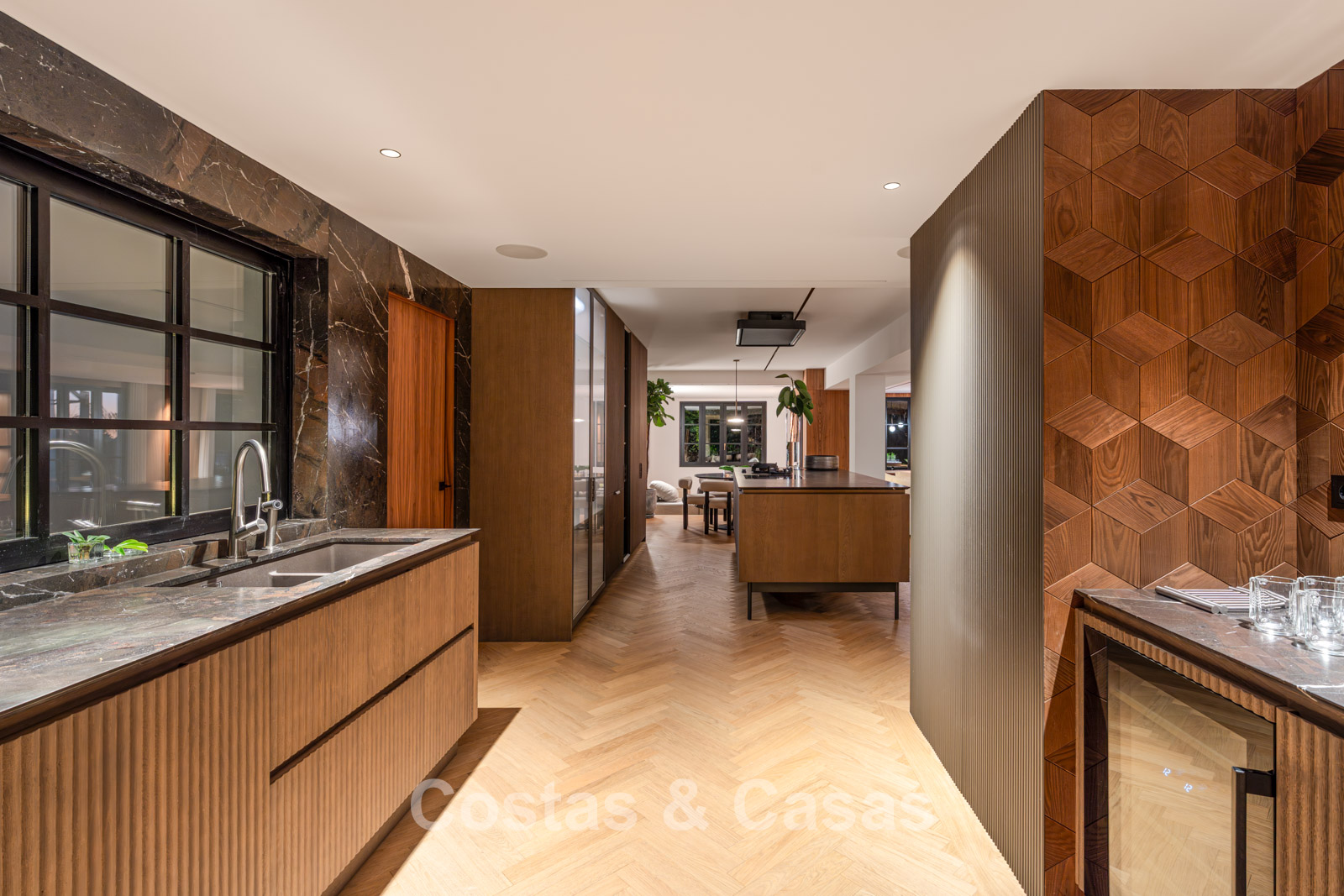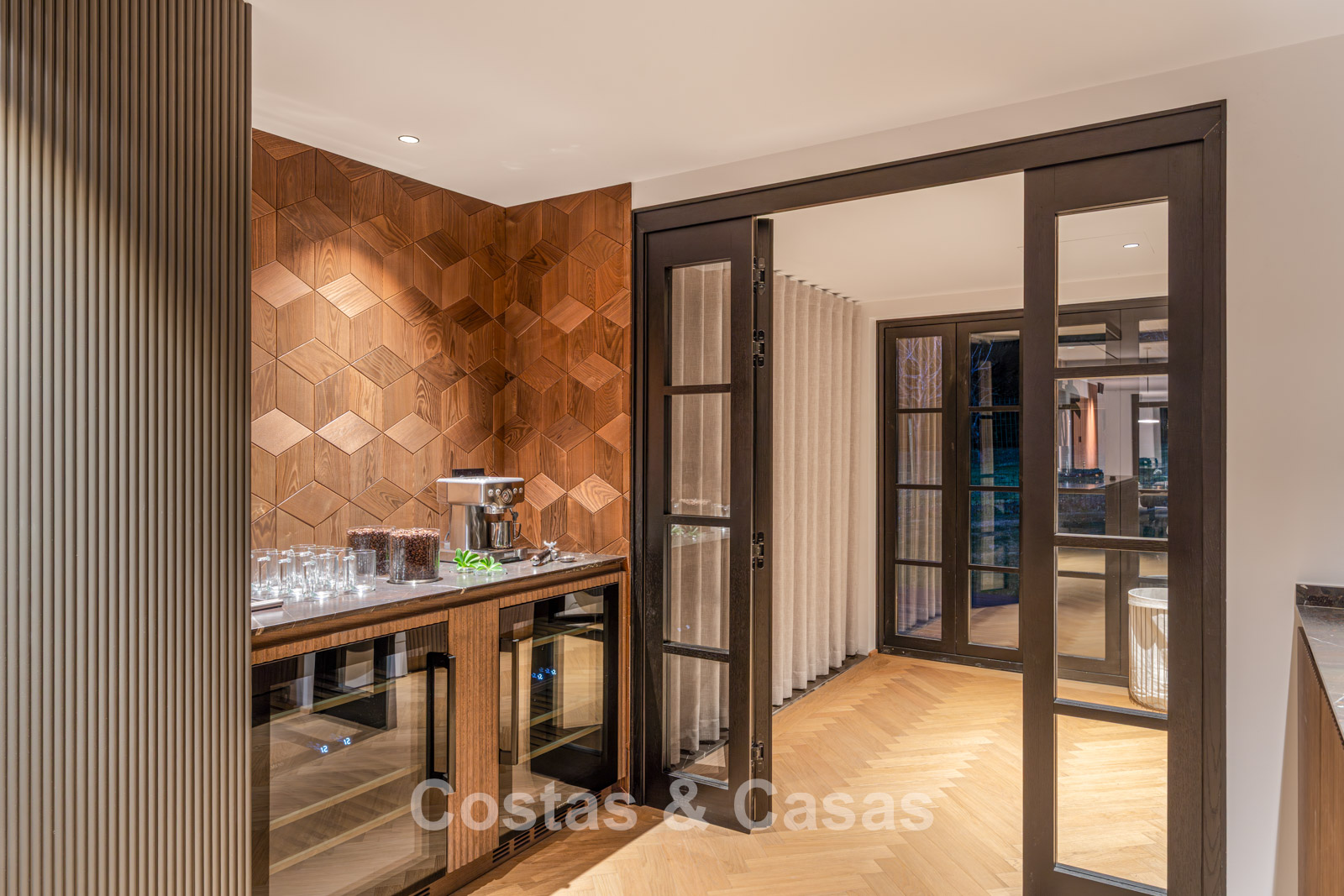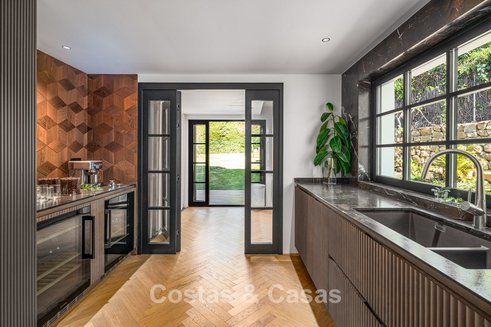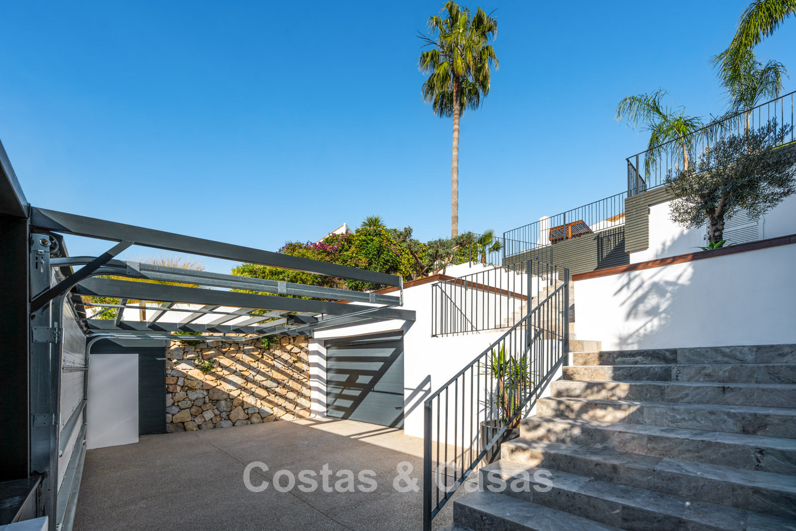 This impressive villa has been recently fully renovated with a clear architectural vision and meticulous attention to detail. The property is distributed over two carefully designed living levels with a logical and natural flow. Only premium materials have been used, including oak, walnut joinery, and dark-veined marble. The interior exudes modern luxury, characterised by an abundance of natural light and a serene atmosphere. Large glass sliding doors ensure an uninterrupted connection between the living spaces and terraces. The spacious living room features refined custom finishes and flows seamlessly into the dining area. The open-plan kitchen is a masterpiece in itself, fully equipped with high-end appliances and an elegant cooking island. The villa has four spacious bedrooms and four luxurious bathrooms, with the master suite offering spectacular views. Floors are finished with beautifully laid herringbone parquet and natural stone in the wet areas. The ground floor includes a second sitting area and a custom-designed wine cellar. A separate, practical laundry room and additional storage space provide optimal convenience. The property has a private garage for one vehicle and additional on-site parking (total 3 parking spaces).