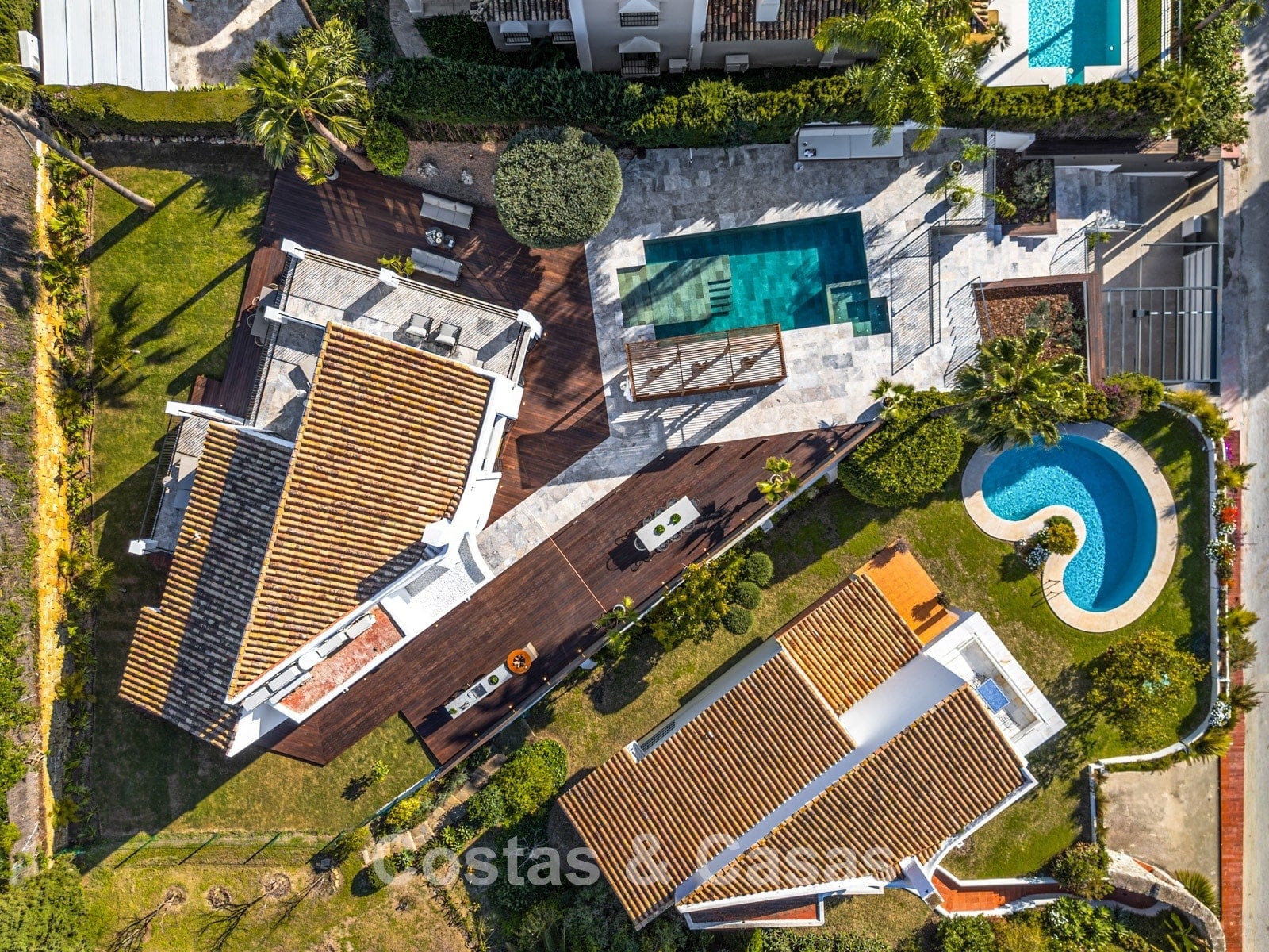 Spacious, fully fenced plot in an elevated position. Beautifully landscaped garden with generous terraces, an integrated outdoor kitchen, and a stylish barbecue area. Stunning private garden-level swimming pool adjacent to the sun deck. South-west facing. Breathtaking, open views over the green golf courses and the blue horizon of the sea.