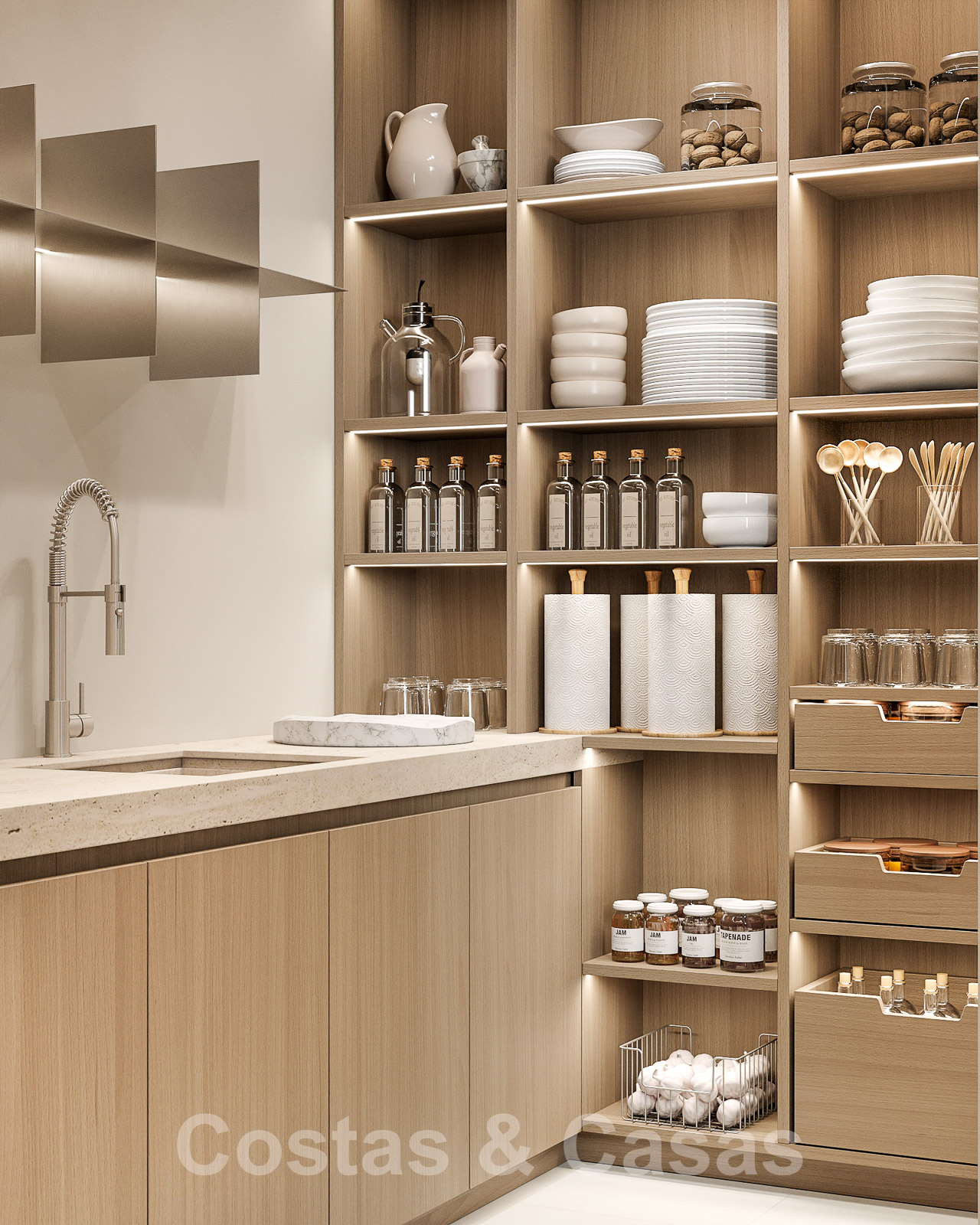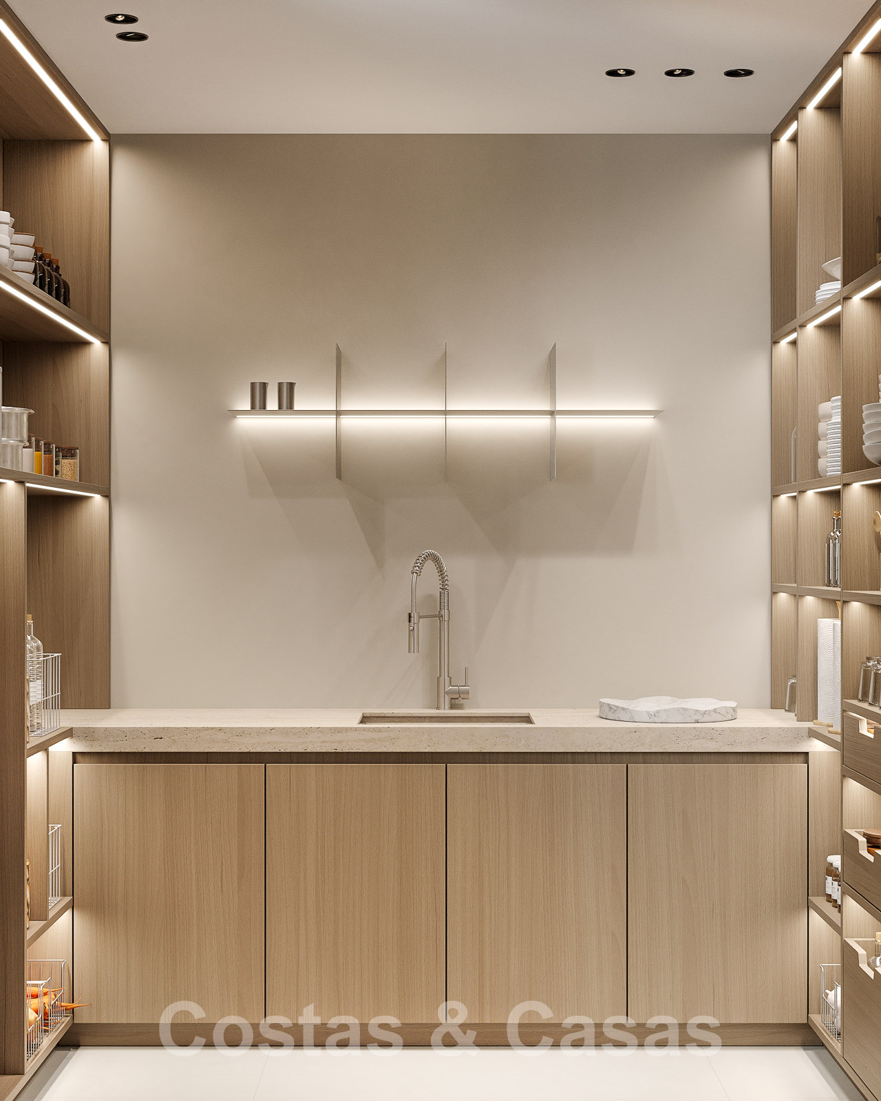 Large bespoke modernist kitchen with breakfast bar and adjacent additional pantry.