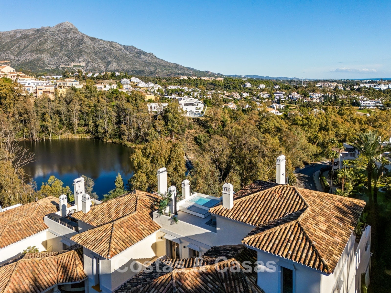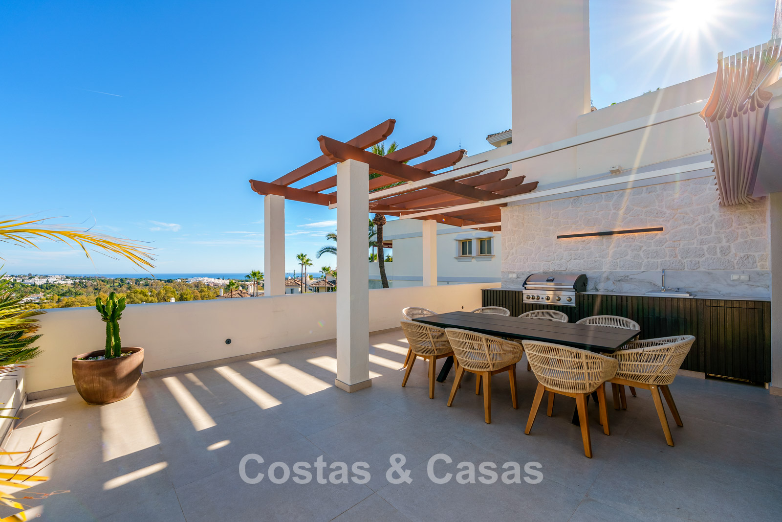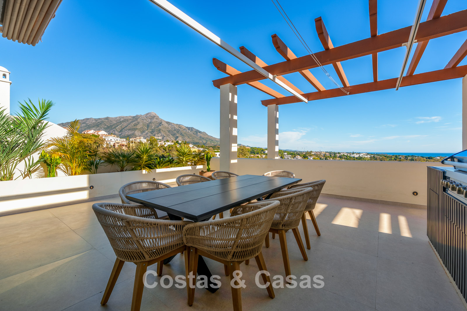 Exceptional duplex penthouse featuring a harmonious blend of modern design and comfort. Recently renovated to the highest contemporary standards. Thanks to its south-facing orientation, the property enjoys abundant natural light throughout the day. A spacious terrace offers a fully equipped outdoor kitchen and barbecue area. The upper floor is a true oasis of tranquillity, featuring a private swimming pool and expansive terraces with breathtaking views over the lake, the golf valley stretching to the Mediterranean Sea, and the surrounding mountains. Modern interior with an open-plan layout. Open living area with lounge and integrated dining space. Sleek open-plan designer kitchen fully equipped with Gaggenau appliances and a central island with breakfast bar. 3 bedrooms, 3 bathrooms and a separate guest toilet. Laundry room. 2 underground parking spaces, 2 golf buggy parking spaces and a storage room.