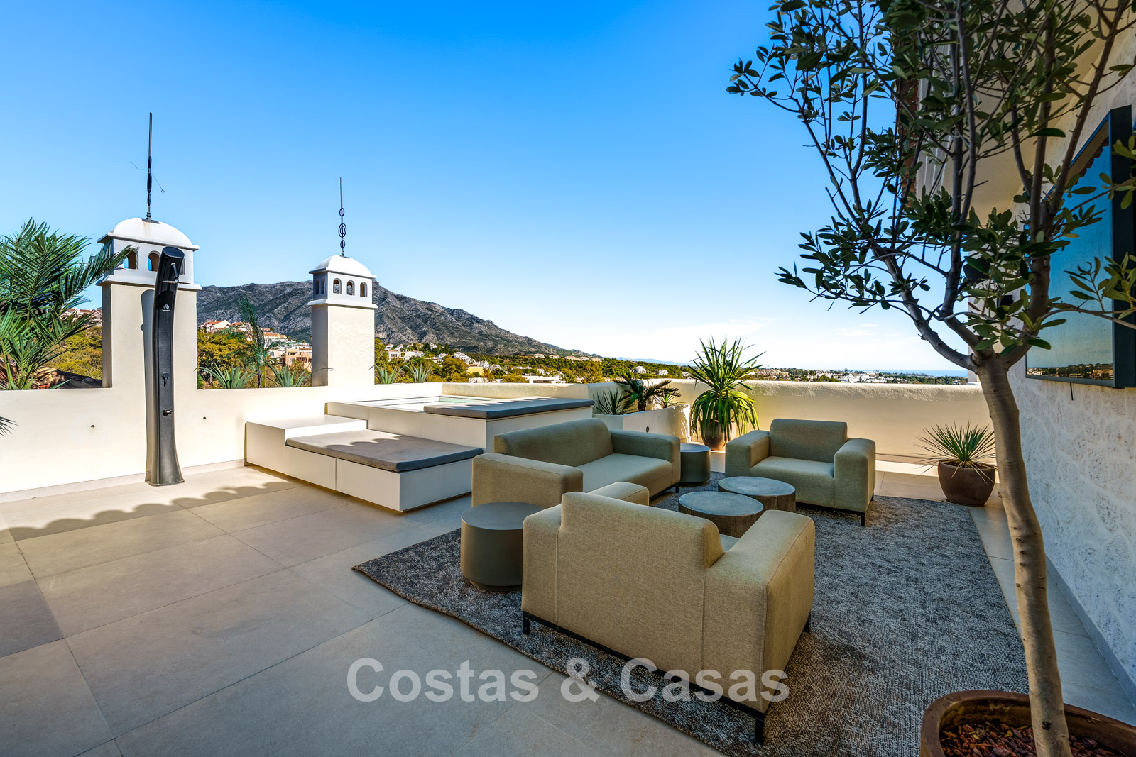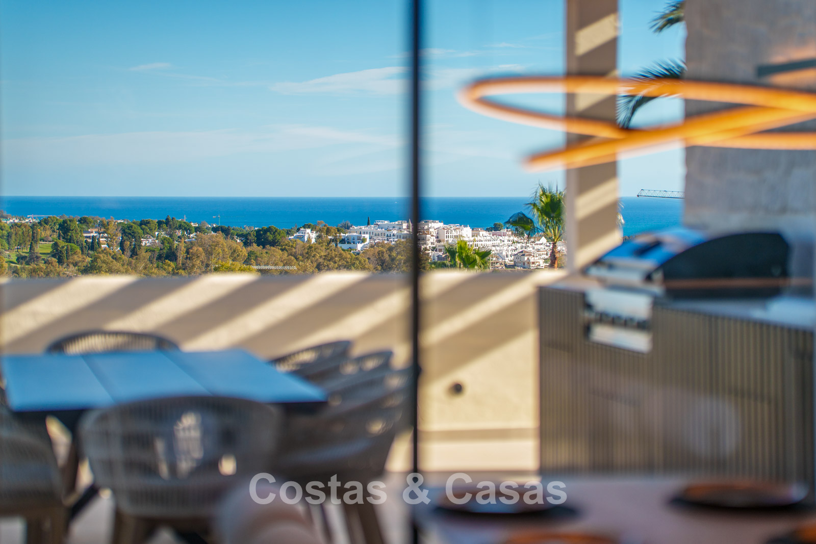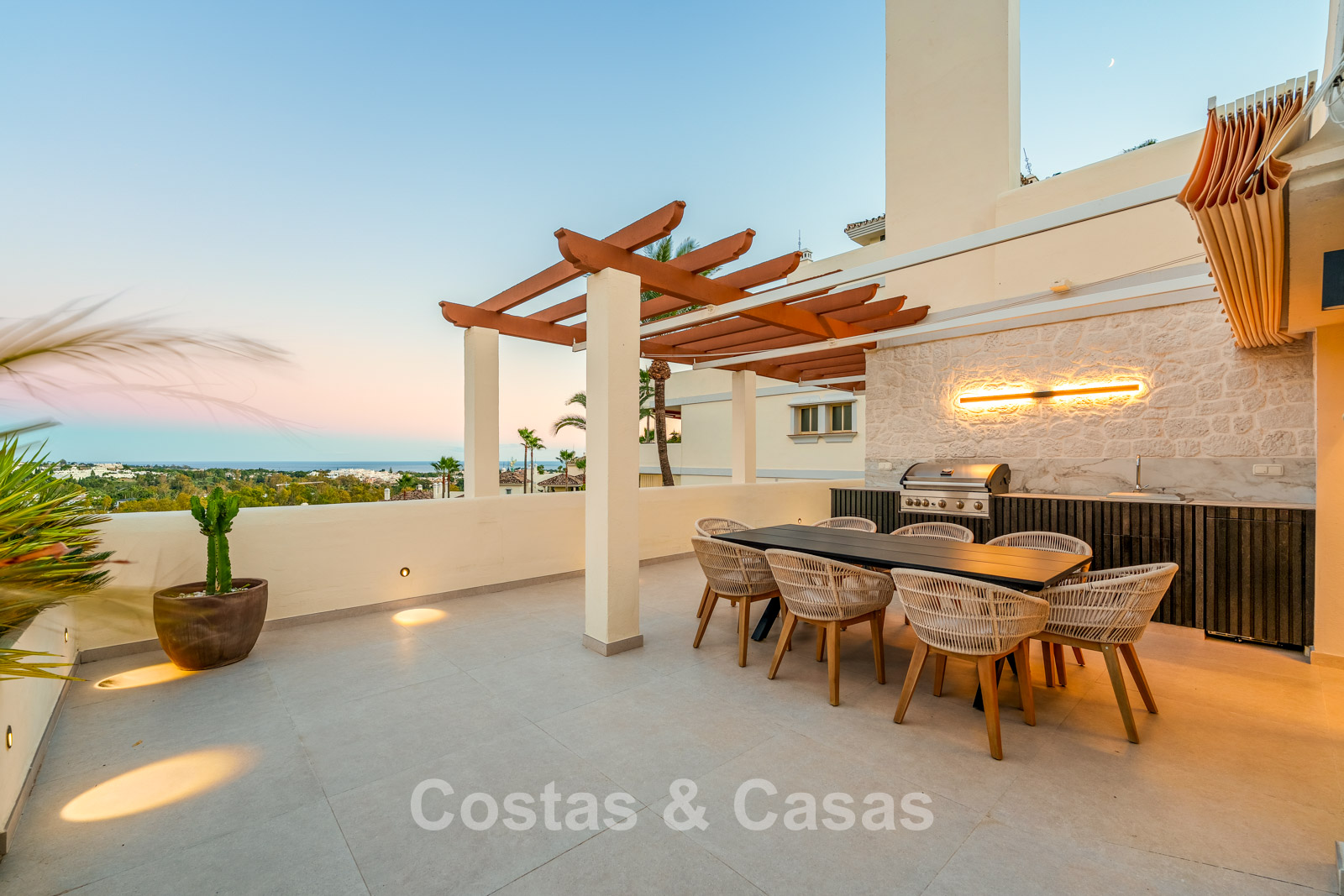 Exceptional duplex penthouse featuring a harmonious blend of modern design and comfort. Recently renovated to the highest contemporary standards. Thanks to its south-facing orientation, the property enjoys abundant natural light throughout the day. A spacious terrace offers a fully equipped outdoor kitchen and barbecue area. The upper floor is a true oasis of tranquillity, featuring a private swimming pool and expansive terraces with breathtaking views over the lake, the golf valley stretching to the Mediterranean Sea, and the surrounding mountains. Modern interior with an open-plan layout. Open living area with lounge and integrated dining space. Sleek open-plan designer kitchen fully equipped with Gaggenau appliances and a central island with breakfast bar. 3 bedrooms, 3 bathrooms and a separate guest toilet. Laundry room. 2 underground parking spaces, 2 golf buggy parking spaces and a storage room.