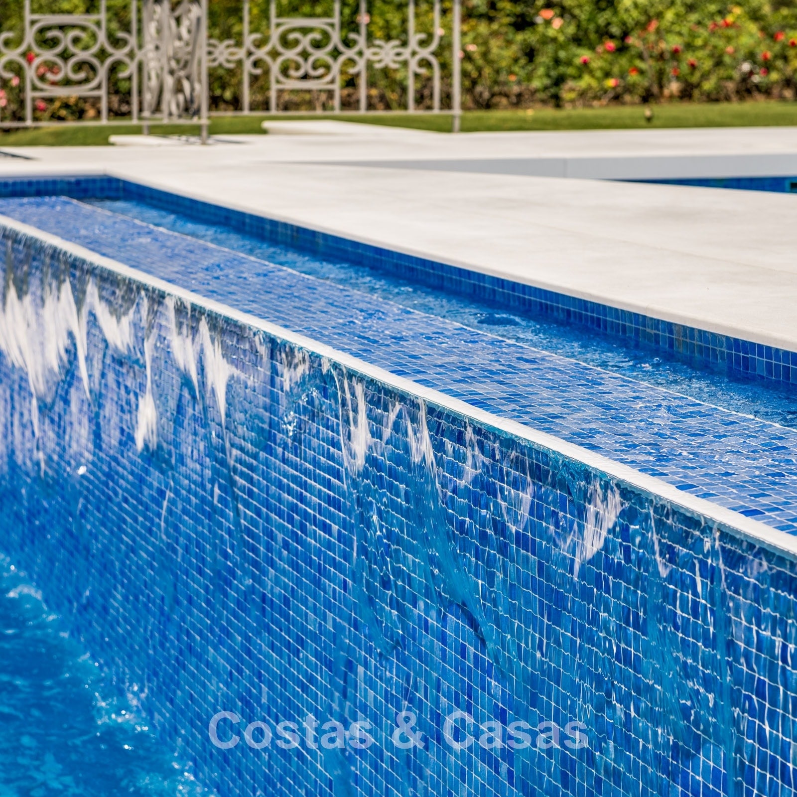 Spacious elevated plot directly bordering the golf course. Beautifully landscaped garden with manicured lawns, framed by lush Mediterranean planting. Extensive terraces with multiple lounge and dining areas offer the perfect setting to enjoy the sun, views and privacy. A charming Andalusian patio with decorative fountain, colourful tiles and abundant planting creates a peaceful and elegant outdoor space. The impressive infinity pool is the centrepiece of the exterior, featuring an elevated section that subtly flows into a lower pool, surrounded by terraces with comfortable sun loungers. Elegant gazebo with TV lounge and bar, complemented by a barbecue and comfortable dining area for memorable outdoor moments. South-east orientation. Views over the expansive garden and green golf fairways.