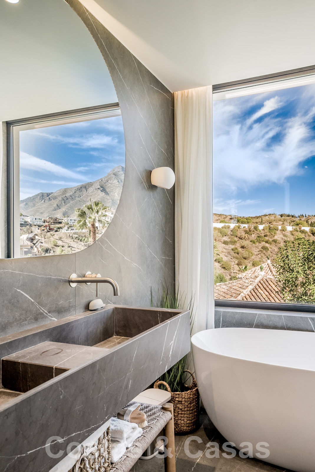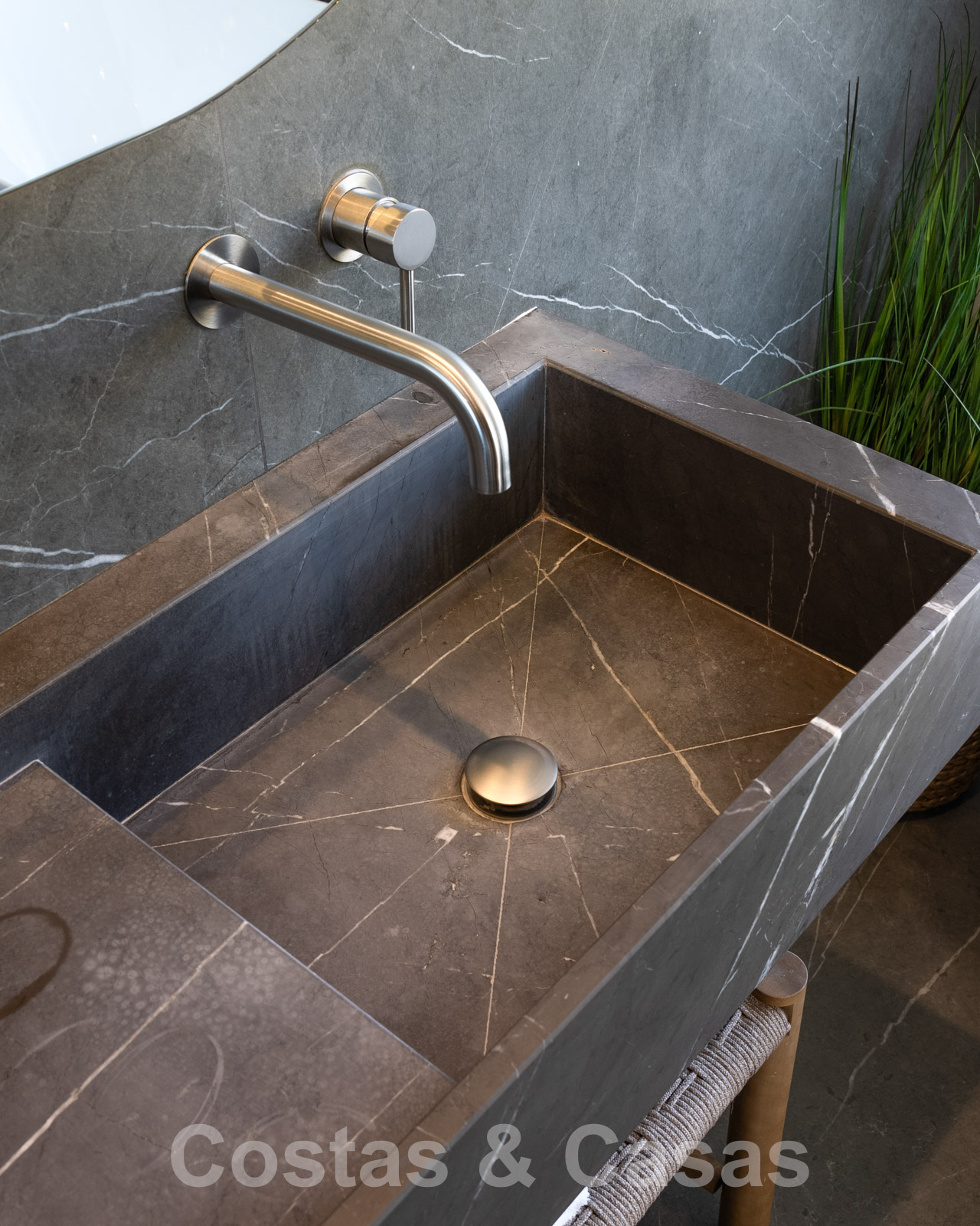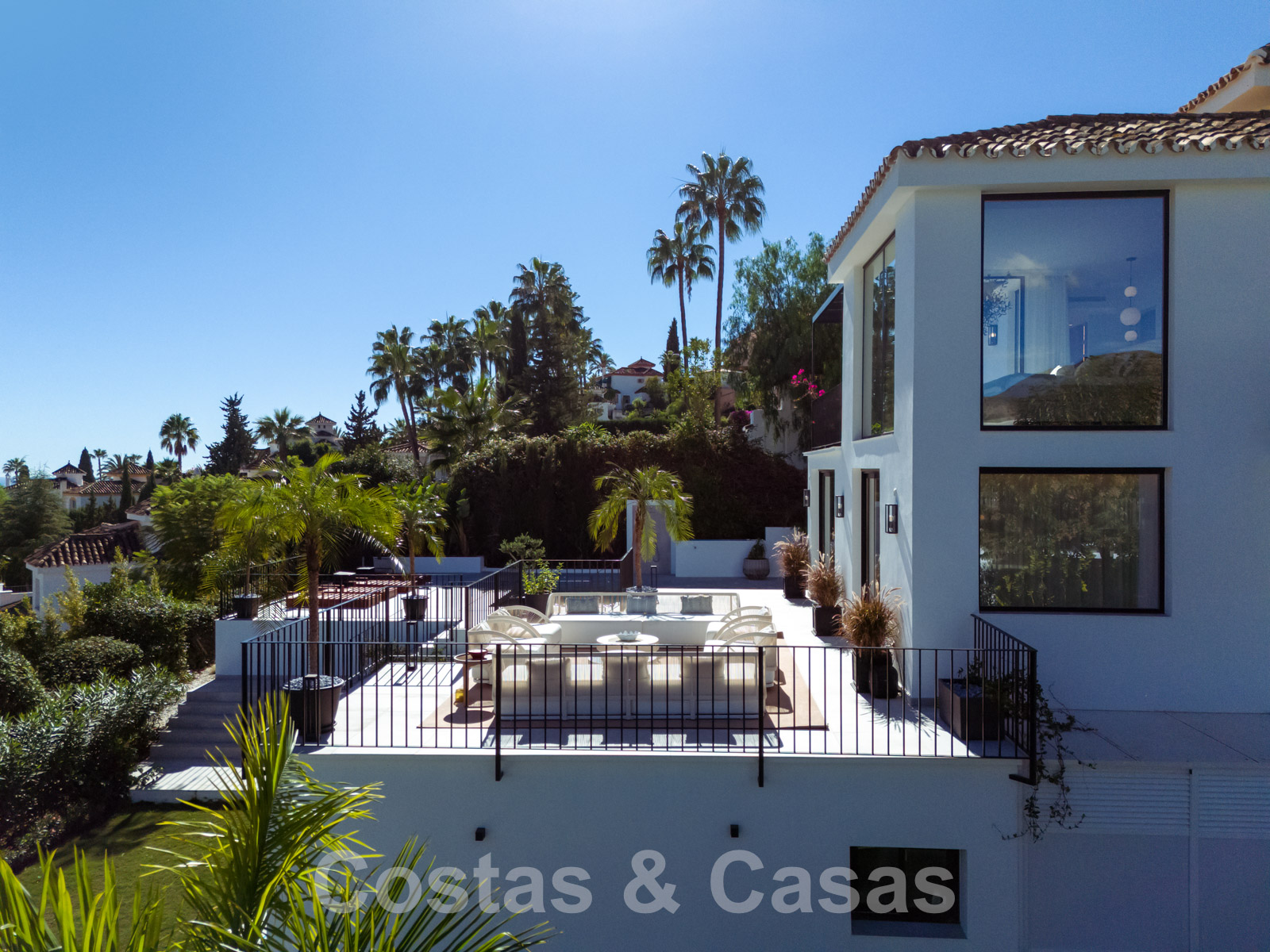 Spacious, fully fenced corner plot. Private swimming pool, completely surrounded by a sun terrace. Multiple open terraces equipped with relaxation facilities. Covered outdoor kitchen equipped with barbecue and 'al fresco dining area'. Oriented from south to east with panoramic views over the golf valley, to the picturesque La Concha mountain peak and partly to the Mediterranean Sea.