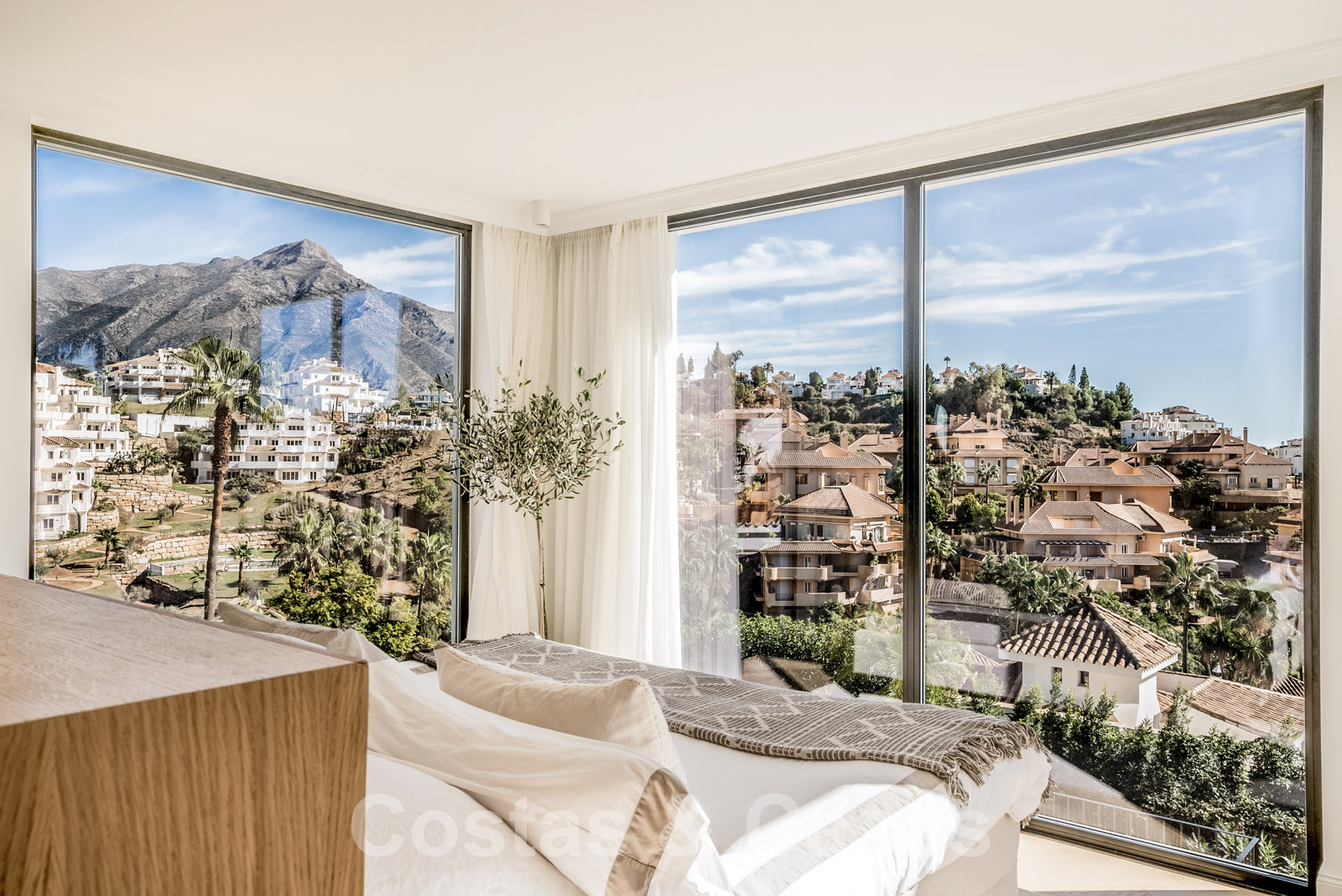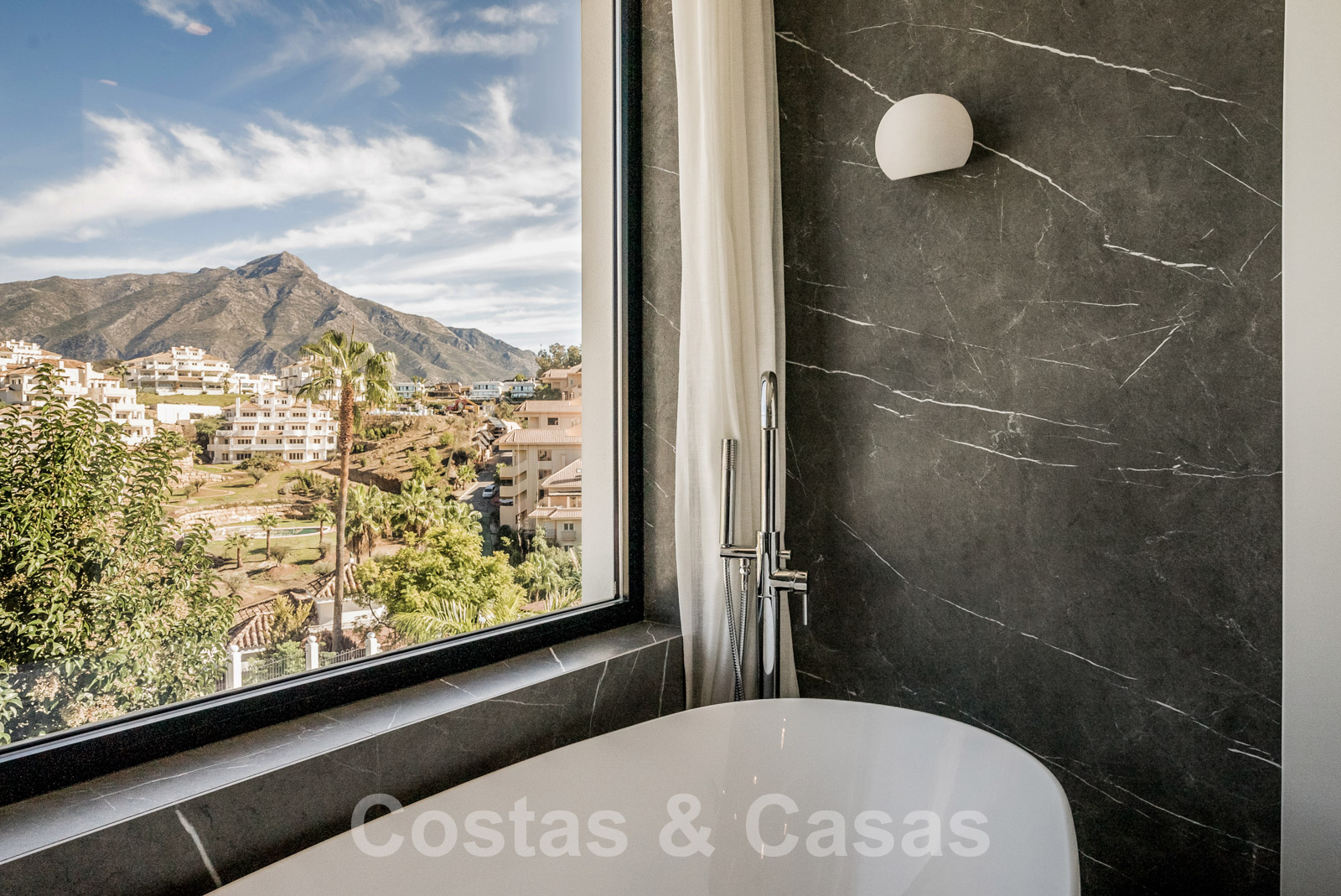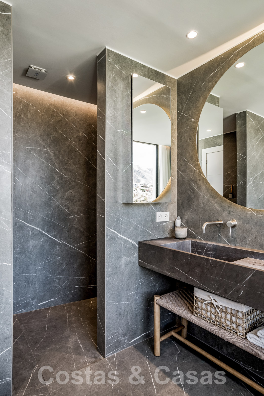 Spacious, fully fenced corner plot. Private swimming pool, completely surrounded by a sun terrace. Multiple open terraces equipped with relaxation facilities. Covered outdoor kitchen equipped with barbecue and 'al fresco dining area'. Oriented from south to east with panoramic views over the golf valley, to the picturesque La Concha mountain peak and partly to the Mediterranean Sea.