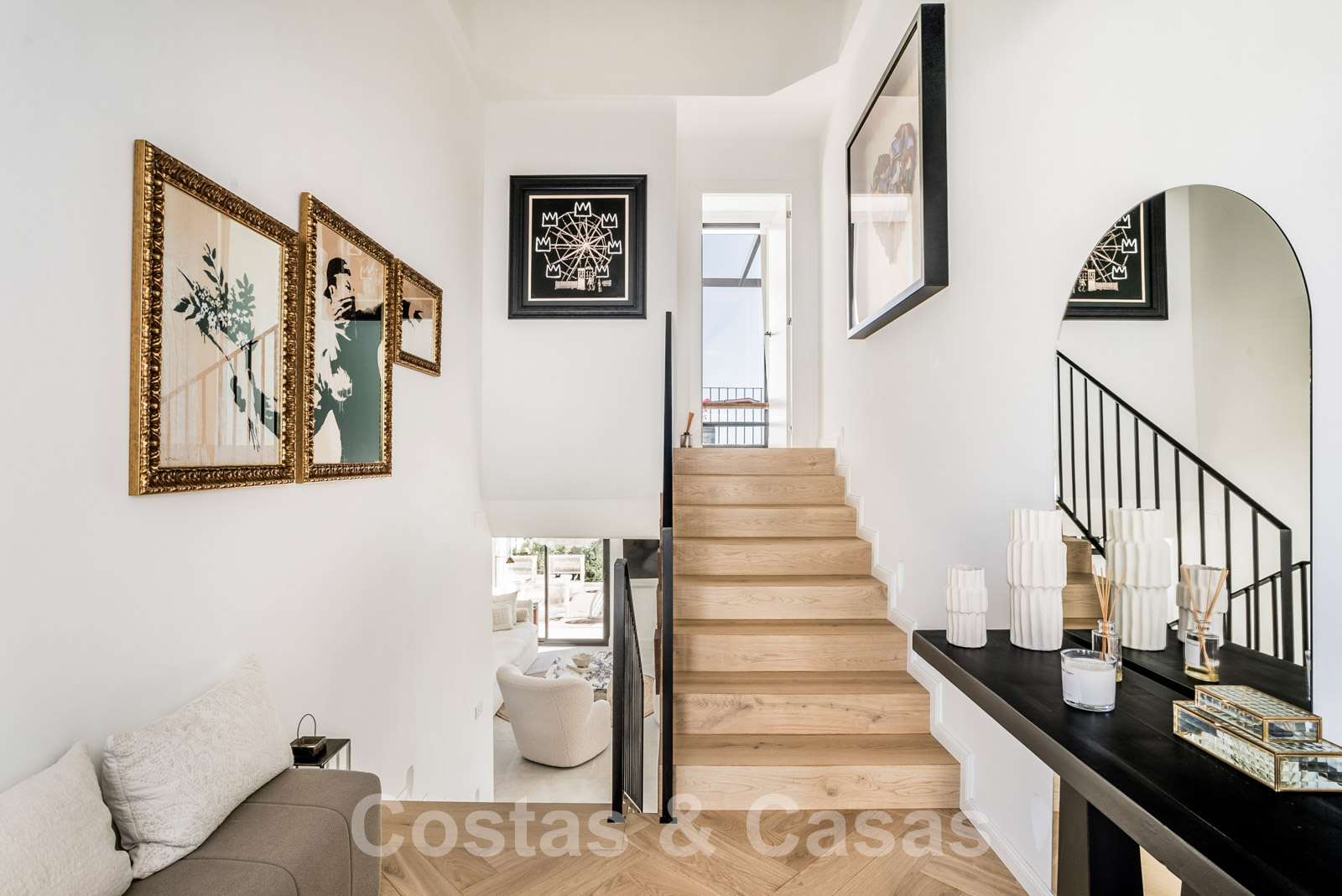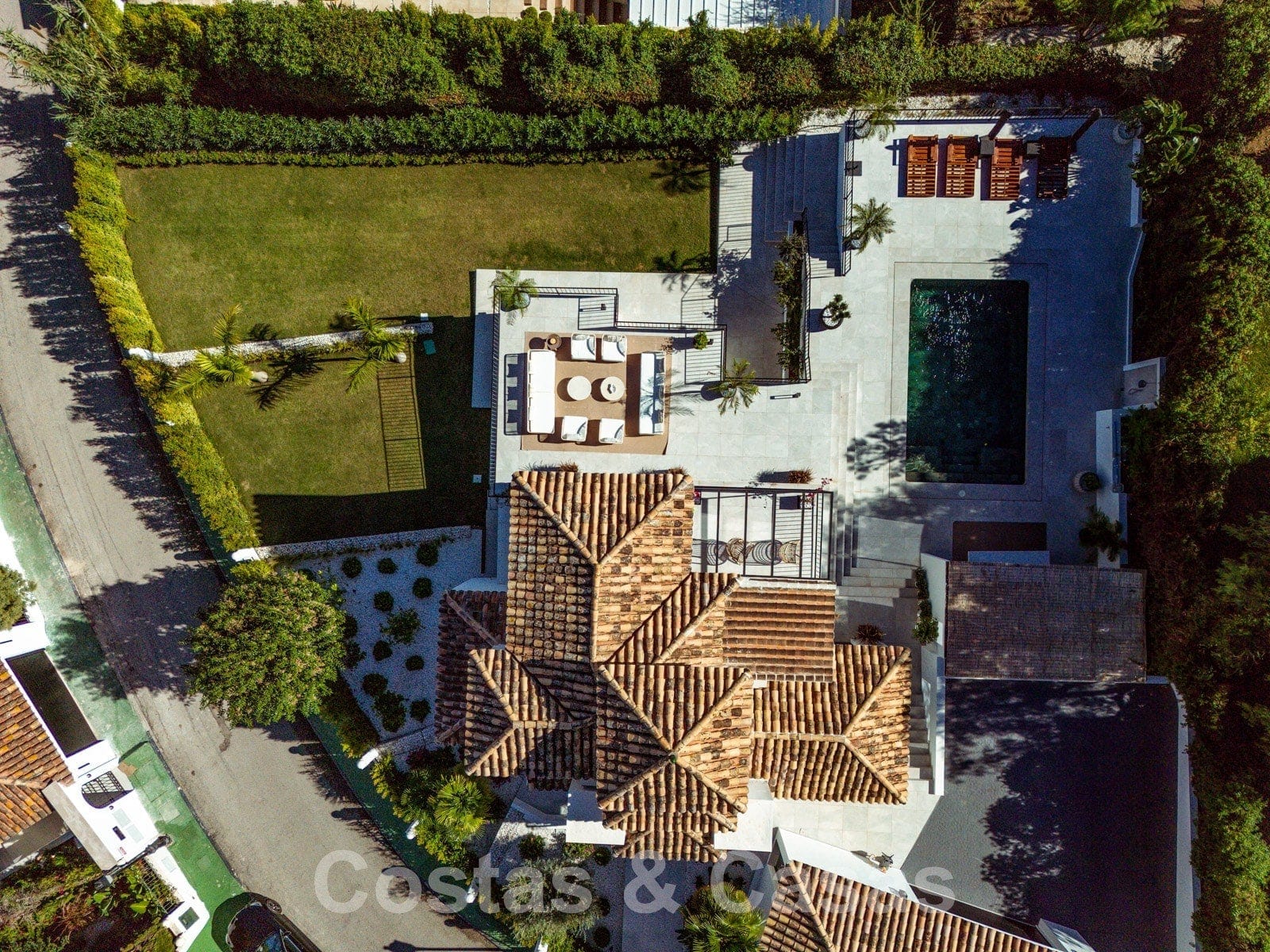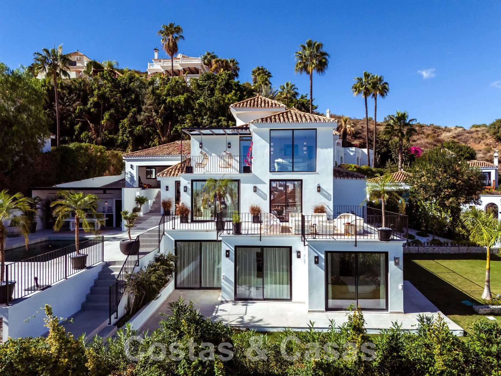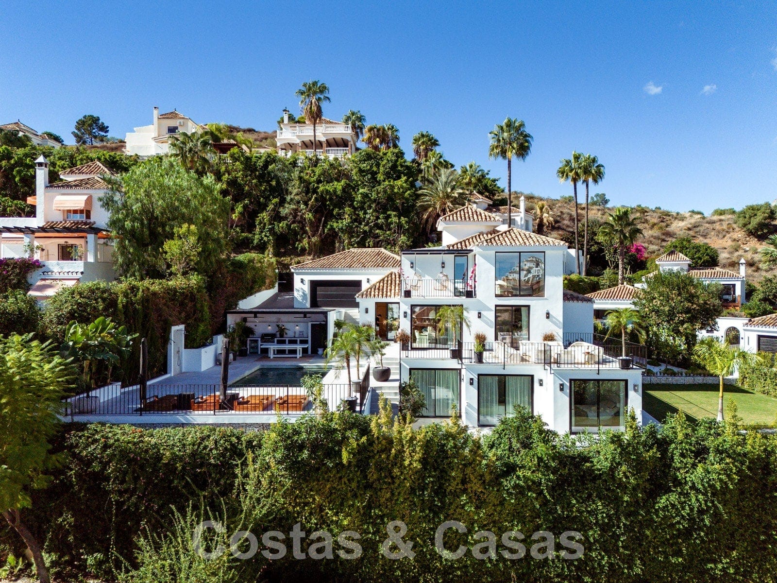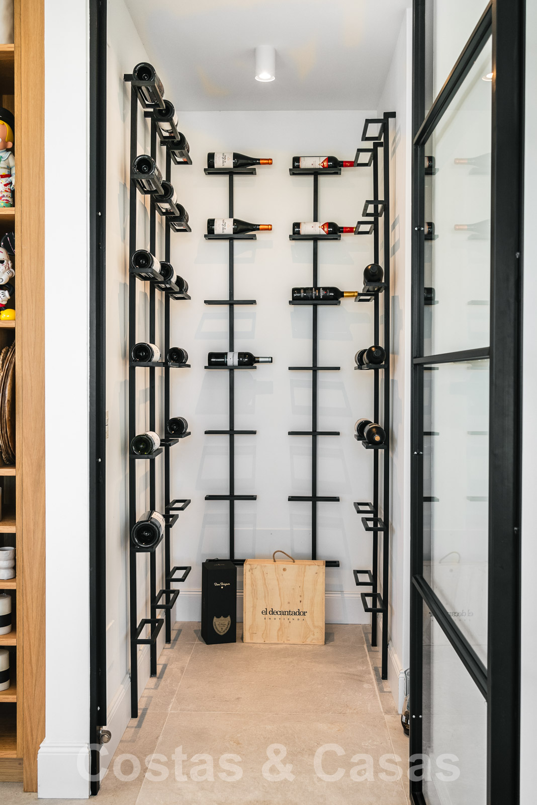 Detached villa with modern architecture combined with Andalusian touches such as terracotta roof tiles, adding charm and character. Using high-quality materials. Timeless, elegant interior with sophisticated neutral tones. Airy living space with a TV lounge and dining area. Open kitchen, fully equipped with Siemens appliances and featuring a kitchen island. A total of 5 bedrooms, 4 bathrooms. The master suite has a spacious, wooden walk-in wardrobe. 2nd TV lounge. Wine bodega. Laundry room. Ceramic tiled floors. Fully furnished guesthouse with access to the garden. Indoor garage for 4 cars.