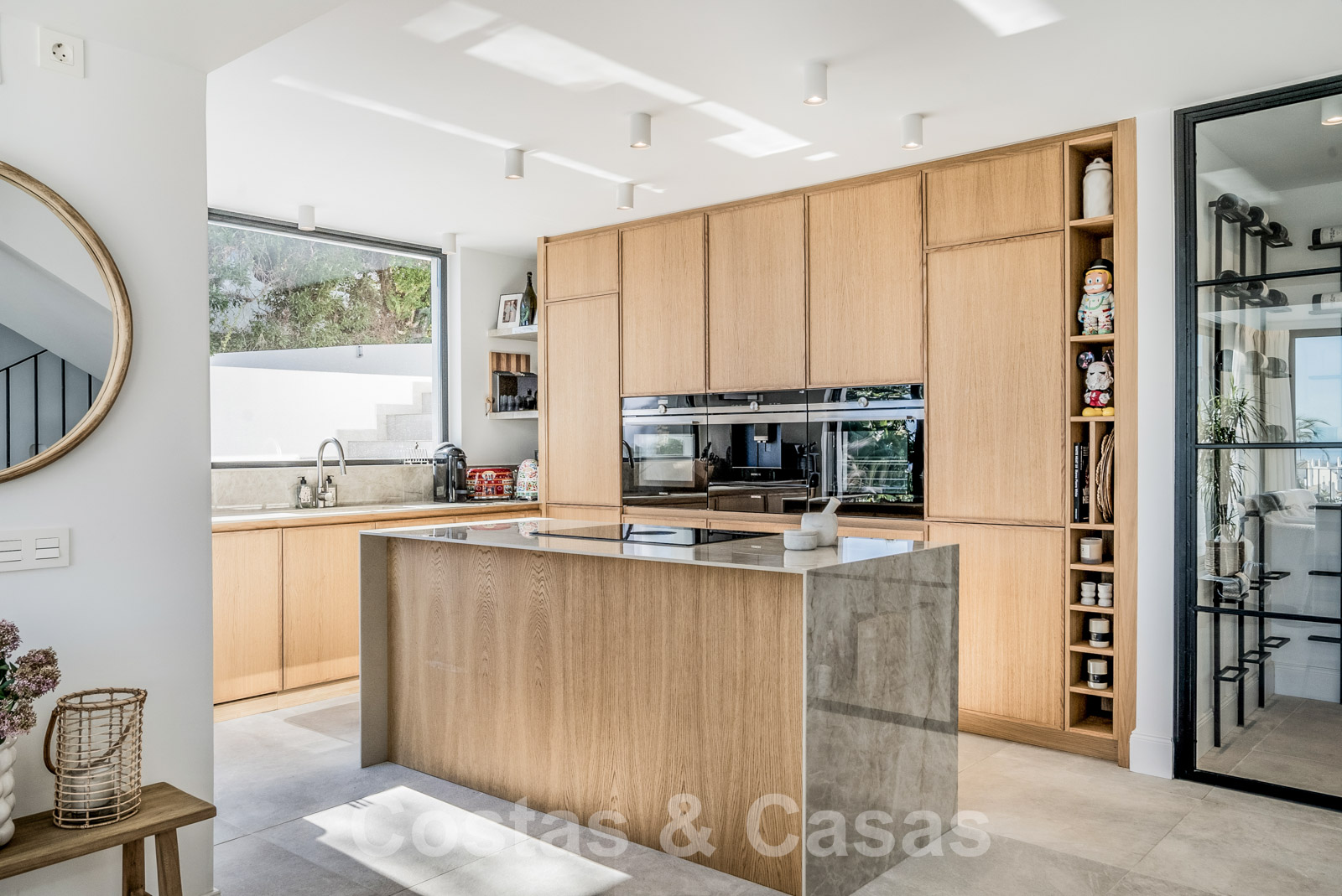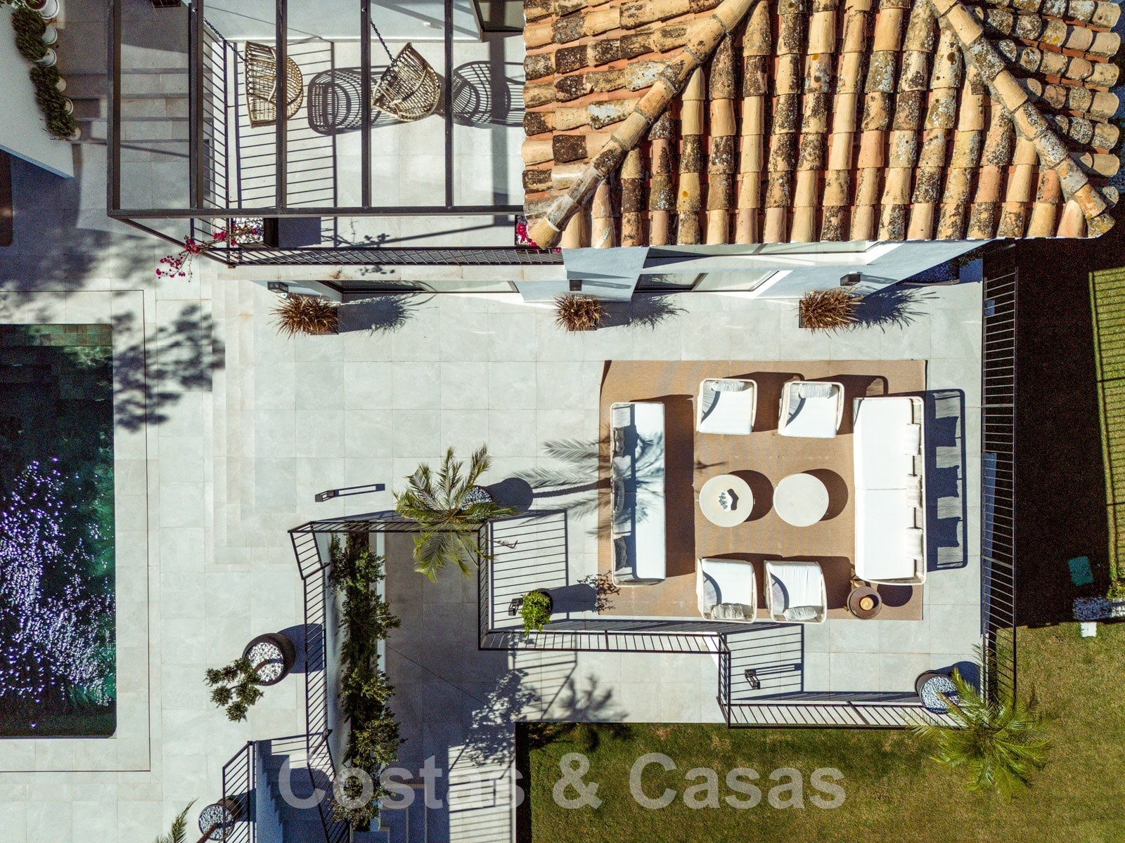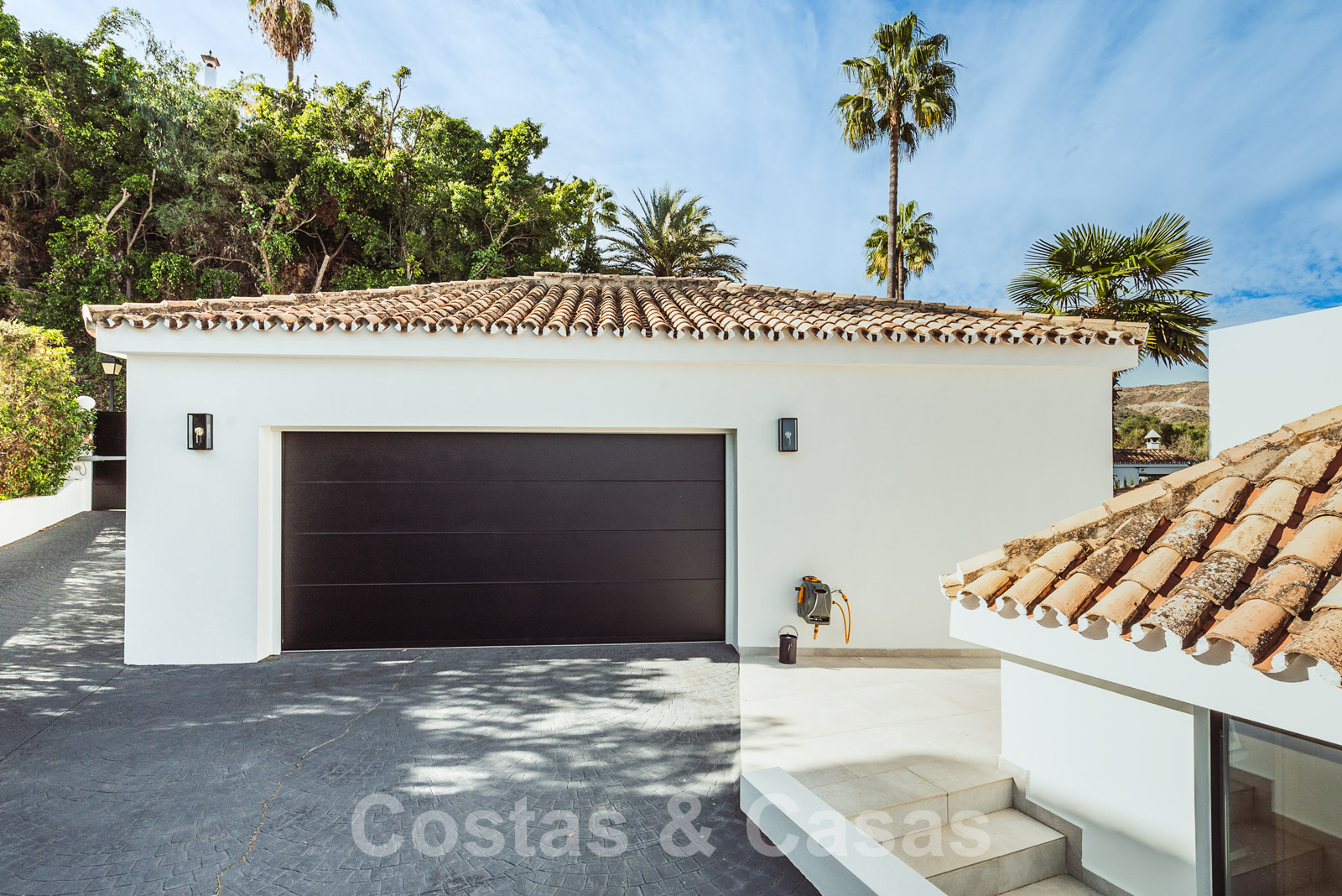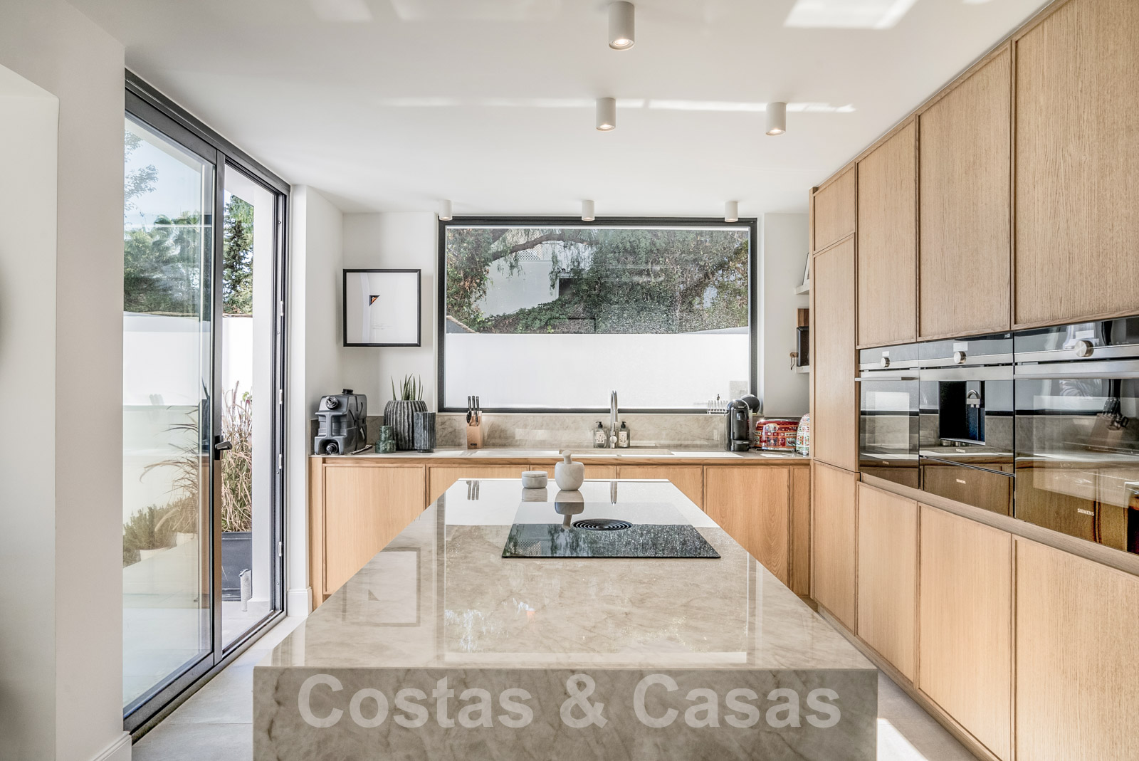 Detached villa with modern architecture combined with Andalusian touches such as terracotta roof tiles, adding charm and character. Using high-quality materials. Timeless, elegant interior with sophisticated neutral tones. Airy living space with a TV lounge and dining area. Open kitchen, fully equipped with Siemens appliances and featuring a kitchen island. A total of 5 bedrooms, 4 bathrooms. The master suite has a spacious, wooden walk-in wardrobe. 2nd TV lounge. Wine bodega. Laundry room. Ceramic tiled floors. Fully furnished guesthouse with access to the garden. Indoor garage for 4 cars.