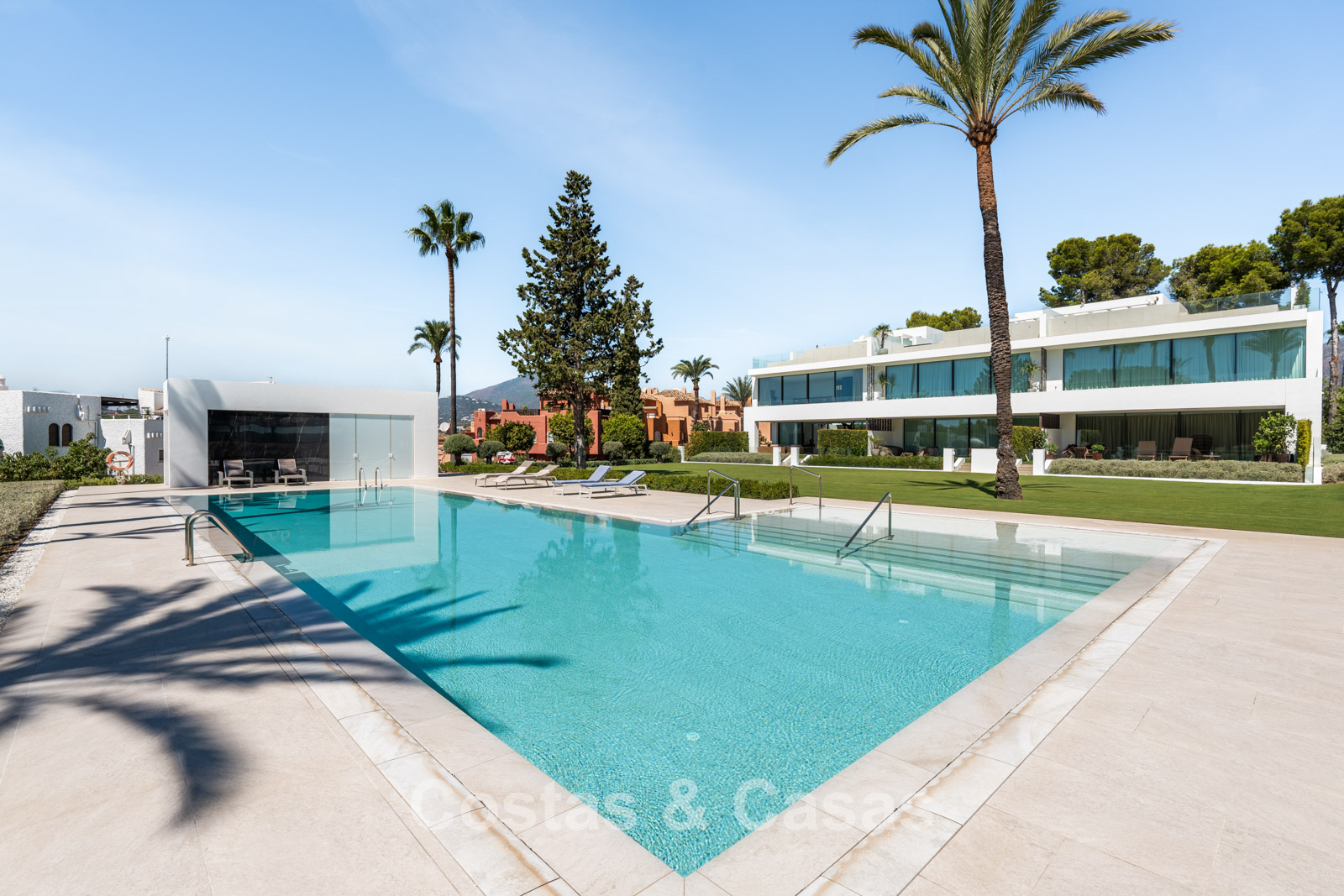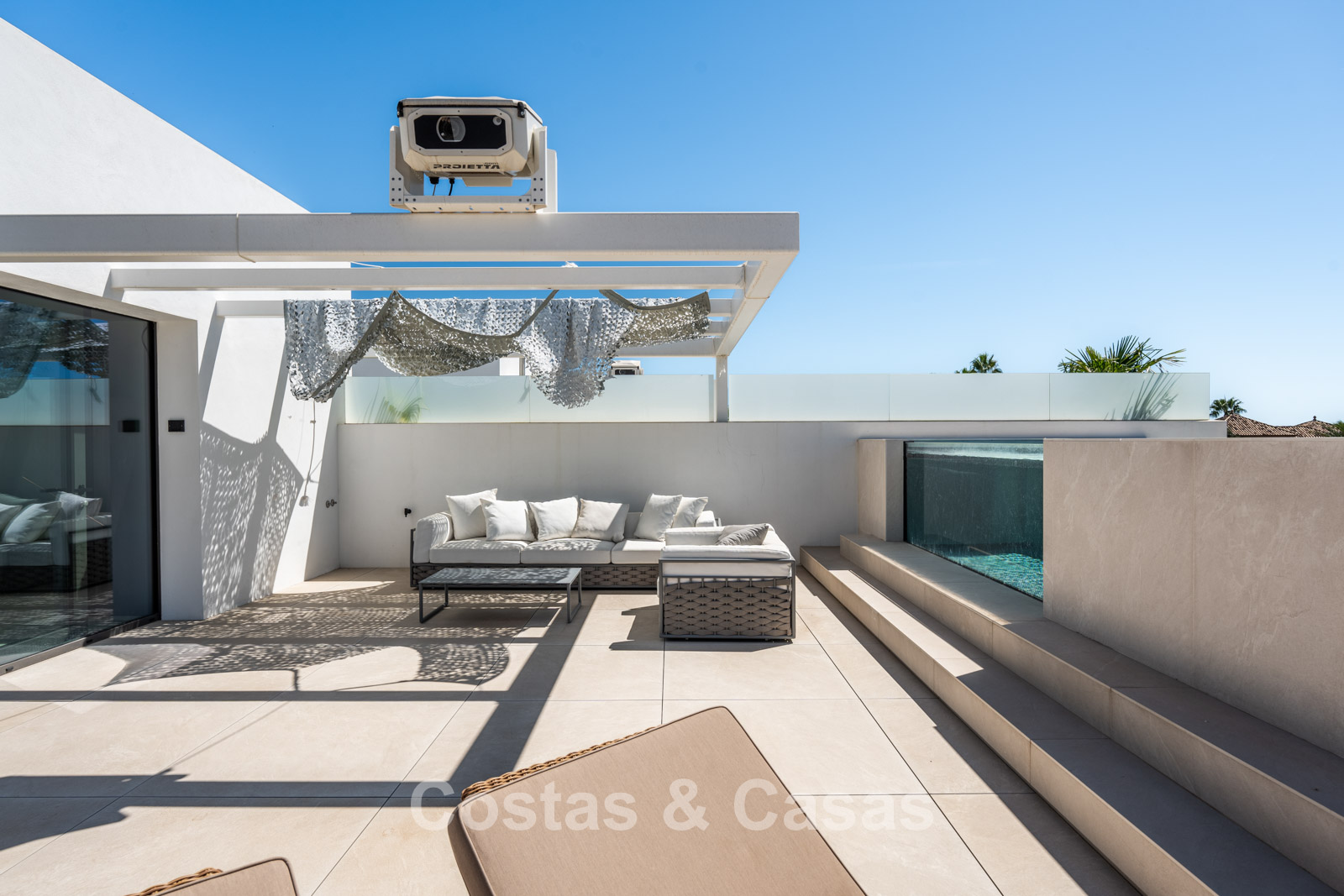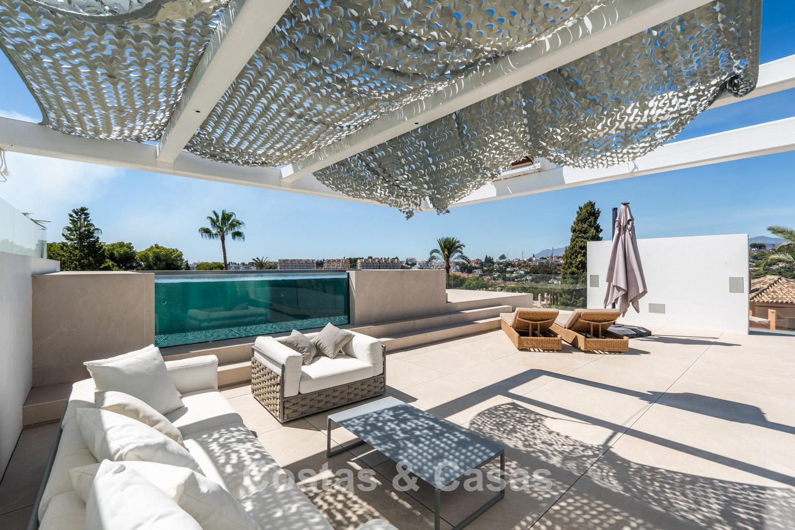 Landscaped exterior with a lawn and a spacious, covered seating area. The generous roof terrace features a private pool and offers the ideal space for creating an outdoor home cinema. South-facing. Views of the communal outdoor areas and the surrounding area, including the iconic La Concha Mountain and a partial view of the Mediterranean Sea.