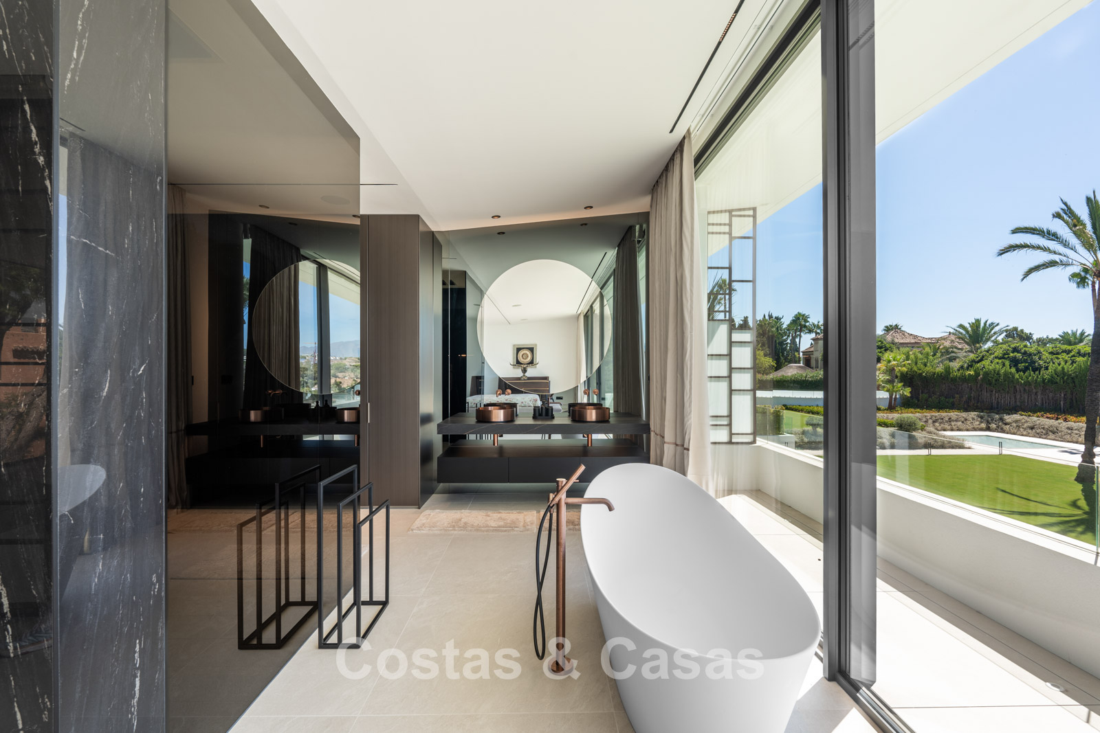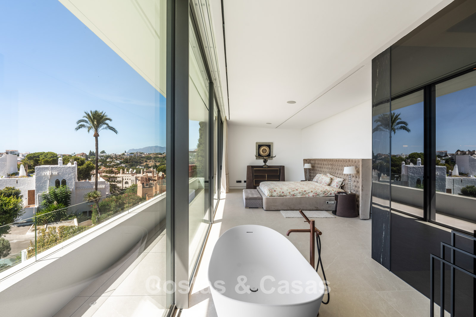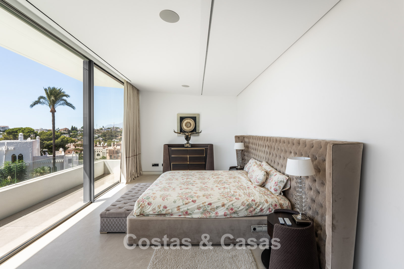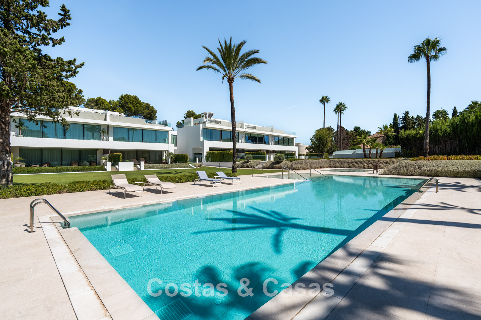 Landscaped exterior with a lawn and a spacious, covered seating area. The generous roof terrace features a private pool and offers the ideal space for creating an outdoor home cinema. South-facing. Views of the communal outdoor areas and the surrounding area, including the iconic La Concha Mountain and a partial view of the Mediterranean Sea.