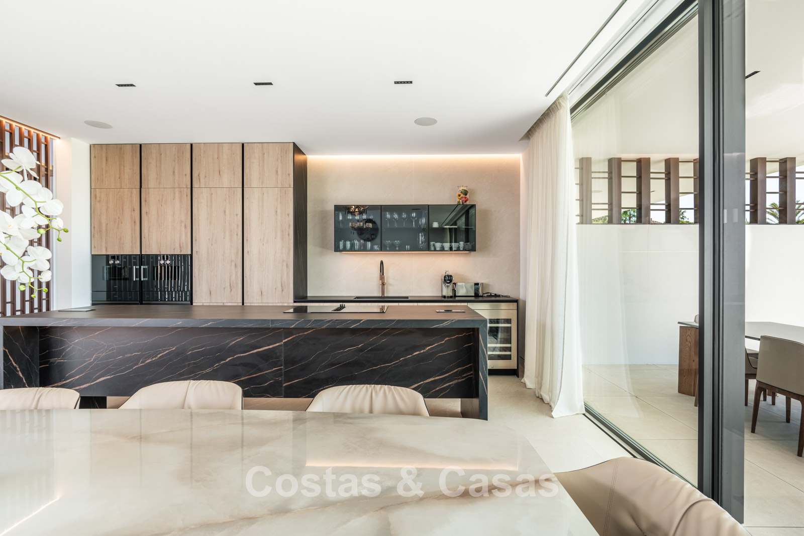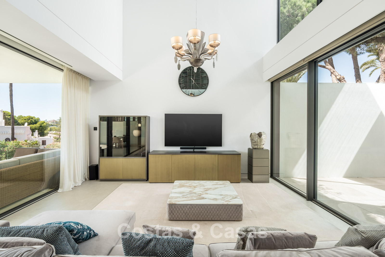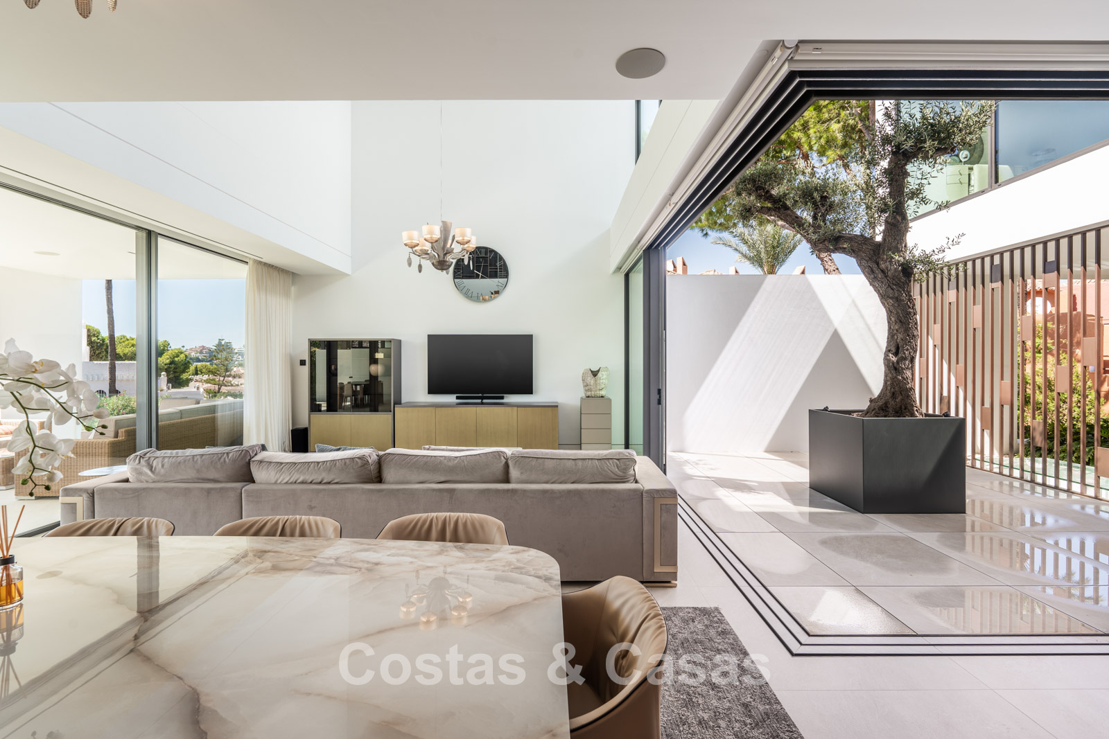 Top-quality semi-detached villa, characterized by a modern and prestigious design. Completed in 2023 and equipped with high-quality finishes. Finished with the utmost precision and a harmonious blend of comfort, elegance, and practicality. The floor-to-ceiling sliding windows, combined with recessed frames, blend the indoors and outdoors seamlessly, filling the interior with abundant natural light. Living and dining area with double-height ceilings and direct access to the terrace. Open-plan, custom-designed kitchen, equipped with Gaggenau appliances and a breakfast island. 4 bedrooms and 5 bathrooms. The master suite features a spacious walk-in closet, open-plan bathroom, and a private terrace. Porcelanosa marble finishes and oak floors. Storage room. 3 underground parking spaces with direct access.