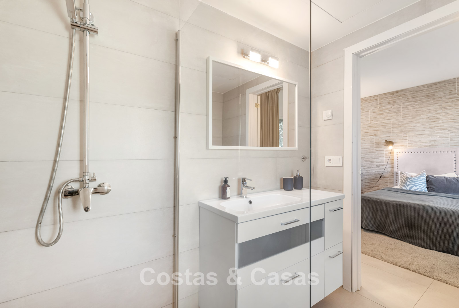 Detached villa with a modern Andalusian architectural style. Using high-quality materials. Contemporary and bright interior. Large living space with open layout. Practical kitchen, fully equipped with Siemens appliances and a central seating island. Integrated dining area. Large windows throughout the villa provide light. A total of 4 bedrooms, 3 bathrooms and guest toilet. Office space. Cream colored tiled floors.