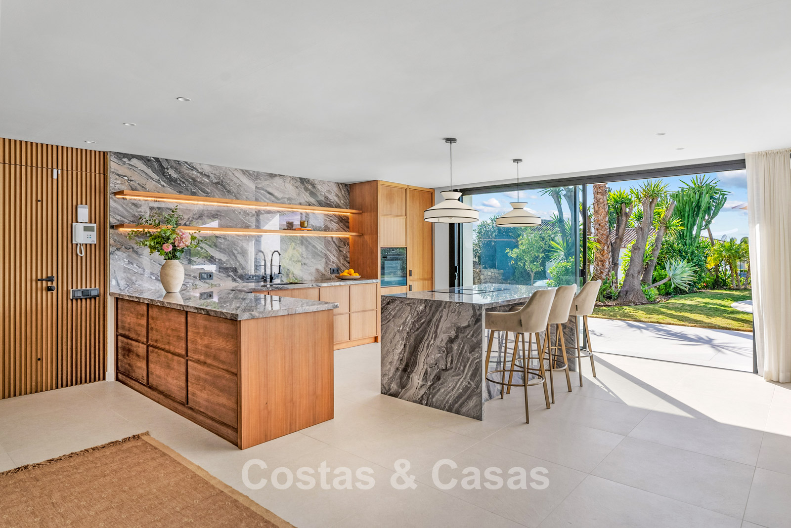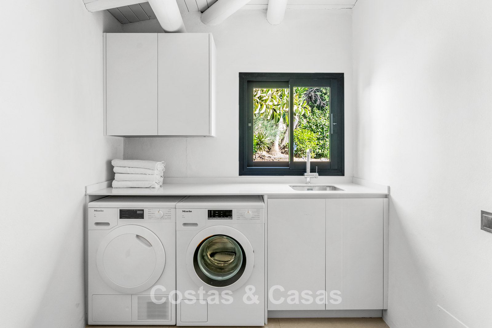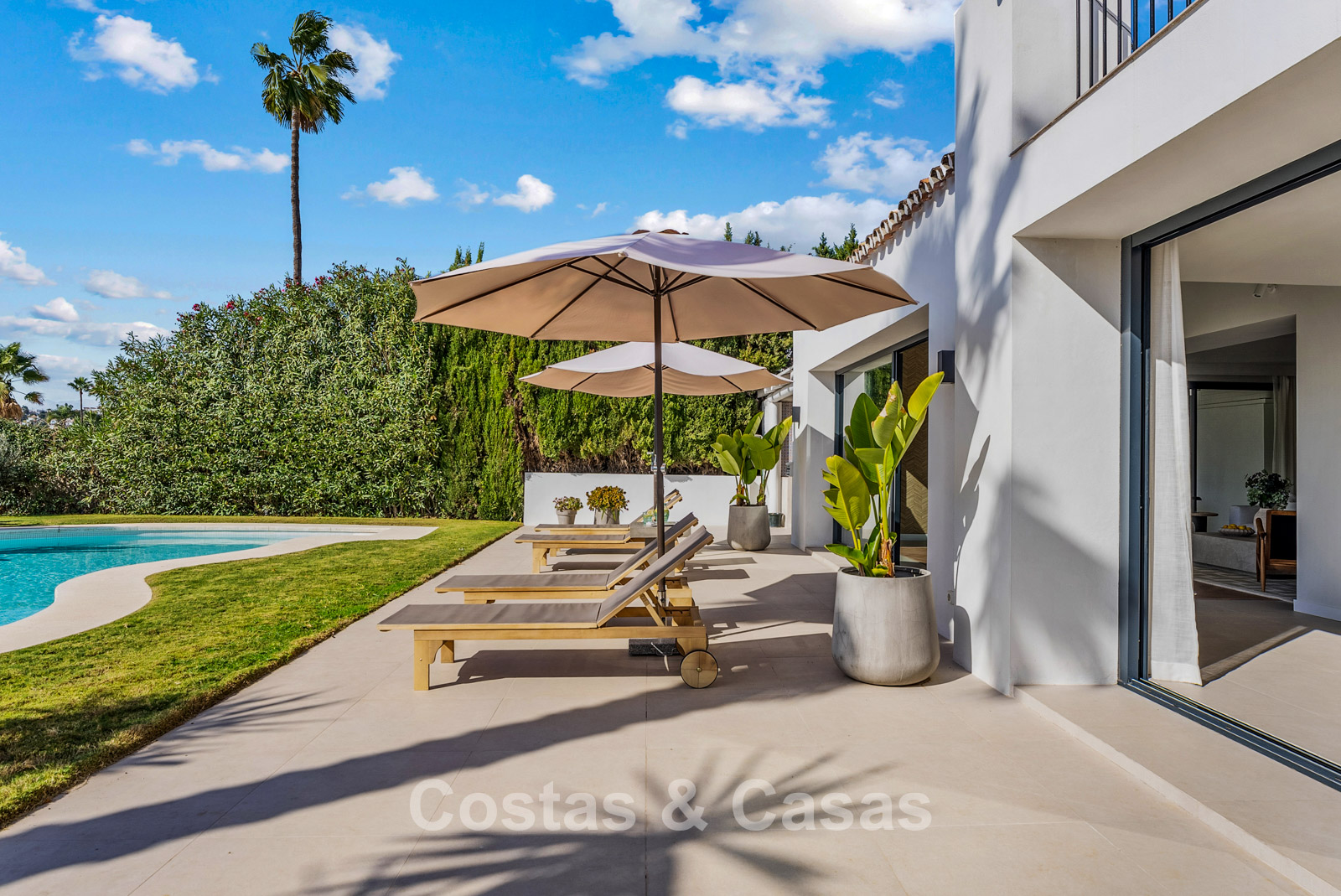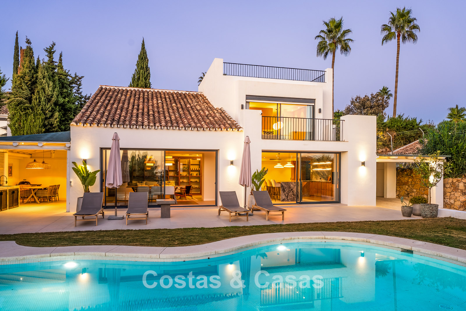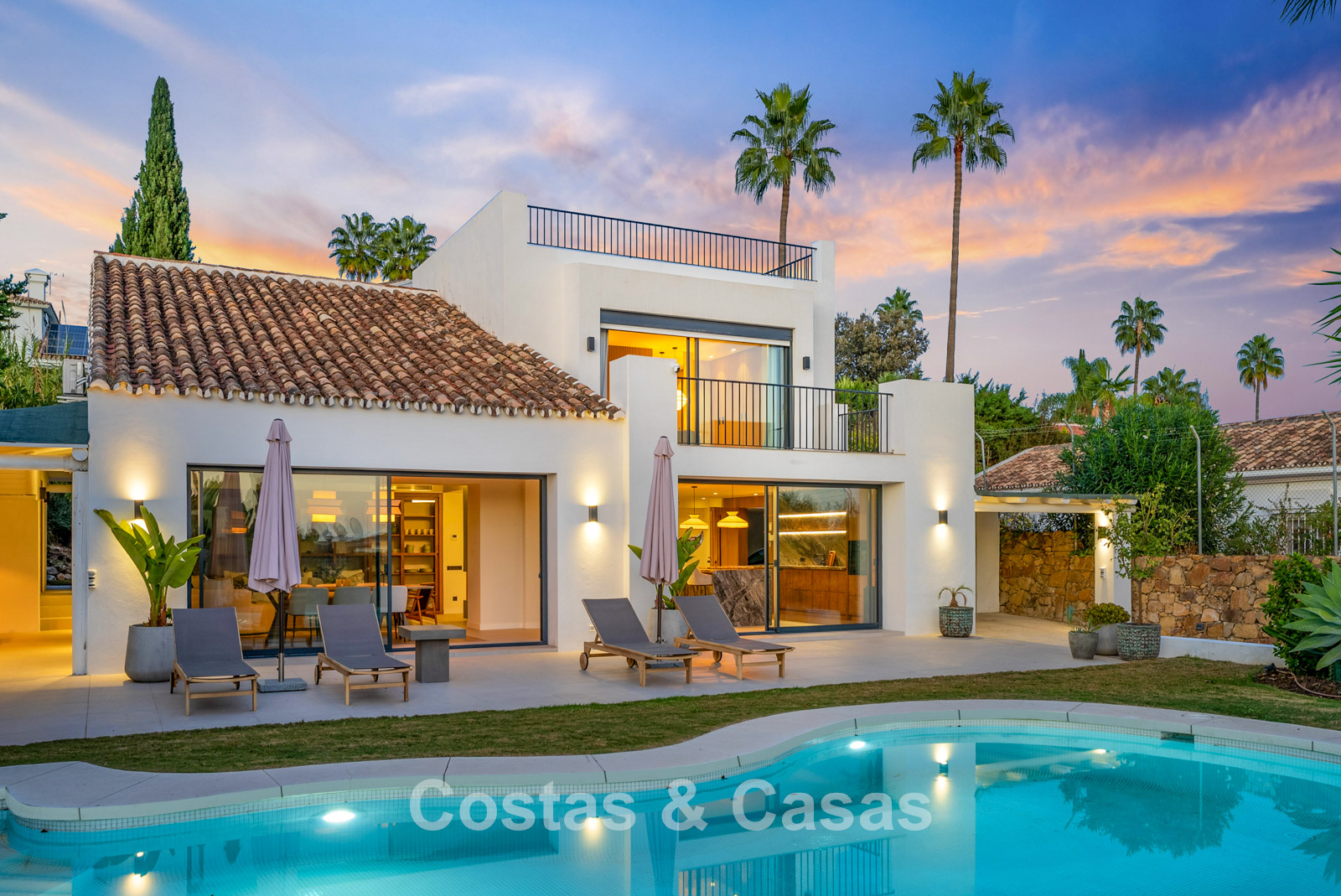 This detached villa has recently been fully renovated in a timeless Scandinavian style. The property is distributed over two floors plus a rooftop terrace. Only premium materials such as natural stone and oak wood have been used throughout. The interior exudes luxury and serenity thanks to light colour palettes and minimalist finishes. Floor-to-ceiling sliding glass doors create a seamless transition between indoor and outdoor living. Open-plan living space with a TV lounge and integrated dining area featuring a double-height ceiling. Functional bespoke kitchen equipped with high-end Miele appliances and a central island. 4 bedrooms, 4 bathrooms. Laundry room fitted with high-quality Miele appliances. Covered private parking for 3 to 4 cars.