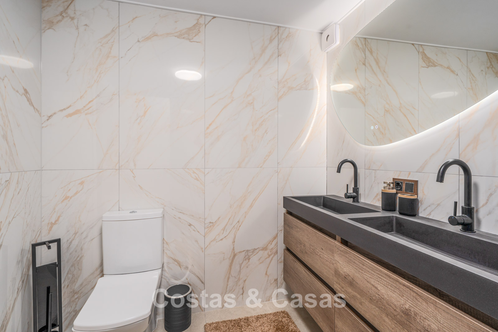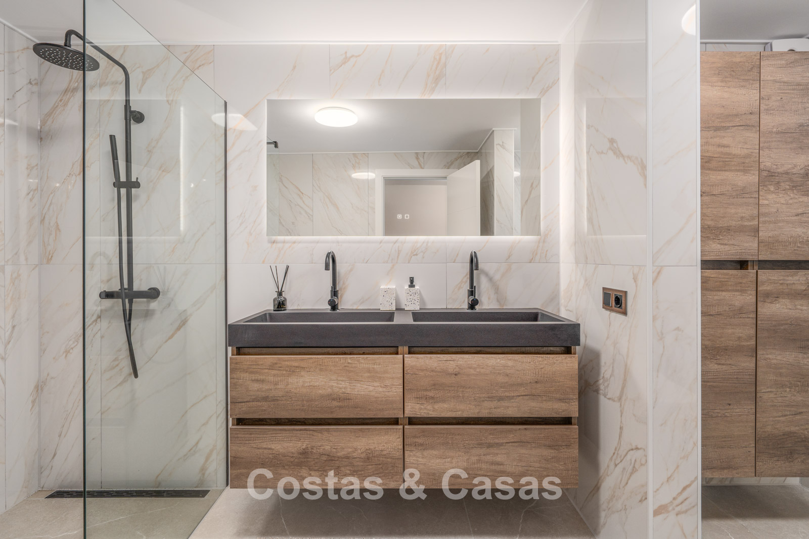 Detached luxury villa with a contemporary Mediterranean look. Recently renovated, using high-quality materials. Large glass areas throughout the villa provide plenty of light and extra ventilation. Open plan layout. Airy and bright living space with a TV lounge and dining area. The kitchen seamlessly connects to the living room and is equipped with plenty of storage space and a breakfast bar with seating. 5 bedrooms each with an en-suite bathroom. An additional bedroom is currently used as an office space. Additional guest toilet. The master suite also benefits from a sauna. High-quality tiled floors. Indoor garage for 1 car.