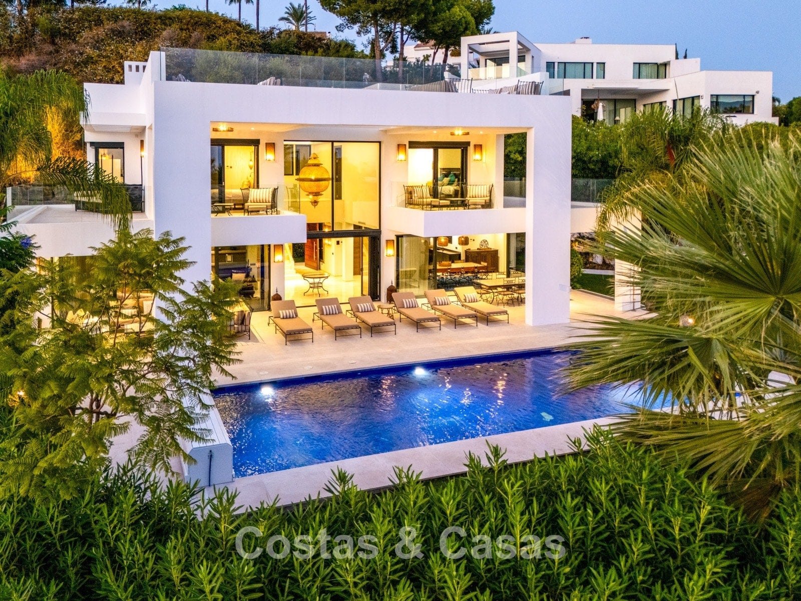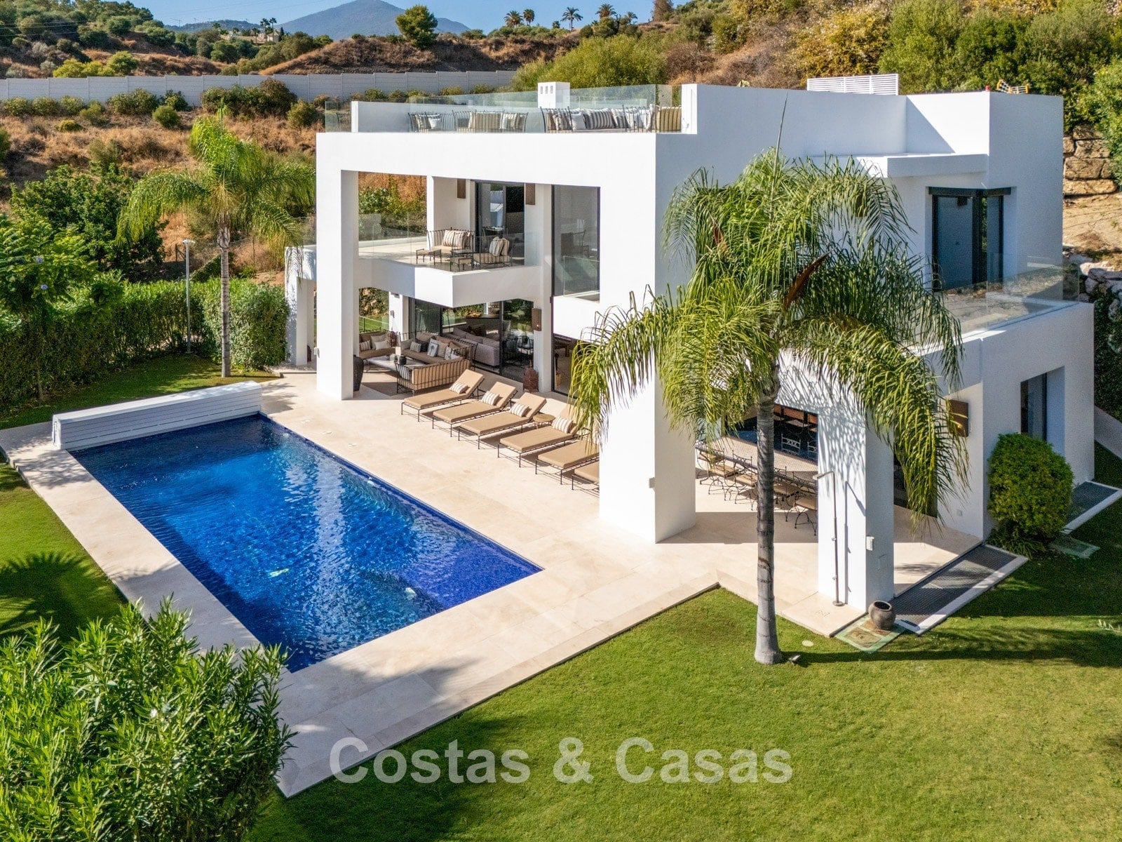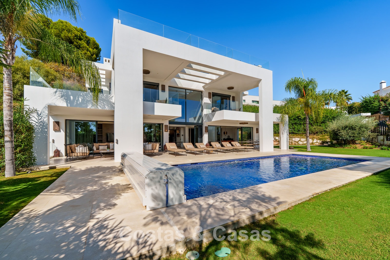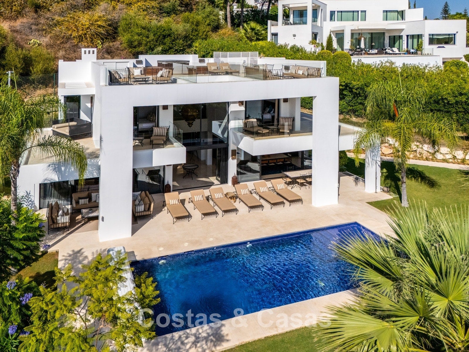 Additional features: Air conditioning (cooling and heating) Underfloor heating in the bathrooms Modern fireplace Fitted wardrobes Double glazing Marble floors Glass balustrades Advanced alarm system LED lighting indoors and outdoors Outdoor shower