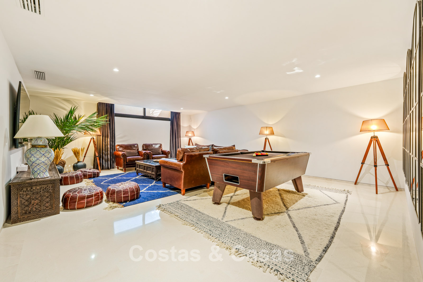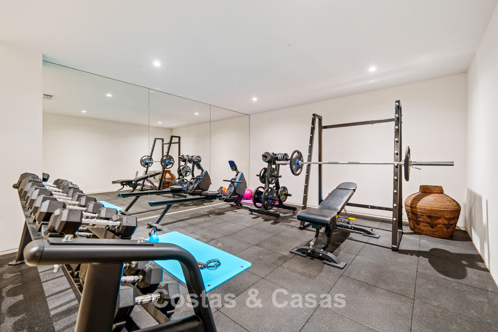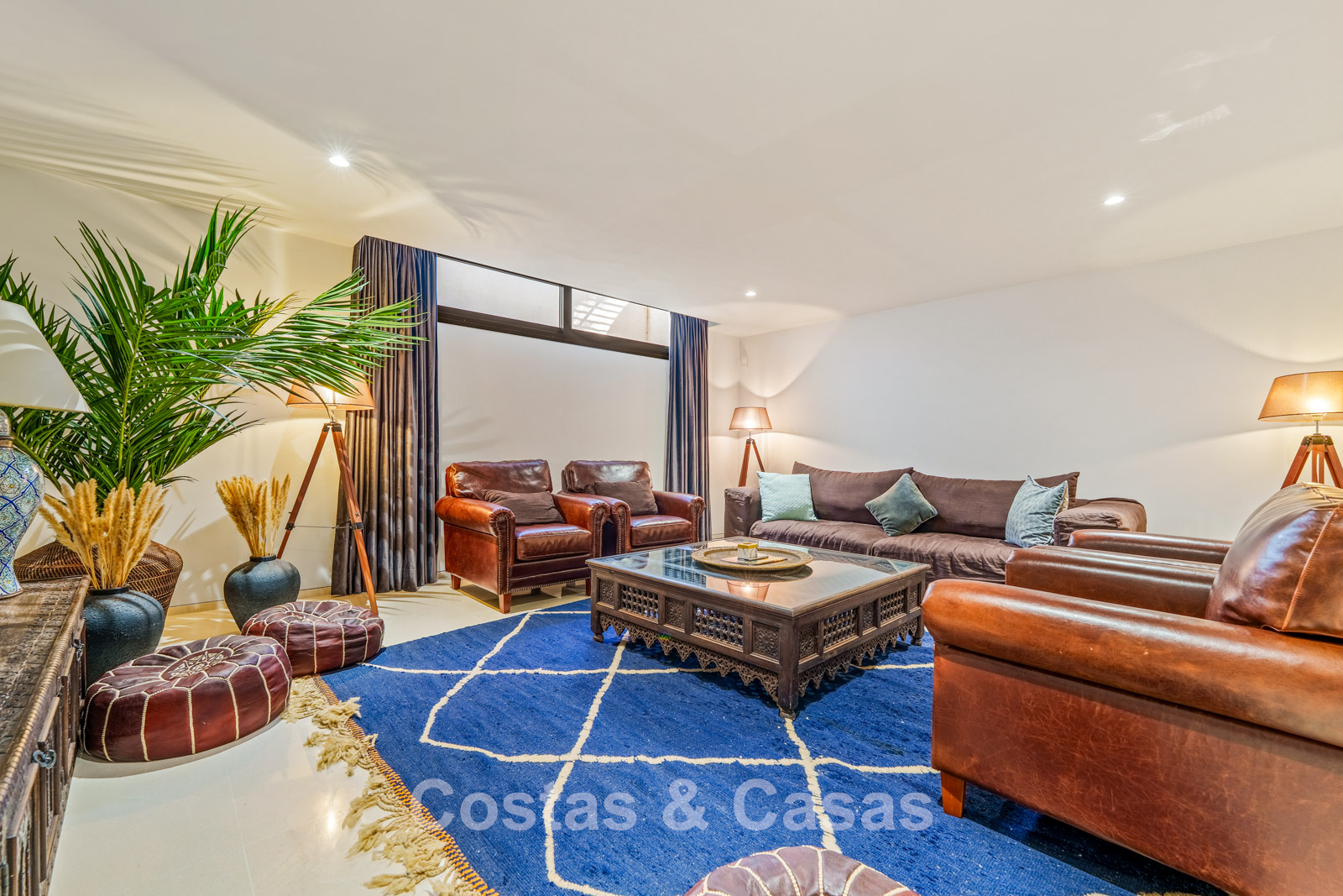 Detached villa with contemporary and minimalist architecture. High-quality finishes using natural materials such as stone, wood and luxurious textiles. Large floor-to-ceiling sliding glass doors seamlessly connect indoor and outdoor living spaces. Atmospheric living room with designer furniture, warm lighting and refined detailing. A modern, fully equipped open-plan kitchen flowing naturally into the dining area. Six spacious bedrooms, each with its own luxurious en-suite bathroom. Equipped with a private gym and a luxury TV lounge with leather sofas. Practical utility room and additional storage space. Private garage and additional on-site parking for a total of two vehicles.