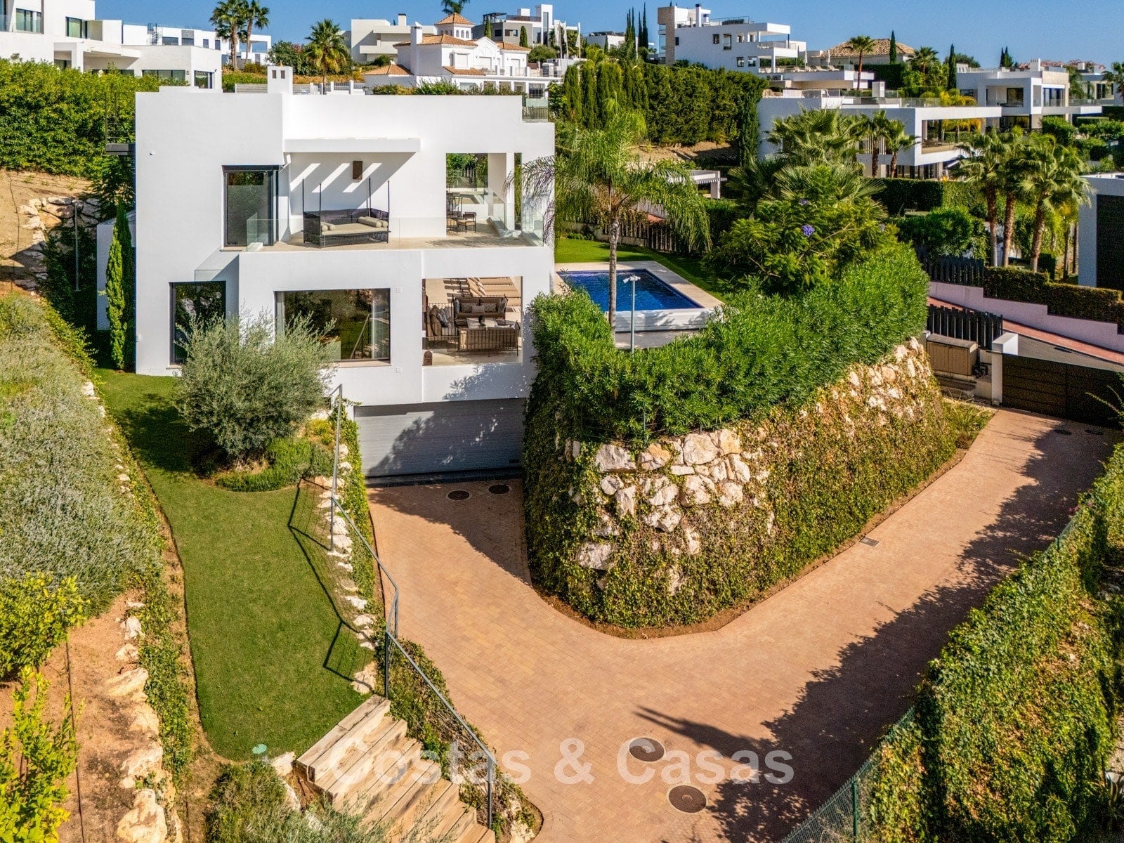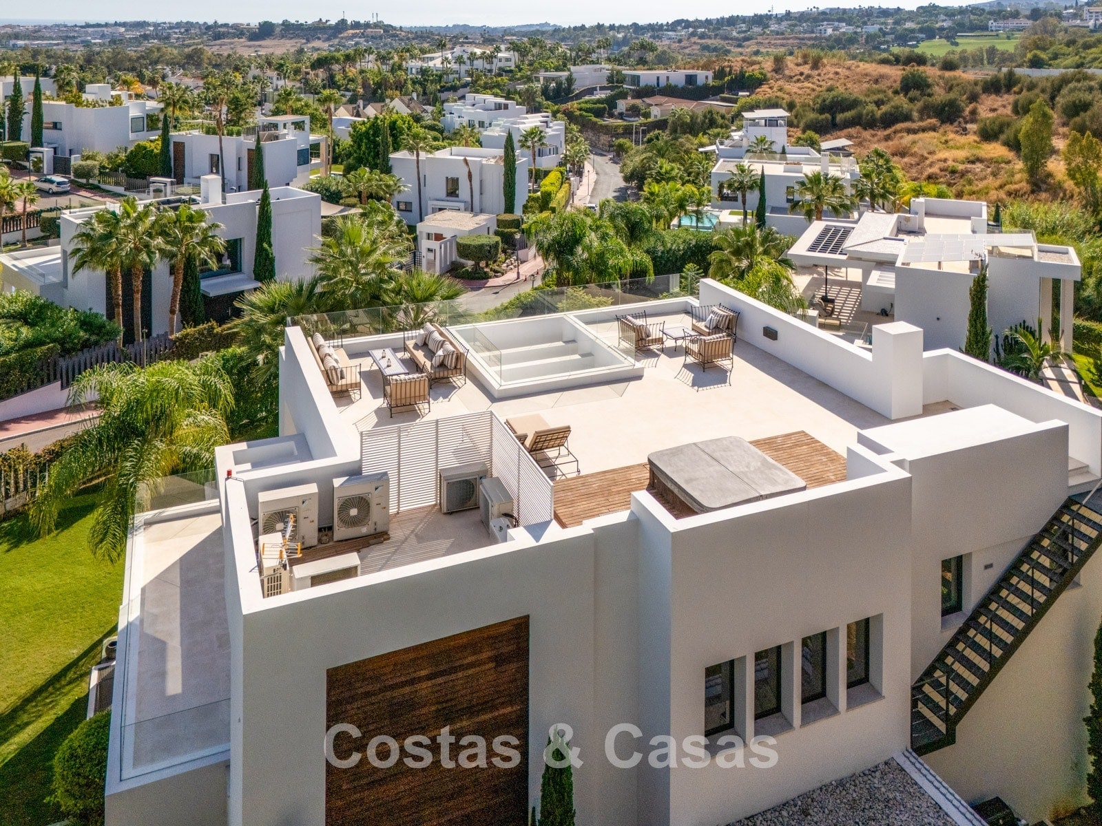 Situated in a highly sought-after residential area in the Golf Valley of Nueva Andalucía. Within walking or buggy distance of the renowned Los Naranjos Golf Club. The green and peaceful surroundings provide access to several exclusive golf courses, including Aloha Golf Club and Real Club de Golf Las Brisas, with all their associated facilities. Just 5 minutes’ drive from the beach and the stylish Puerto Banús, and 10 minutes from the centre of Marbella. The property is located in a neighbourhood of similar contemporary villas with a modern aesthetic.