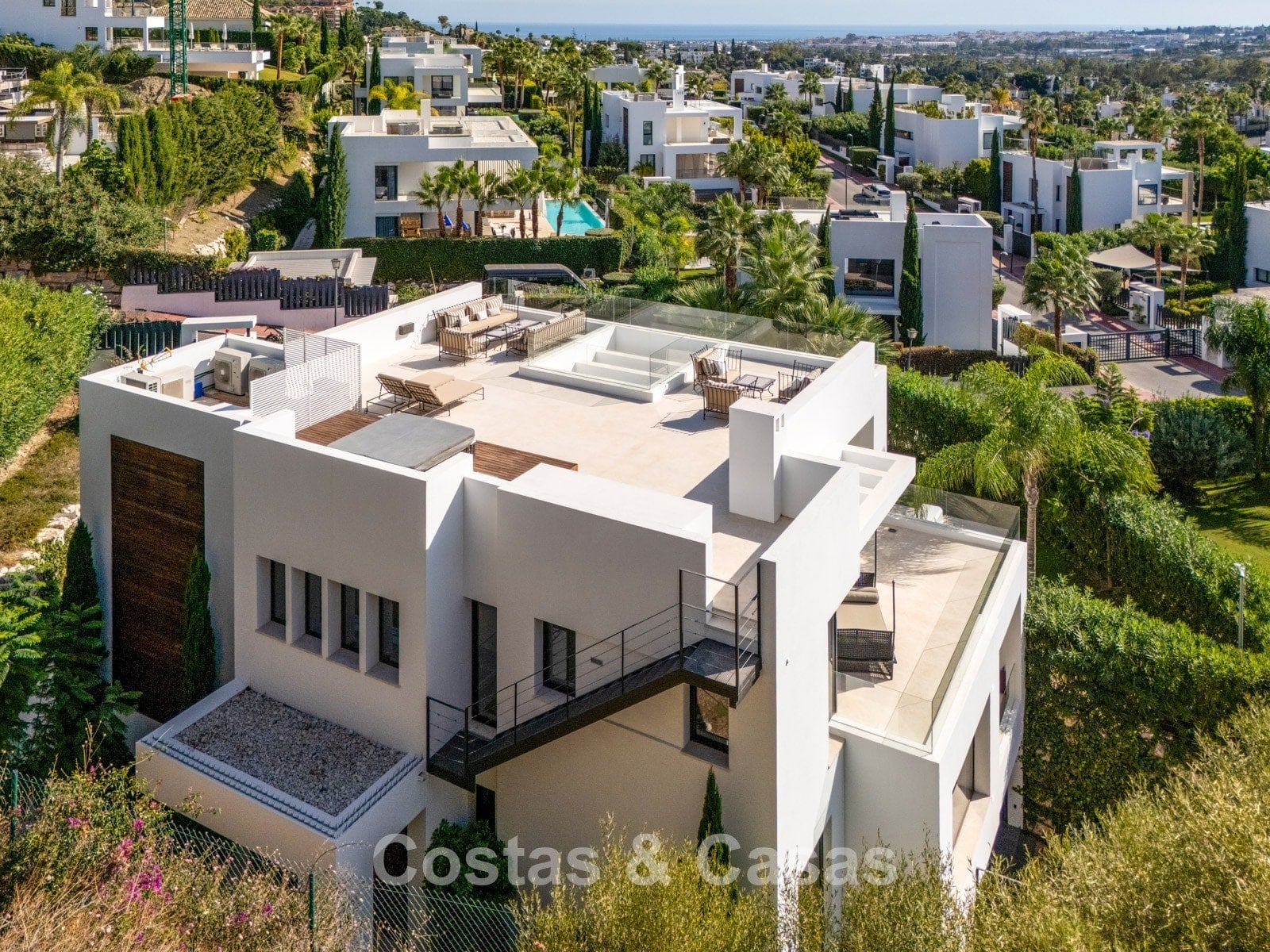 Plot: 1,443 m² Built area: 493 m² Covered terraces: 204 m² Bedrooms: 6 Bathrooms: 6 Guest toilet 3 floors + rooftop terrace