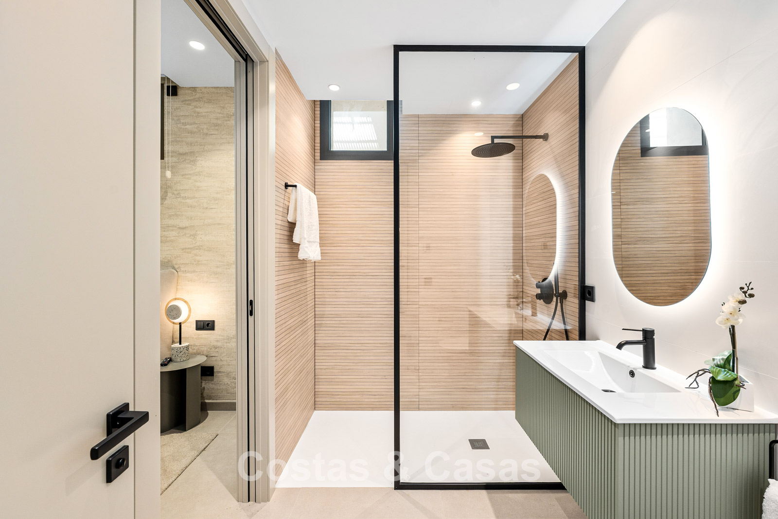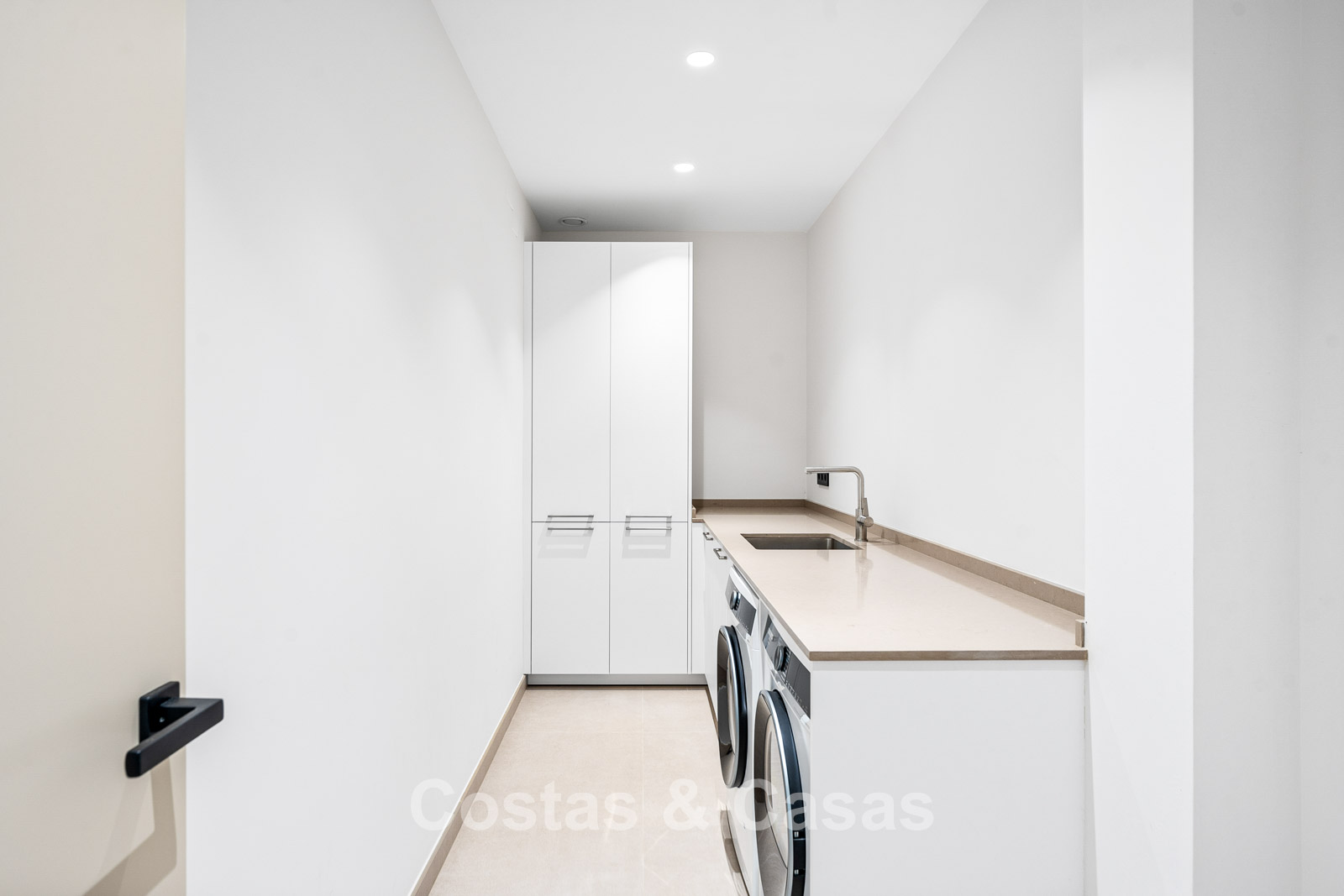 Detached newly built villa in a contemporary architectural style. Warmly decorated with a neutral colour palette. Room-high sliding windows in the villa also make for very bright rooms. A motorised gate at the entrance to the house leads to the indoor garage. Walking in, you immediately enter the large, open-plan living space. Large open-plan living area with TV lounge, integrated dining area and kitchen. Open kitchen, complete with Siemens appliances and a kitchen island with breakfast bar. A total of 4 bedrooms, 4 bathrooms. Downstairs entertainment room with pool table, bodega and TV lounge. Equipped gym. Laundry room. Indoor garage for 2 cars.