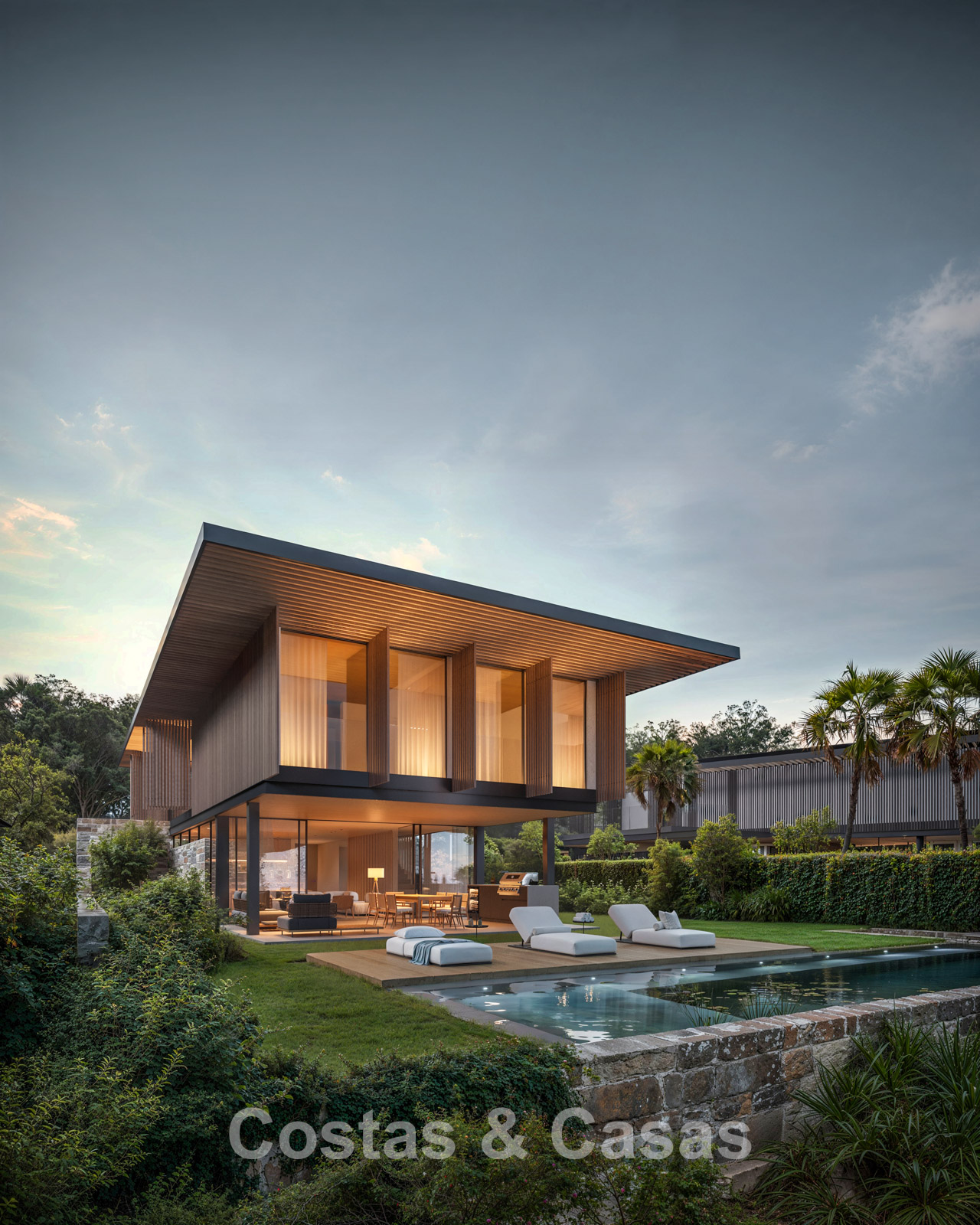 Detached new-build villa with a sleek, architectural design. Realized using the most advanced construction technologies and high-quality materials, where innovation and luxury come together seamlessly. The interior exudes modern, minimalist luxury with warm, natural materials and refined designer furniture. Large glass sections create a seamless connection between inside and outside, creating a serene and elegant living space. Open plan layout. Sleek designer kitchen with cooking island, Miele appliances and a breakfast bar. Integrated dining area. 4 bedrooms, 5 bathrooms. On the lower floor there is a separate guest house with its own entrance, a home cinema and a fully equipped gym. Quality tiled floors. Fitted laundry room. Storage room. Technical room. Indoor garage for 2 cars.