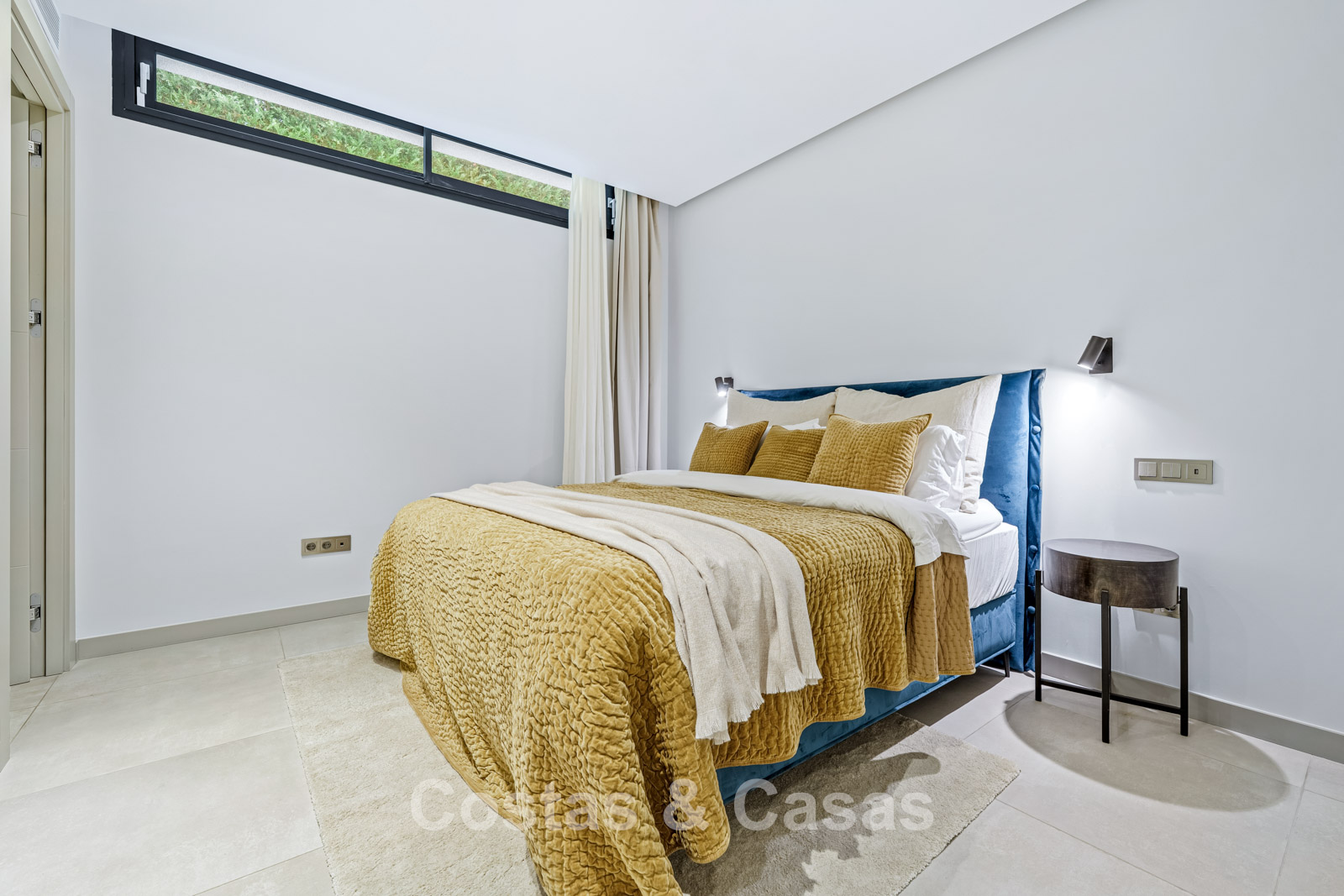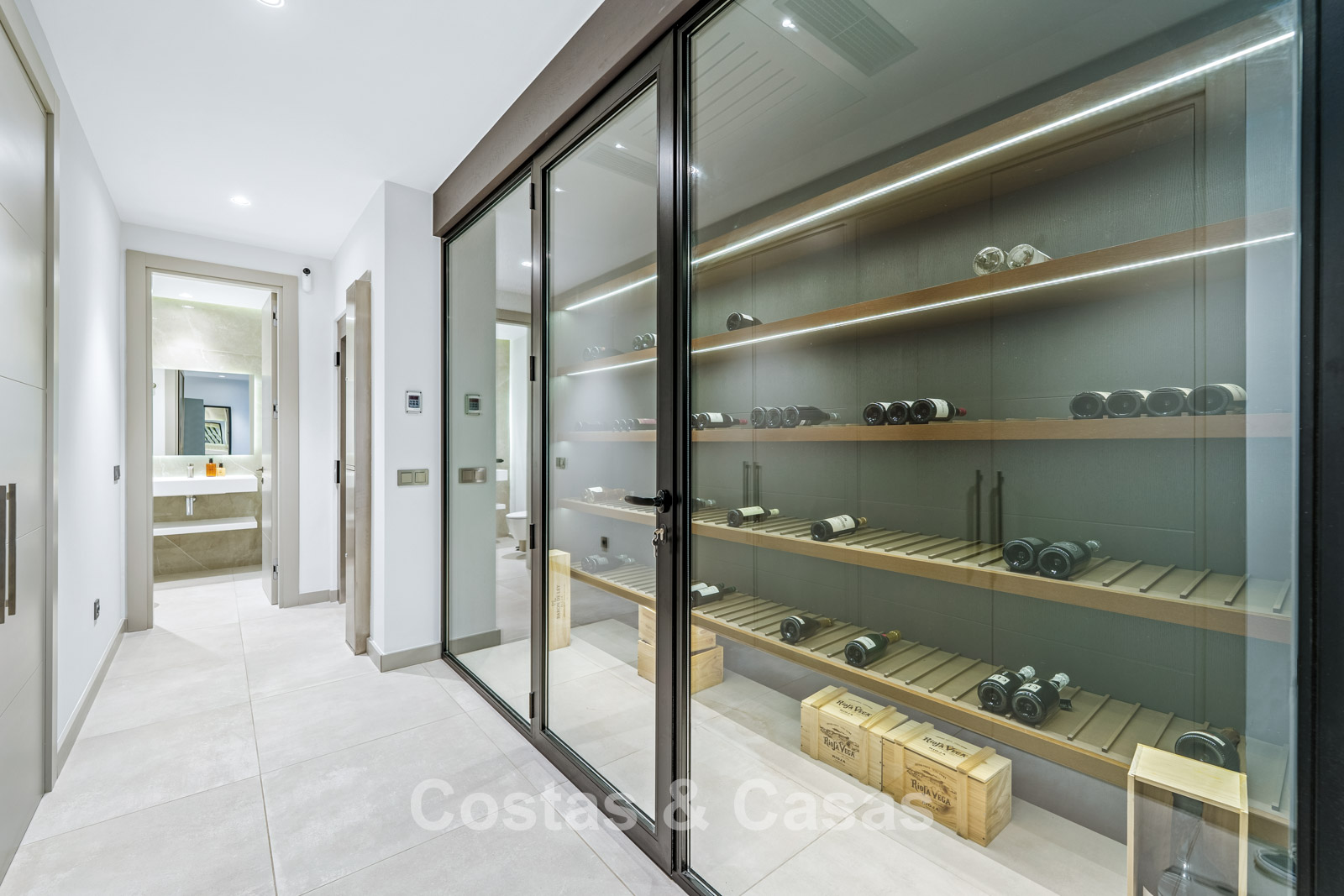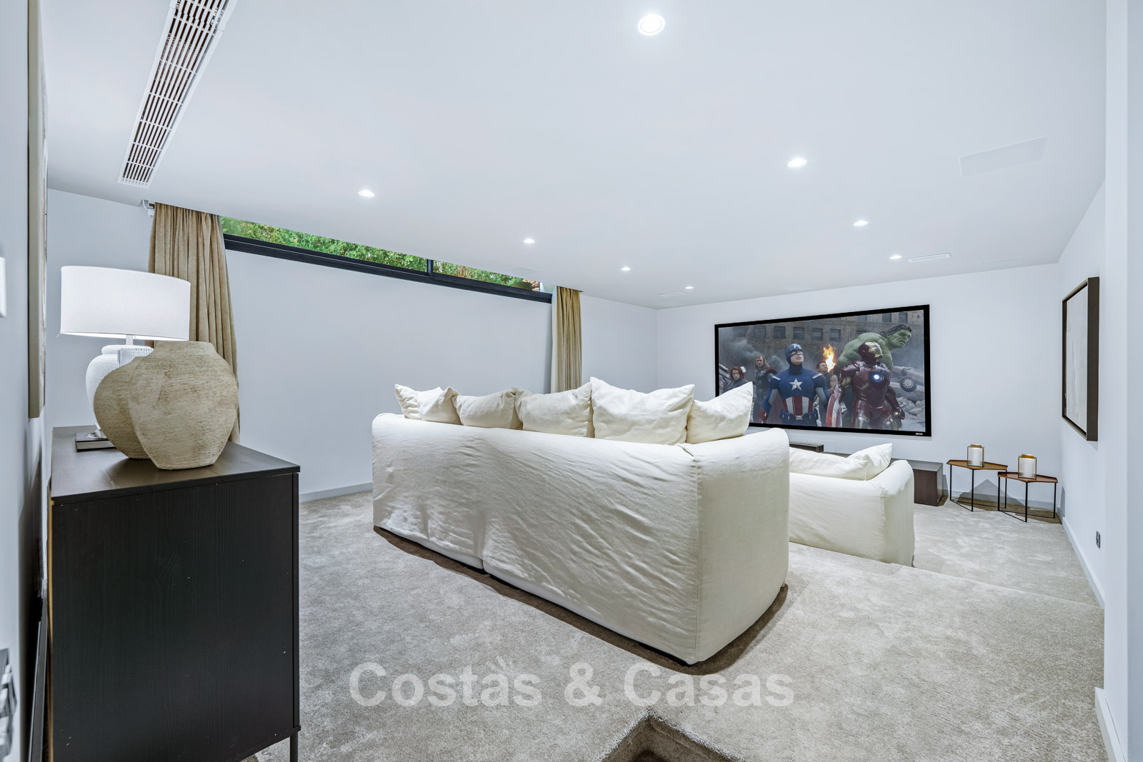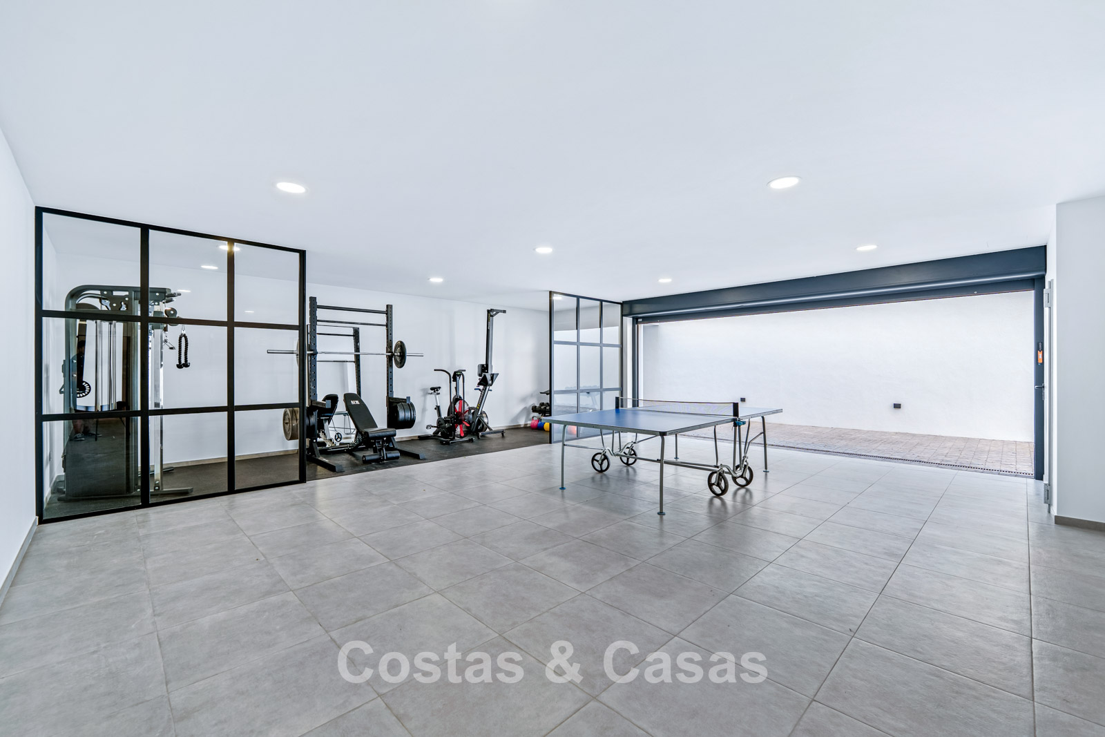 Modern, detached villa recently built in 2020. High level of finishing with attention to detail and luxurious finishes. Elegant, modernist interior design. Open-plan living space with lounge and kitchen area. Open living kitchen, fully equipped with Miele appliances and a central island where you can sit. Integrated dining room. 5 bedrooms, 5 bathrooms. On the residential ground floor a bodega, home cinema, sauna, steam shower and equipped gym. Indoor garage for 2 cars.