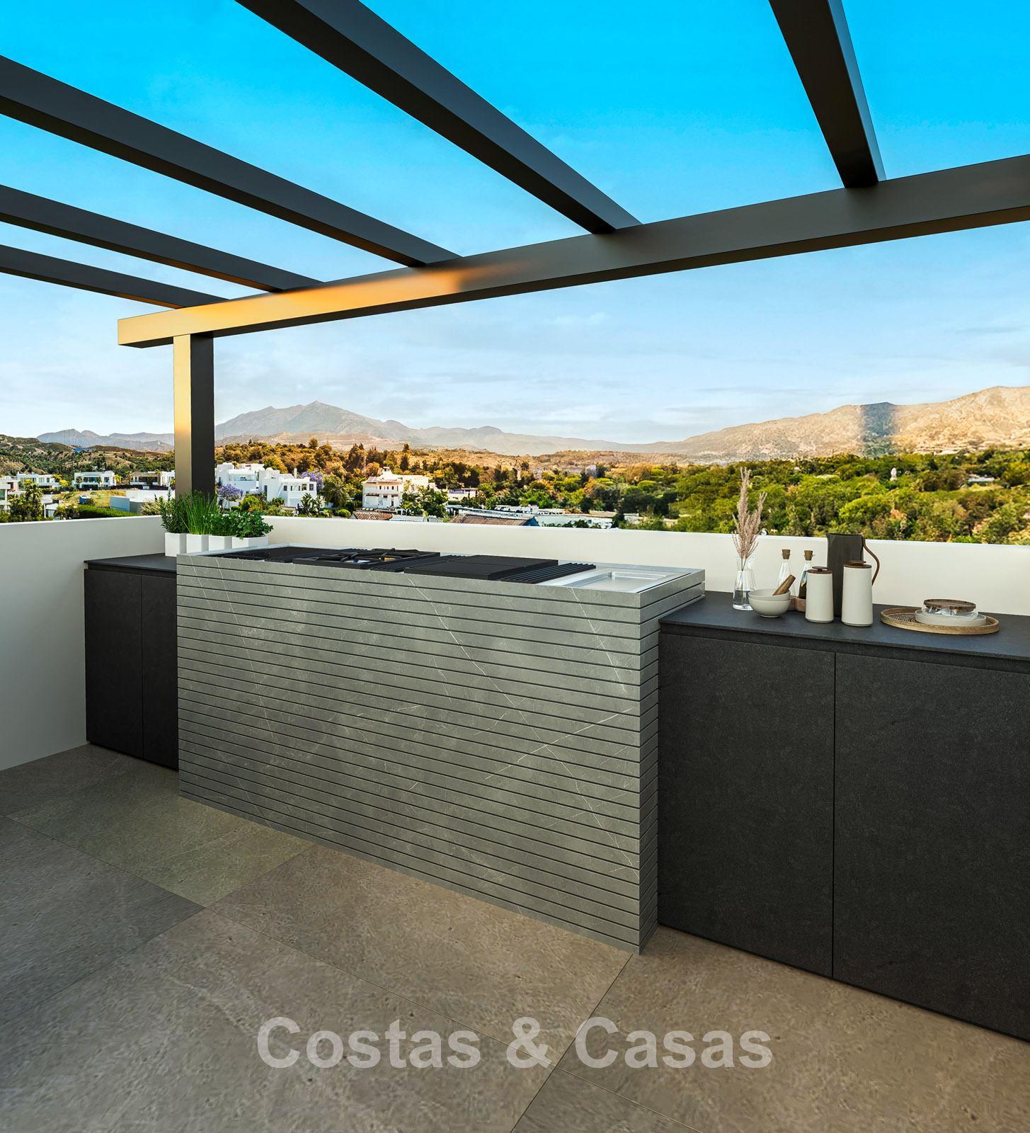 Expansive roof terrace with outdoor kitchen.