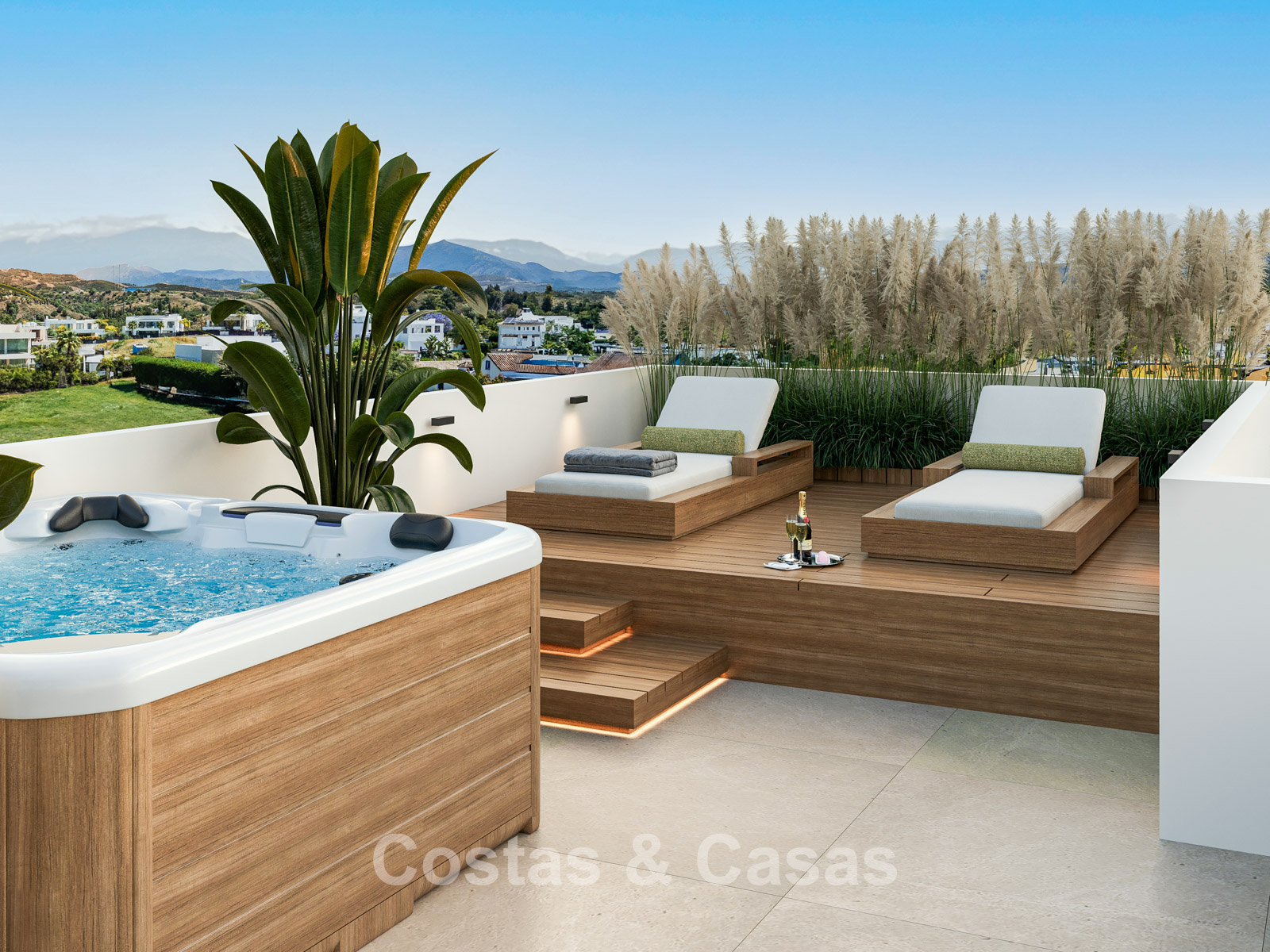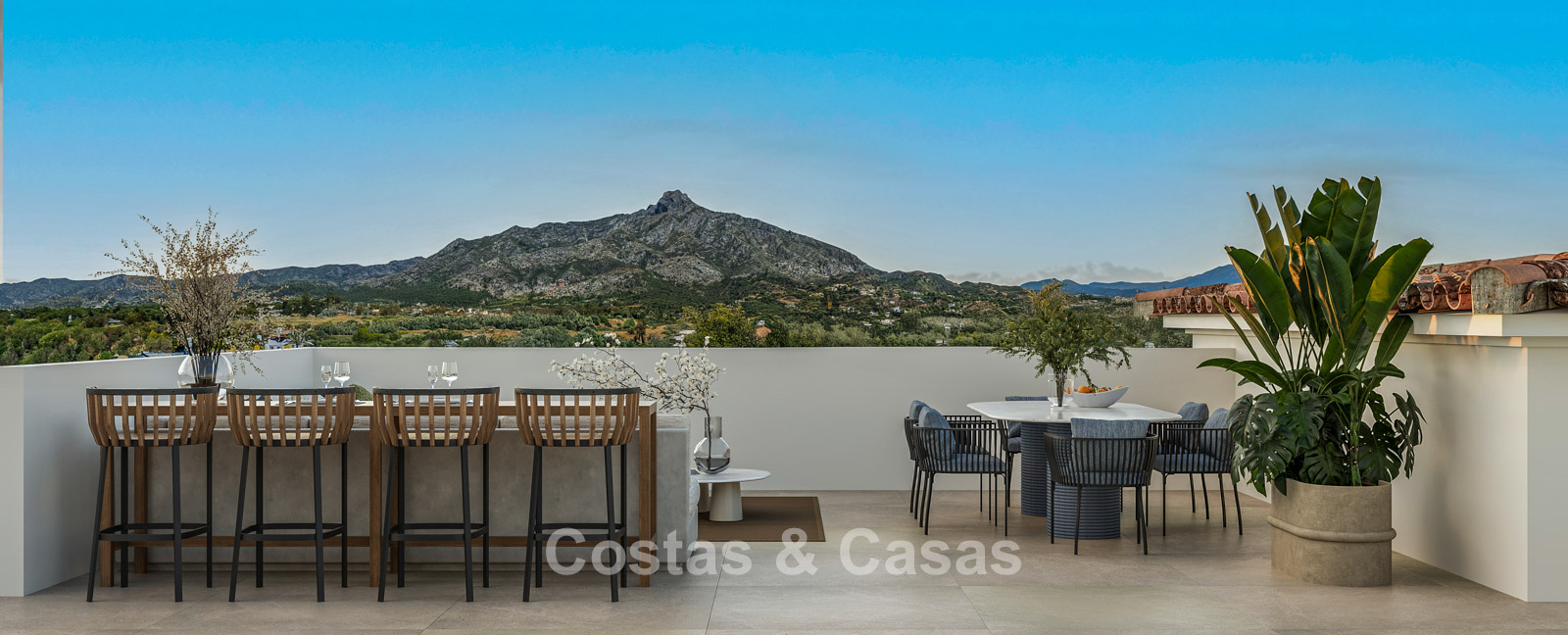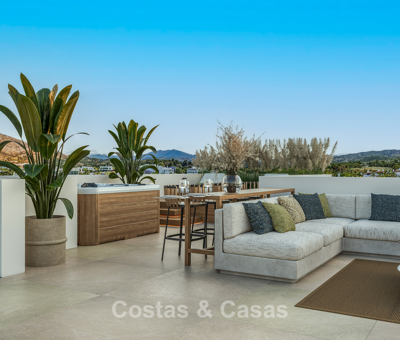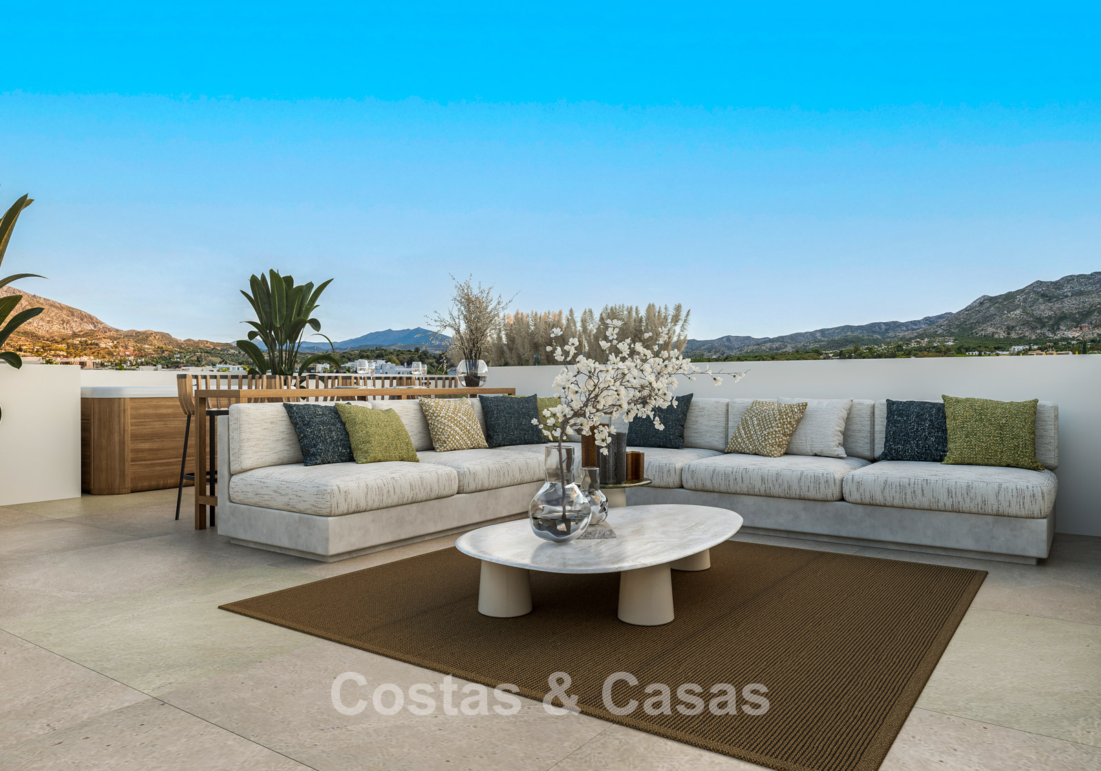 Spacious 1,000m² plot, surrounded by tall plantings. High-quality landscaping with Mediterranean evergreens and lawn, in keeping with the surroundings. A built-in swimming pool with integrated sunbeds and a modern pergola. The sunny terraces offer ample space for comfortable seating and relaxation. The roof terrace is transformed into an oasis of comfort, with a jacuzzi, a high-quality outdoor kitchen, and a spacious area for relaxing and enjoying delicious al fresco dinners. Stunning views of La Concha Mountain and the picturesque surroundings.