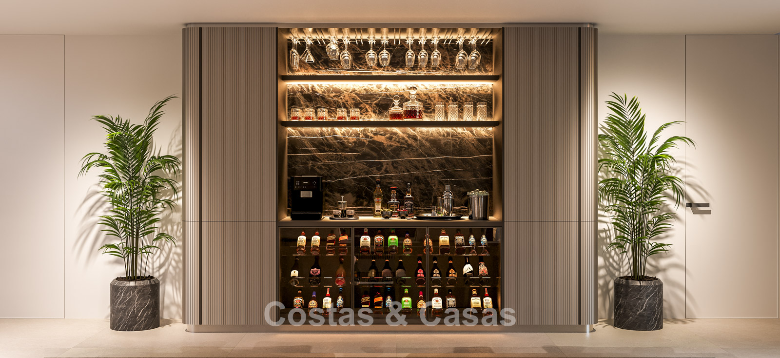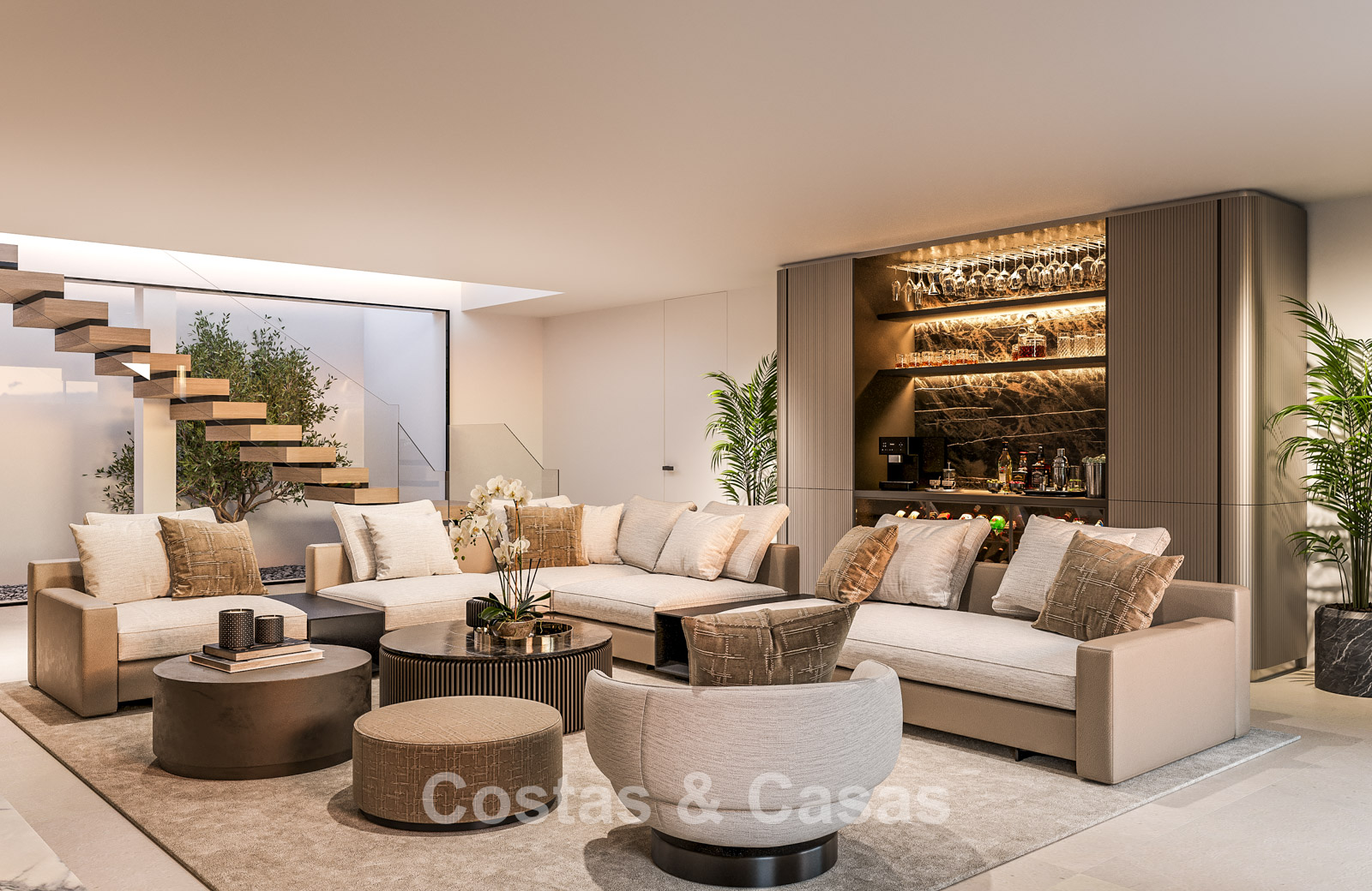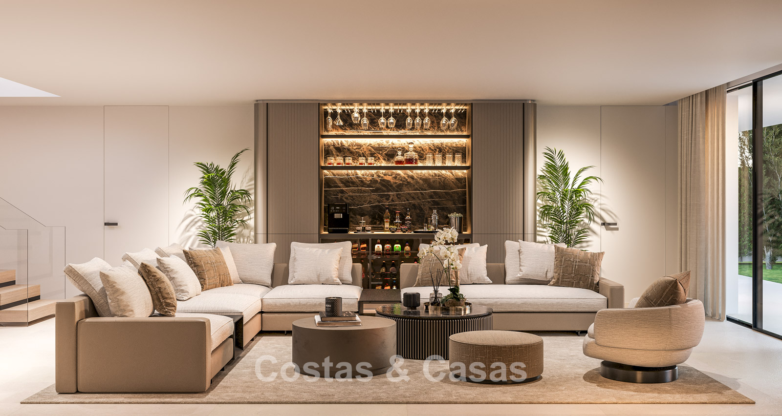 The villa stands out thanks to its contemporary design, which combines minimalist forms with Mediterranean charm. Designed with excellent craftsmanship, sustainable materials, and a bespoke design. The sleek, trendy interior exudes a chic, luxurious aesthetic. Spacious rooms are filled with natural light thanks to floor-to-ceiling windows, with beautiful views of the lush gardens and pool. Open plan living and dining area. The living area also benefits from an extra-high ceiling, ensuring optimal ventilation and a wonderful sense of space, making the interior feel even more luxurious and impressive. The bespoke kitchen is fully equipped with top-of-the-line appliances and features a central island where you can enjoy breakfast. A total of 5 bedrooms, 5 bathrooms, and 2 separate toilets provide additional comfort. Large, high-quality cream-colored floors. On the lower floor, you'll find a multifunctional room with a TV lounge and built-in bar, as well as a relaxing fitness room. Laundry/storage room. Carport for 2 cars.