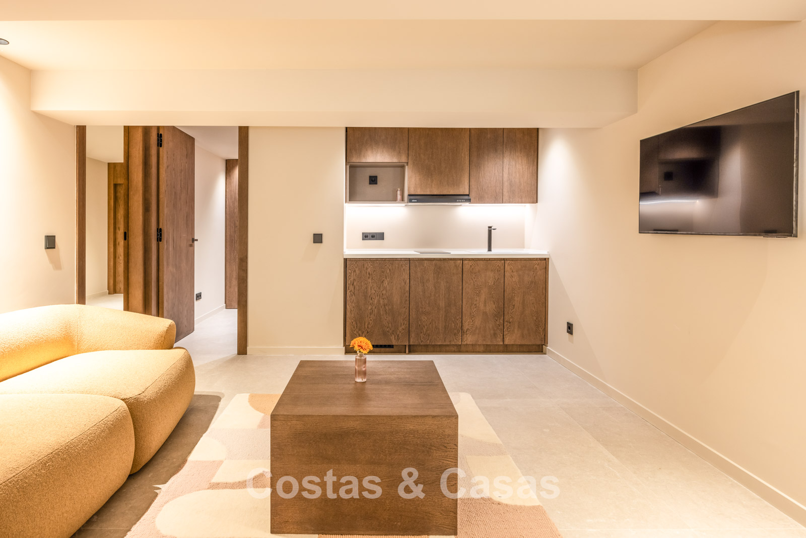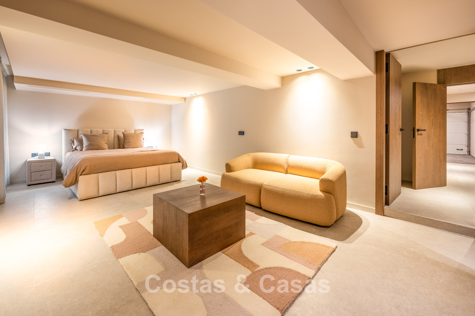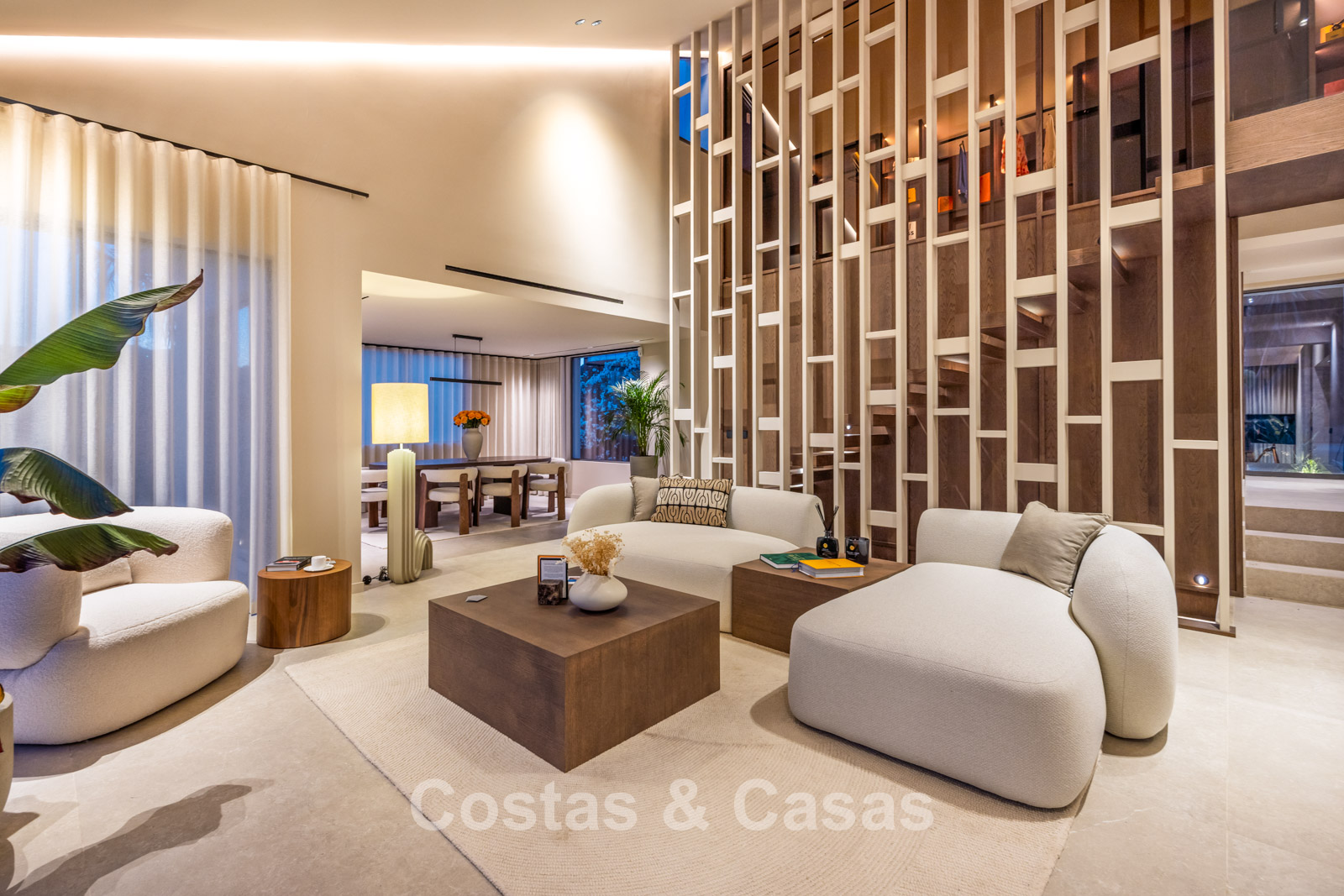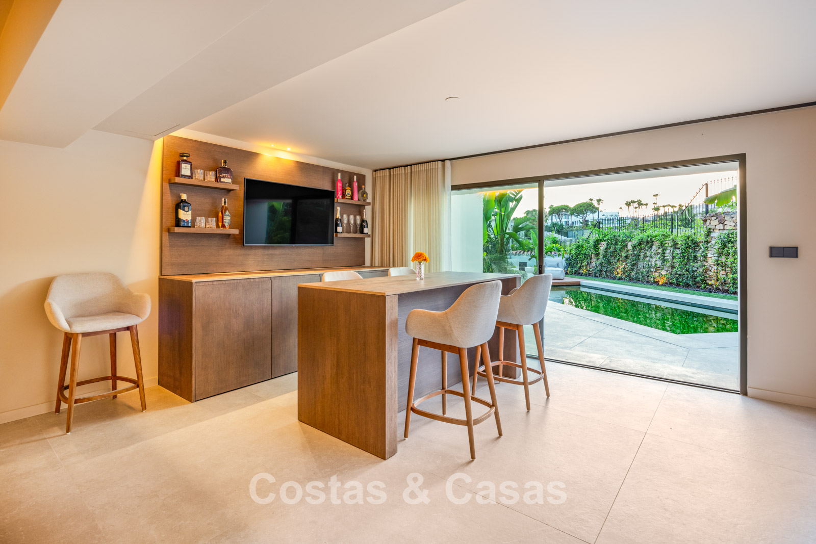The architecture blends sleek contemporary lines with subtle Balinese influences, resulting in a timeless and elegant villa. Constructed using high-quality materials with a strong focus on luxury and comfort. Large sliding windows with recessed frames allow for abundant natural light and create a seamless connection between indoor and outdoor living. The warm, on-trend interior exudes chic luxury design, featuring refined materials and subtle detailing. A bespoke kitchen with floor-to-ceiling cabinetry, premium appliances and a central island complete with stylish bar stools. Adjoining this is an inviting TV lounge with a double-height ceiling, followed by a dining area. 5 bedrooms, 6 bathrooms. On the lower ground floor, there is a stylish bar and additional rooms that can be customised to suit your needs, such as a gym, home cinema, office or wellness area. Self-contained guest accommodation with private kitchenette and living area. Elegant porcelain tiled flooring. Fully equipped laundry room. Integrated garage.
