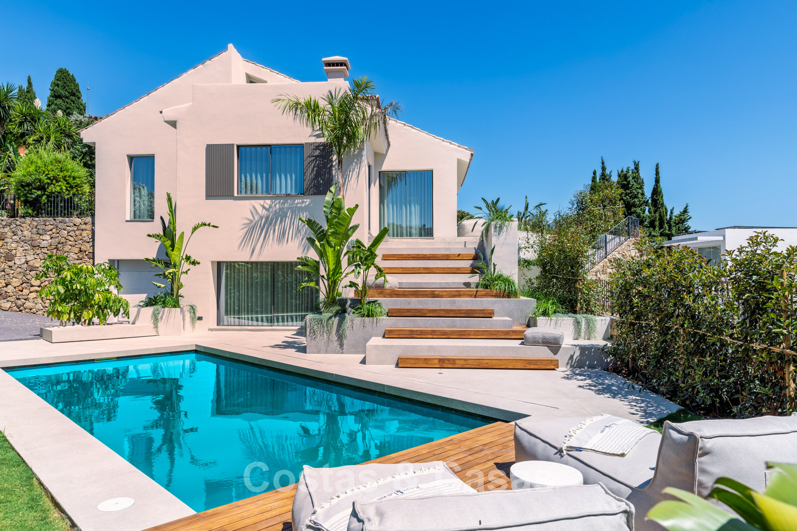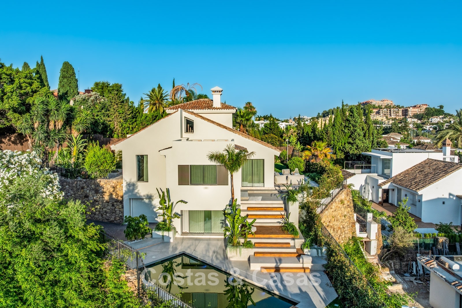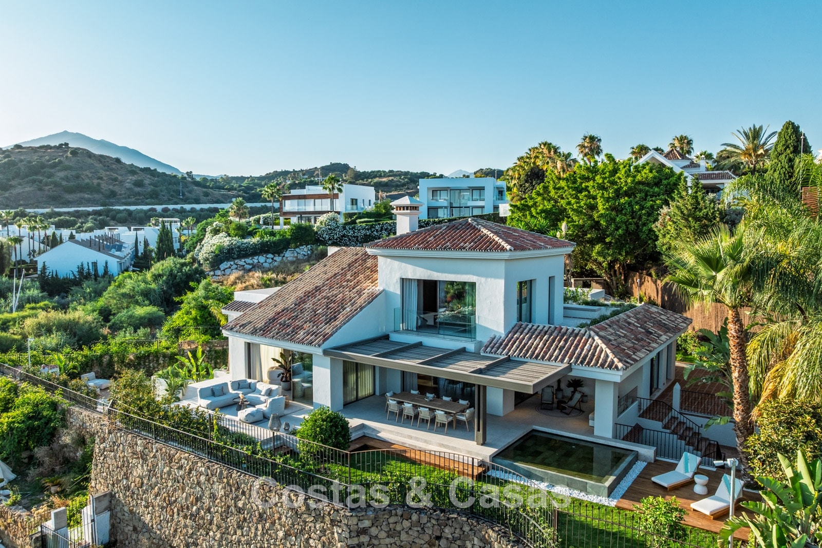 Set on a gated plot in an elevated position. Beautifully landscaped Mediterranean garden. Private swimming pool with lounge areas. Views over the garden, lush surroundings and the golf courses.