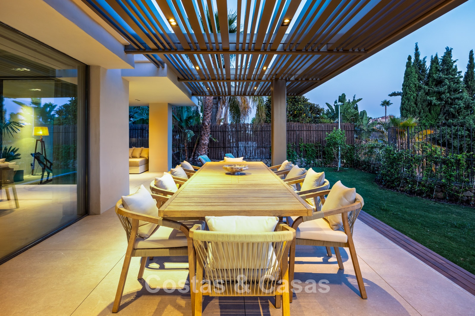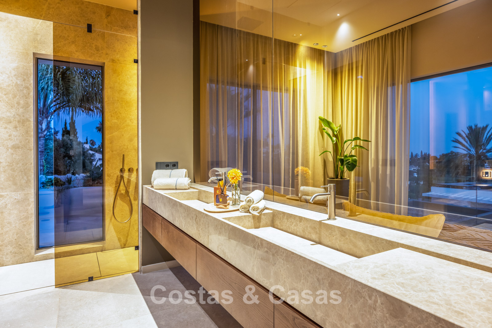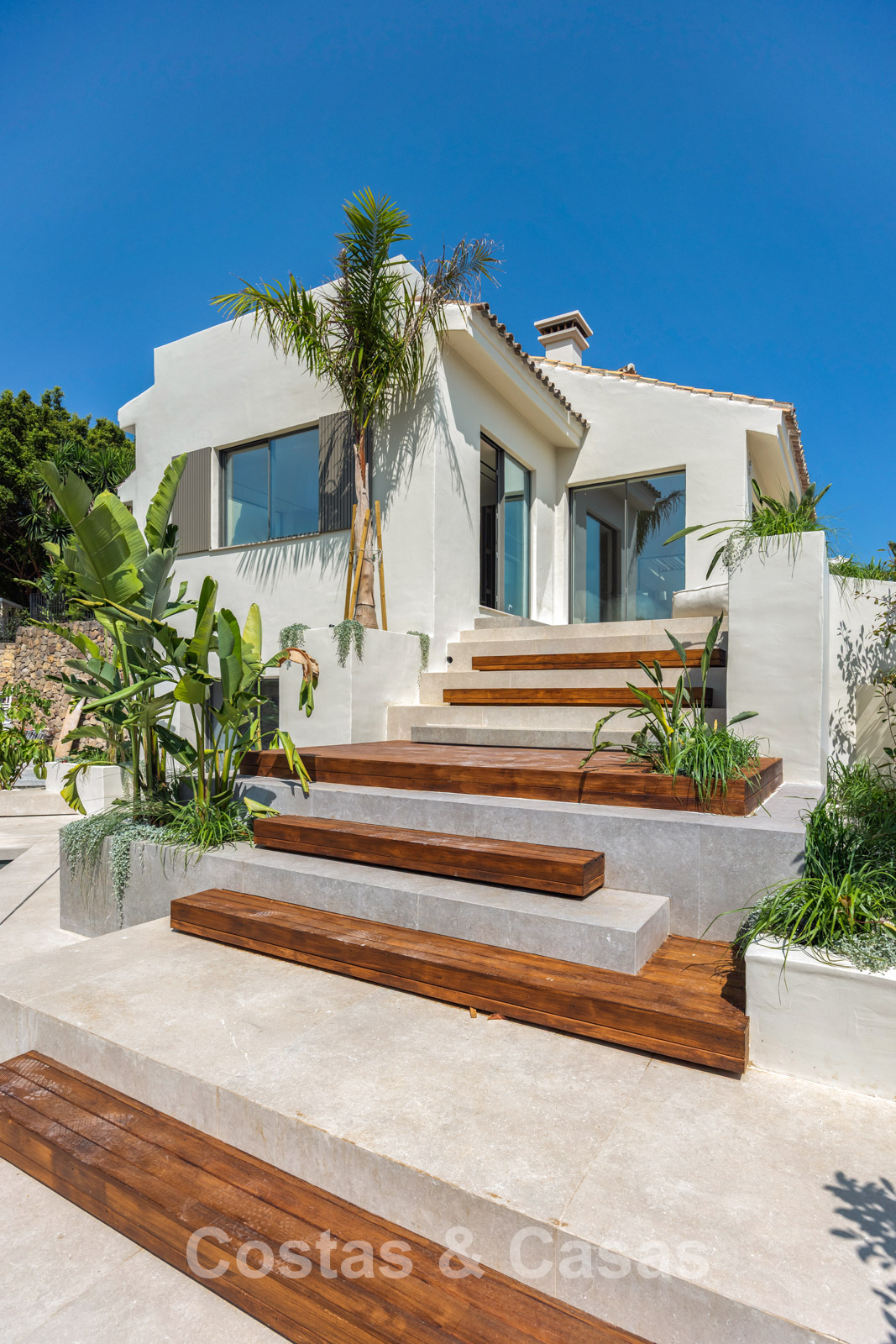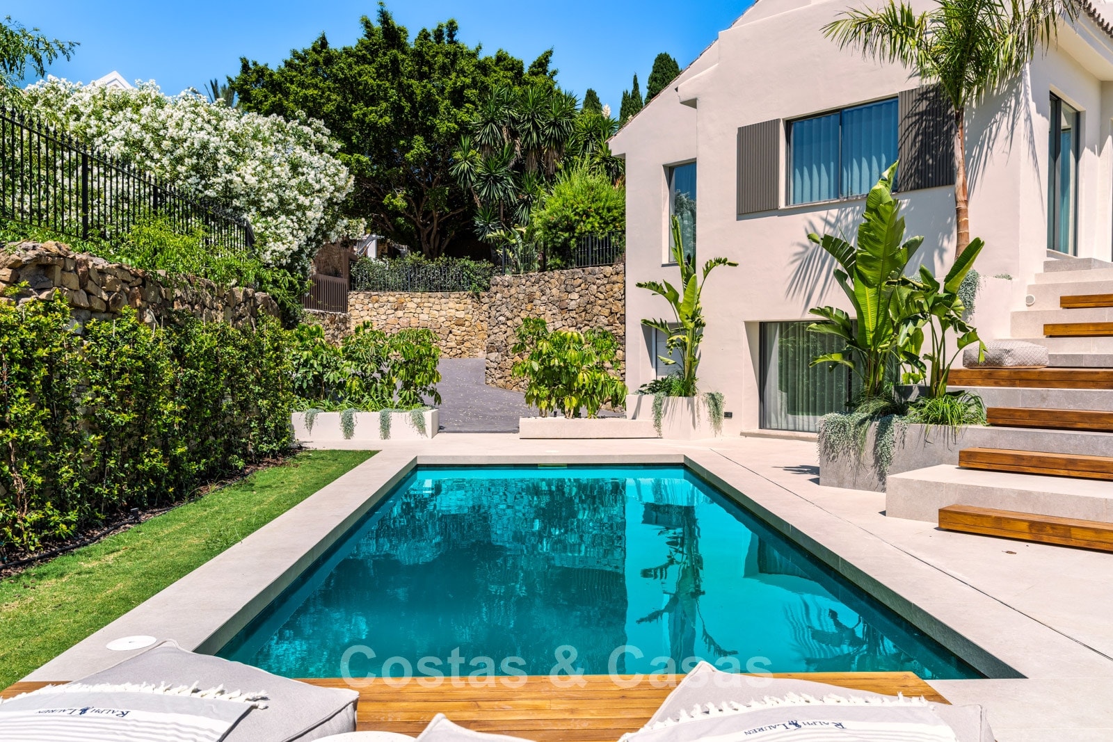 Set on a gated plot in an elevated position. Beautifully landscaped Mediterranean garden. Private swimming pool with lounge areas. Views over the garden, lush surroundings and the golf courses.