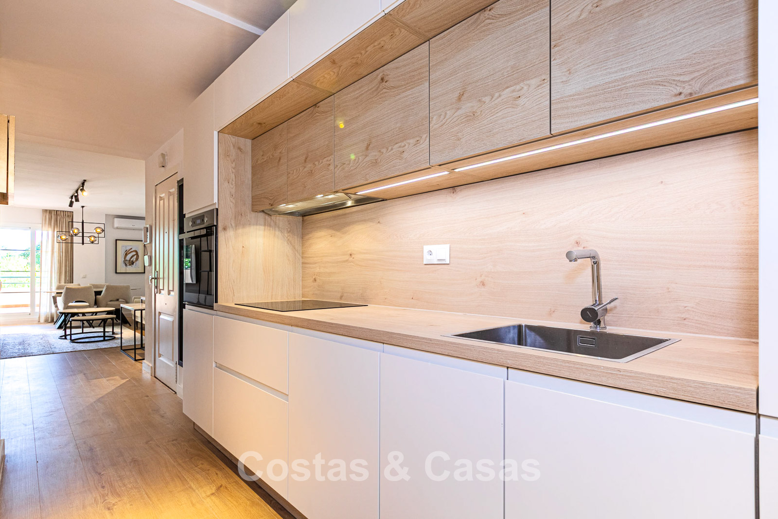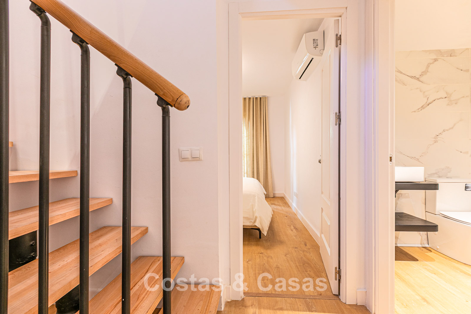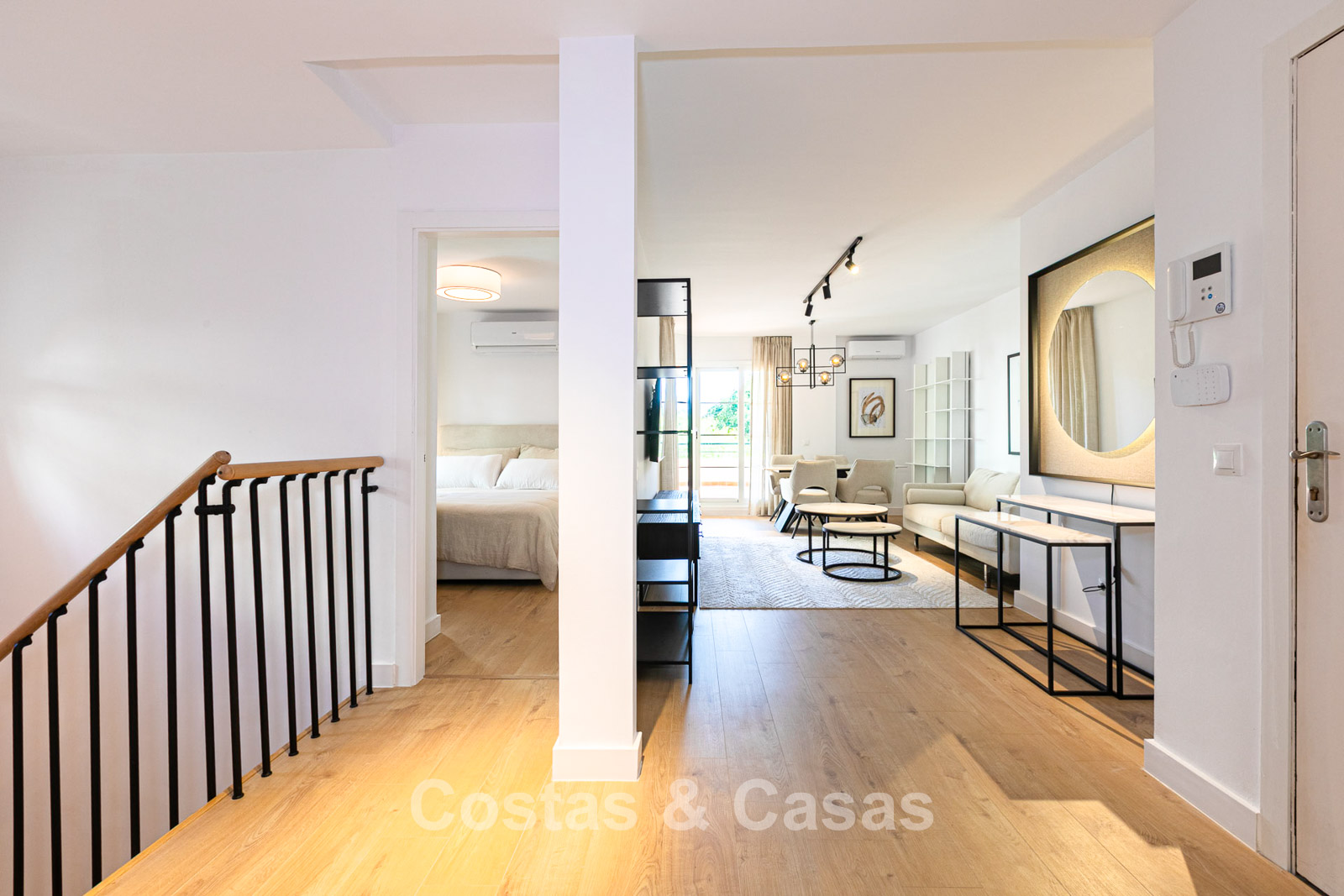 Modern duplex corner apartment, fully refurbished and move-in ready. High-quality materials have been used, with great attention to detail and refined finishing. Several sunny and partly covered terraces offer a delightful outdoor space to enjoy year-round. The corner position and large sliding windows create a seamless flow between the indoor and outdoor spaces and provide abundant natural daylight. Open-plan living area with lounge and dining section. The kitchen is modern and bright, featuring built-in appliances, warm wood accents and a minimalist finish that blends seamlessly into the open living area. Adjacent to the kitchen is a terrace with space for a utility area. Three luxuriously furnished bedrooms and two shared bathrooms. (Three-bedroom apartments in this complex are all duplex units and rare.) The front bedroom has access to the main terrace, while the rear bedroom has its own private terrace. The third bedroom and bathroom are located downstairs and have a spacious private terrace. Wood-effect floor tiles. Large private storage room. Double parking space.