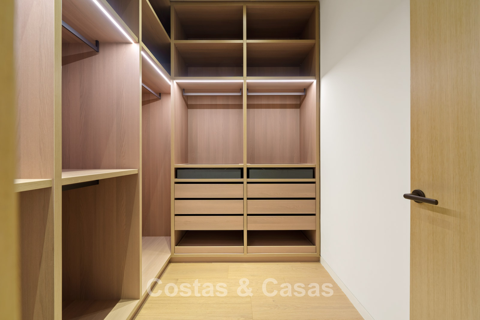 New, detached villa with state-of-the-art architecture. Using the most advanced technologies. An open and sophisticated interior design, with natural building elements always providing a creative look. The interior is in complete harmony with the outdoor areas, thanks to the room-high sliding windows that can be fully opened. Carport for 3 cars. Covered entrance embellished with a magnificent bonsai tree. 2 guest toilets. Spacious, open living space with cosy TV lounge with open fireplace. Across a central partition, a 2nd lounge, with the dining room, seamlessly connects to the terrace. Chic kitchen, fully equipped with quality appliances and an island with a natural stone breakfast bar. Cream-coloured tiled floors for inside and outside. 6 Bedrooms and 7 bathrooms. Master bedroom en-suite with bespoke walk-in wardrobe and private terrace, equipped with a Jacuzzi. Lower floor: