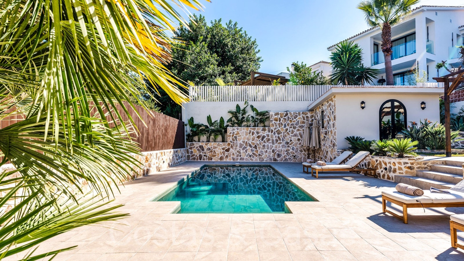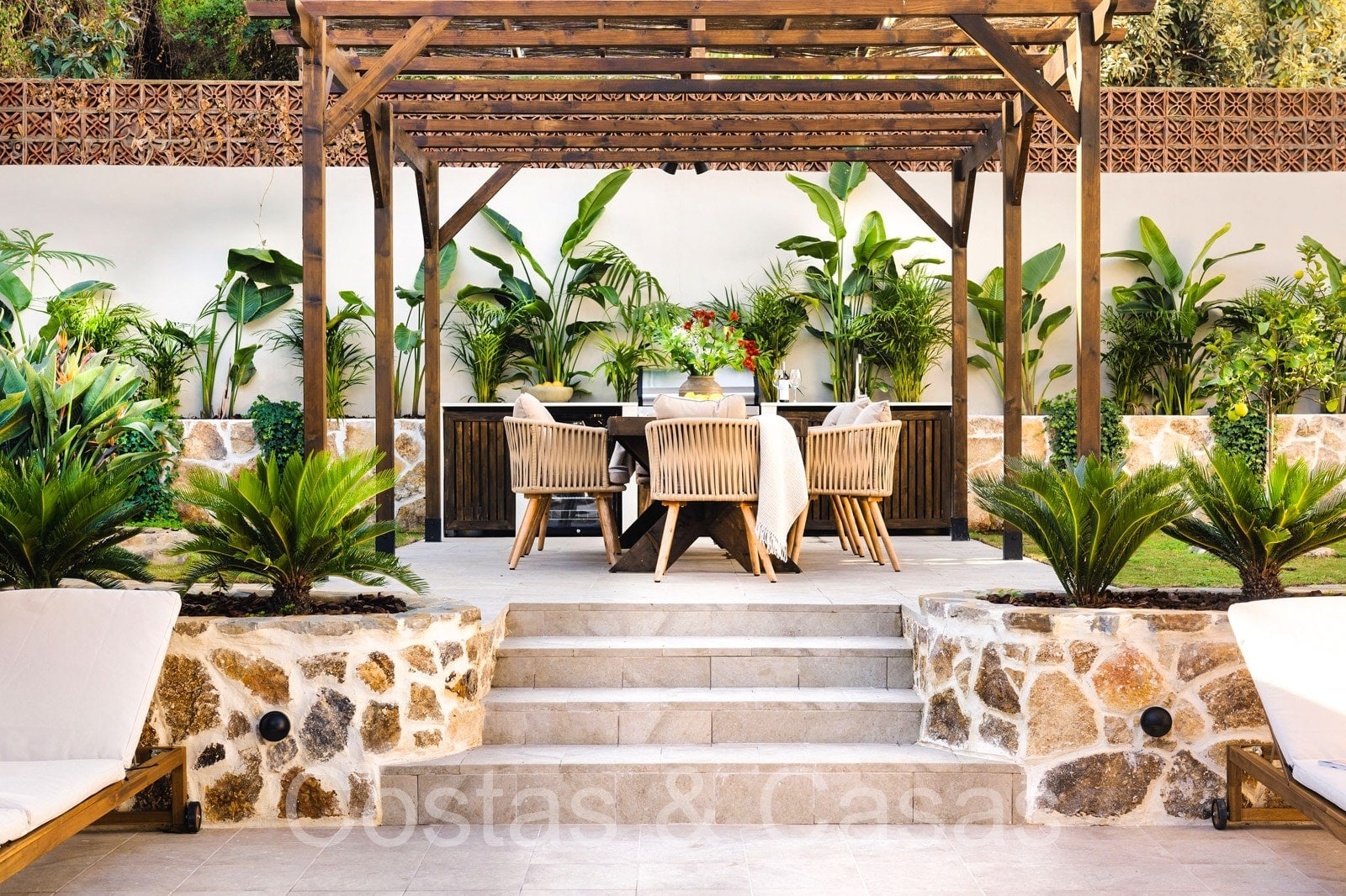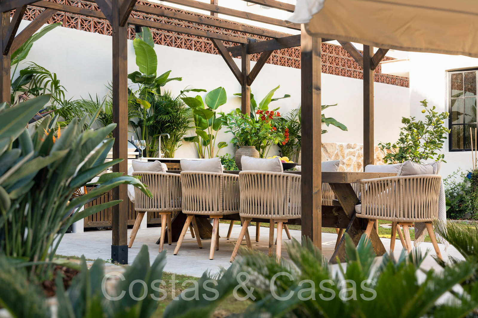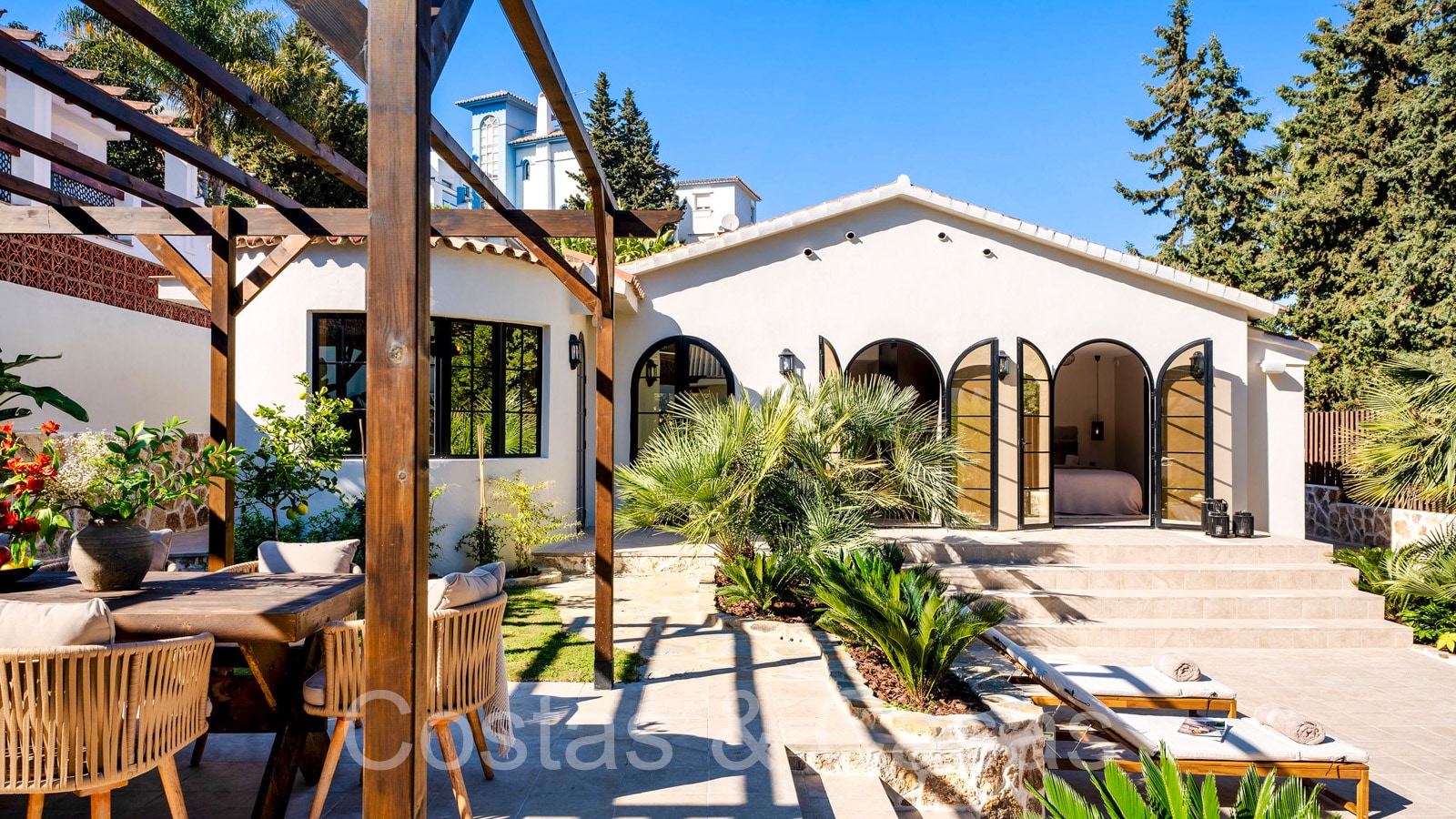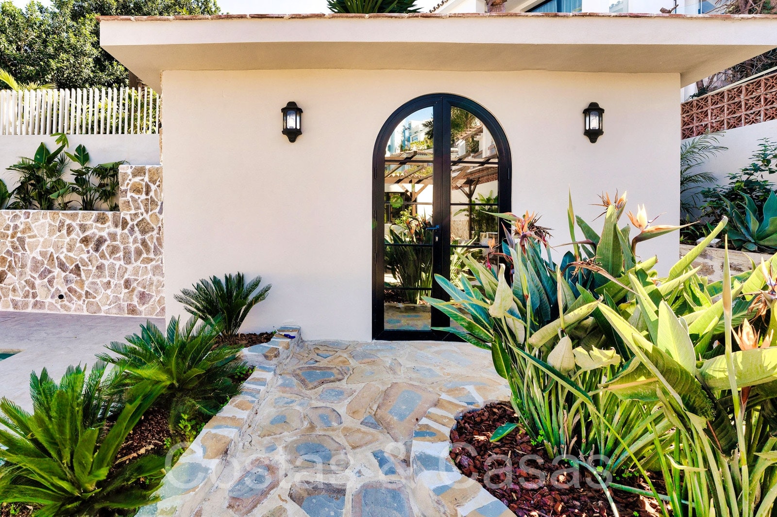 Completely renovated villa with a tropical design. Everything is on one level. Attention to the most detailed level of finishing. Refined and very stylishly furnished. Thanks to large, curved window structures, there is plenty of natural light that brings the interior even more to life. The entrance opens onto the open living space with a cozy lounge. Fully equipped designer kitchen with cooking island and dining table. 3 en-suite bedrooms, 2 with direct access to the inviting outdoor area. An outbuilding will be furnished with a separate guesthouse. Laundry room. Carport for 1 car.